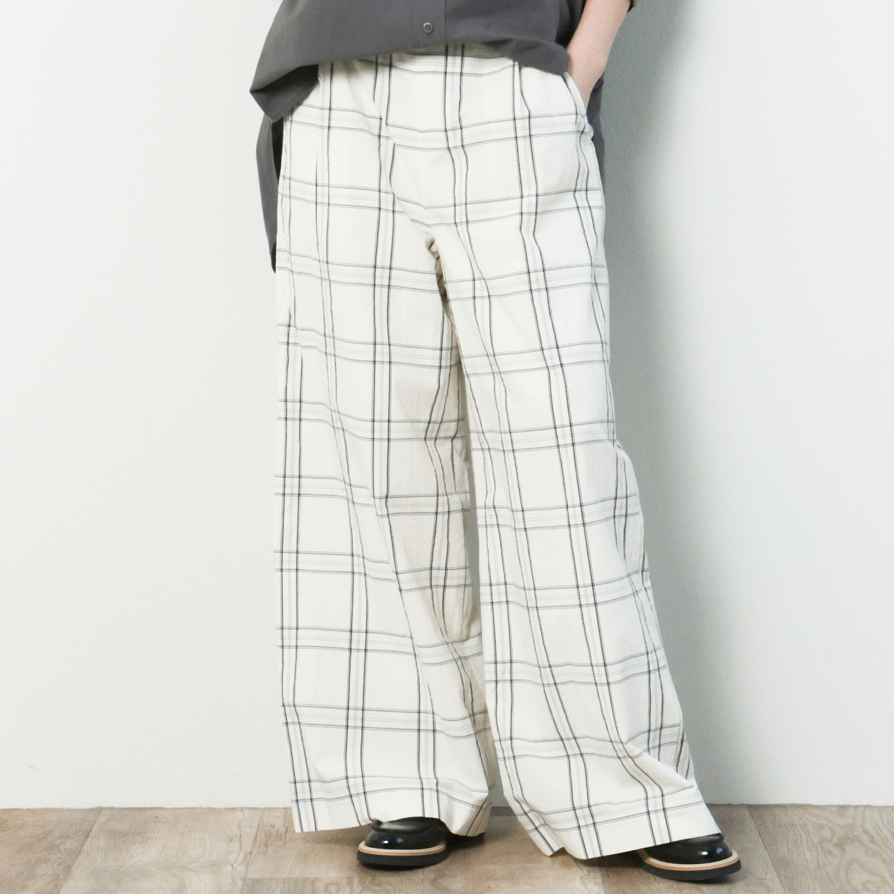 SACRA サクラ レディース パンツ ワイド コットン ワッシャー バックシャーリング チェック 1プリーツ H.COUNT COTTON PLAID PANTS 126102113 ECRU/アイボリー