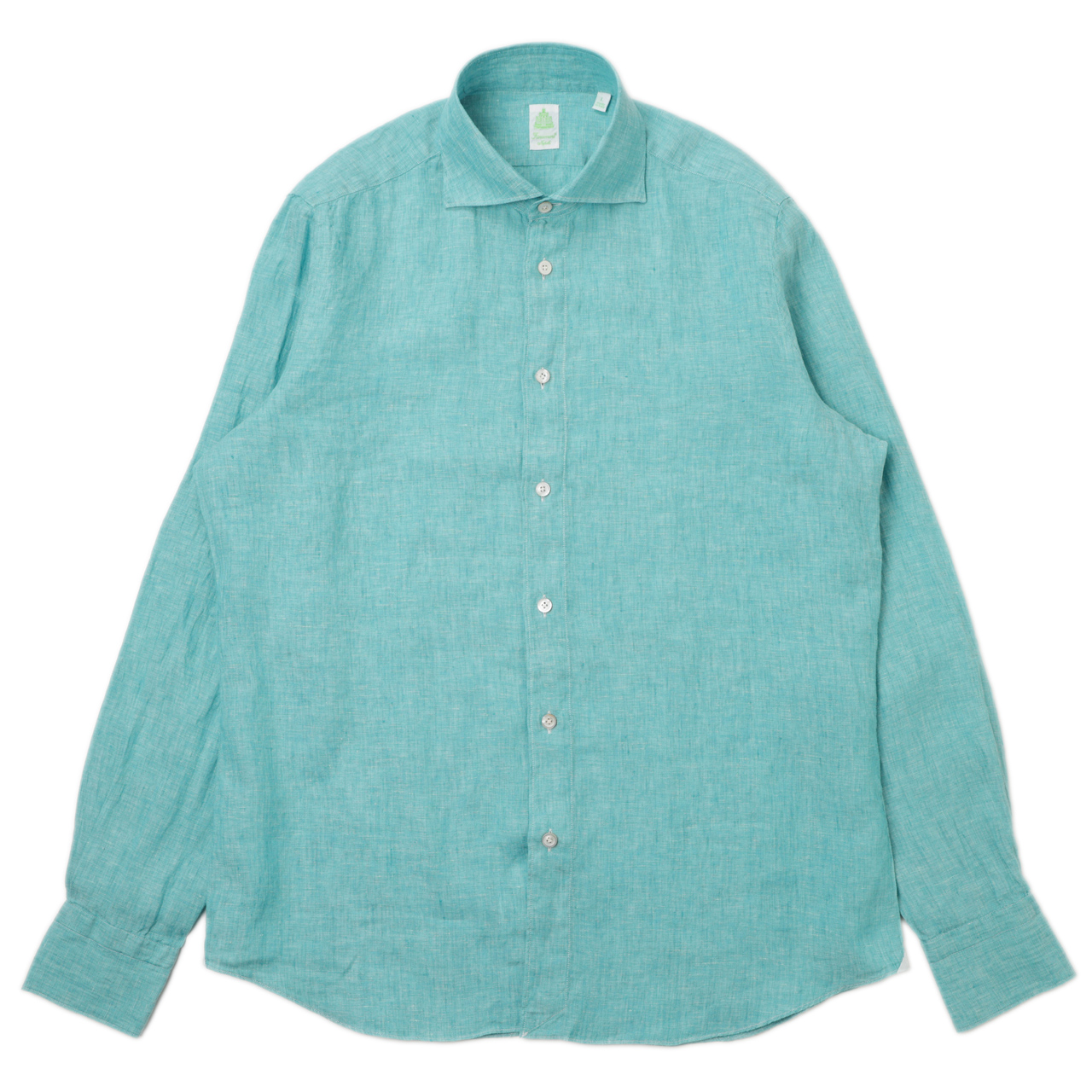 Finamore フィナモレ メンズ シャツ カッタウェイ リネン 麻 SIMONE BALI 長袖 製品洗い 046098 C0650 03/ターコイズ
