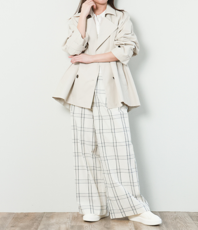 SACRA サクラ レディース パンツ ワイド コットン ワッシャー バックシャーリング チェック 1プリーツ H.COUNT COTTON PLAID PANTS 126102113 ECRU/アイボリー