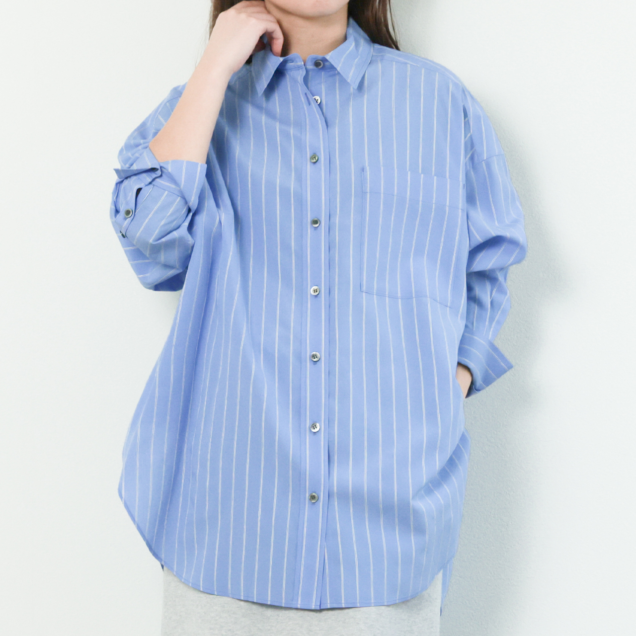 SACRA サクラ レディース シャツ ブラウス レギュラーカラー コットン ストライプ オーバーシルエット ワッシャー ドビー組織 PREMIUM RY/NY STRIPE SHIRT 126110072 SAX/サックスブルー