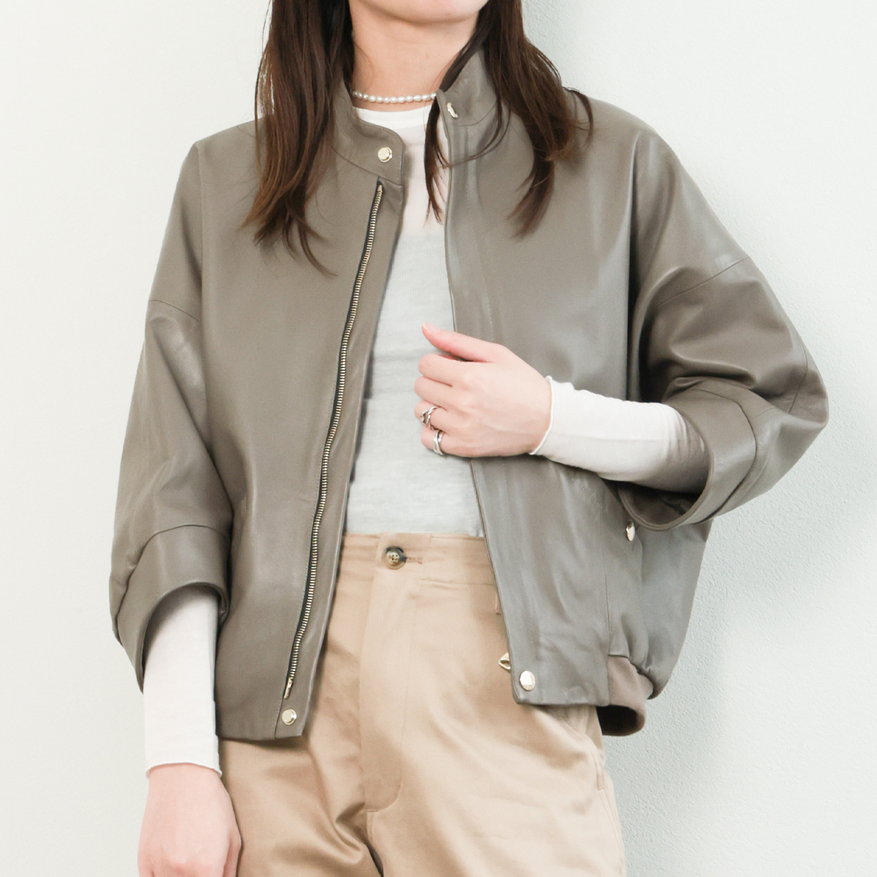 EMMETI エンメティ PAIGE ペイジ レディース ジャケット ブルゾン シングル レザー ラム ナッパシルク ドルマンスリーブ 七分袖 WALNUT/グレージュ