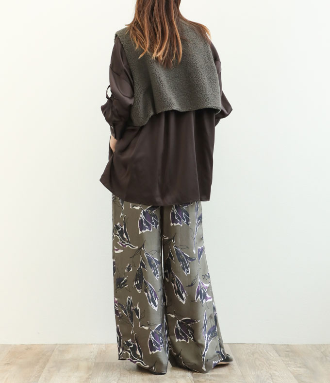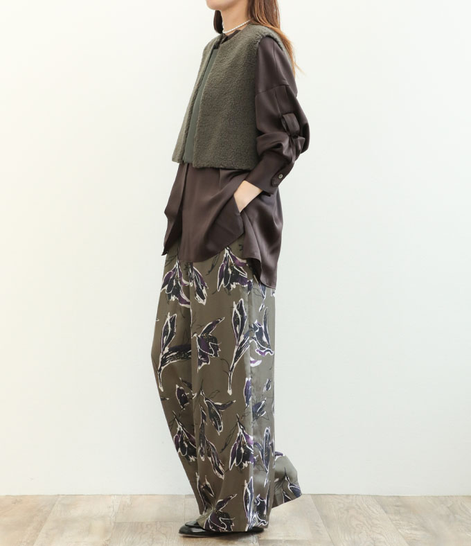 drawell ドロウェル パンツ ワイド ドローストリング ウエストゴム オリジナルリーフ柄 総柄 ポリエステル レーヨン オリジナルプリント 4-2-DW-36 ブラック