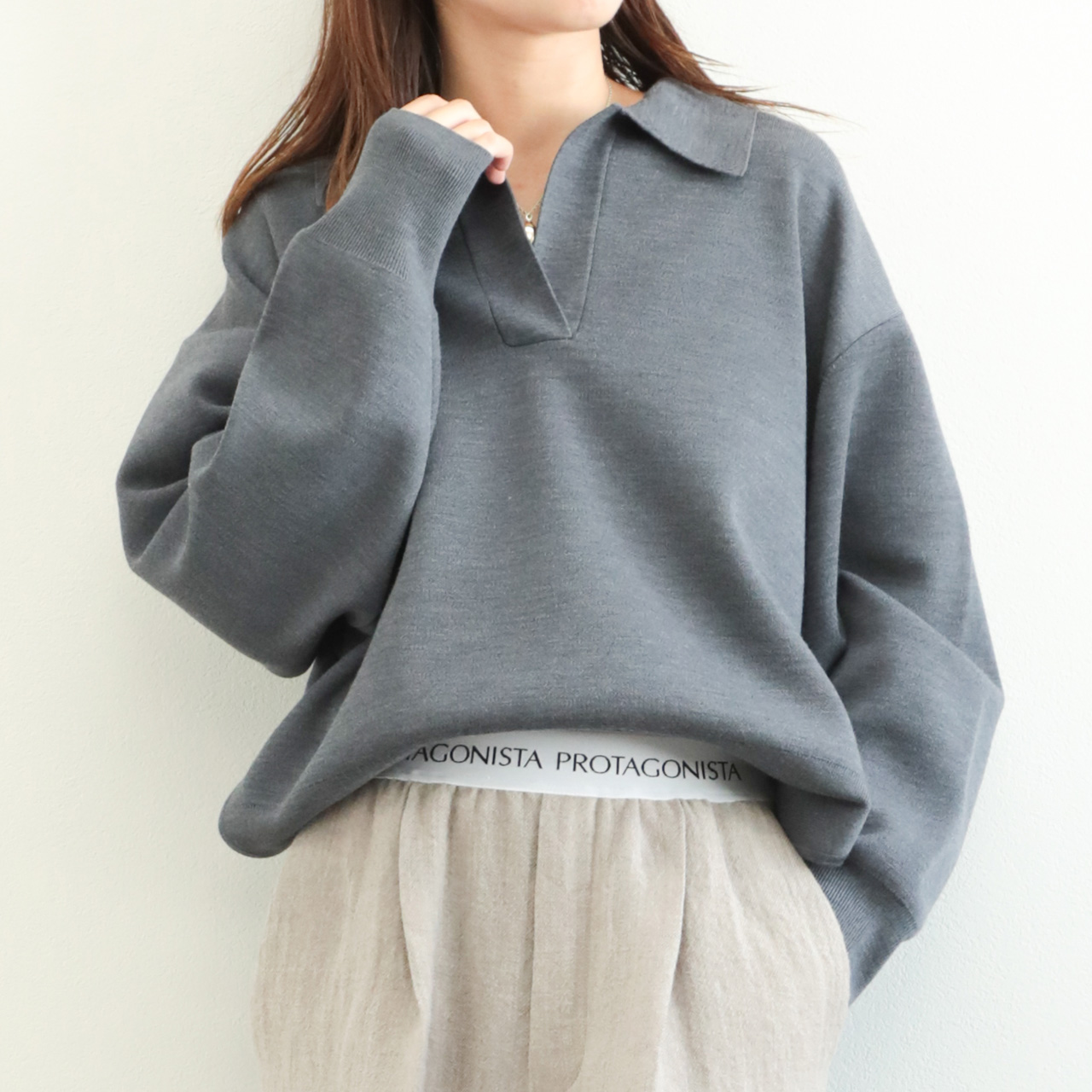 PROTAGONISTA プロタゴニスタ ニット ハイゲージ スキッパー 長袖 ドロップショルダー ミラノリブ ウール ポリエステル PNT-KT-66 CHARCOAL/チャコール