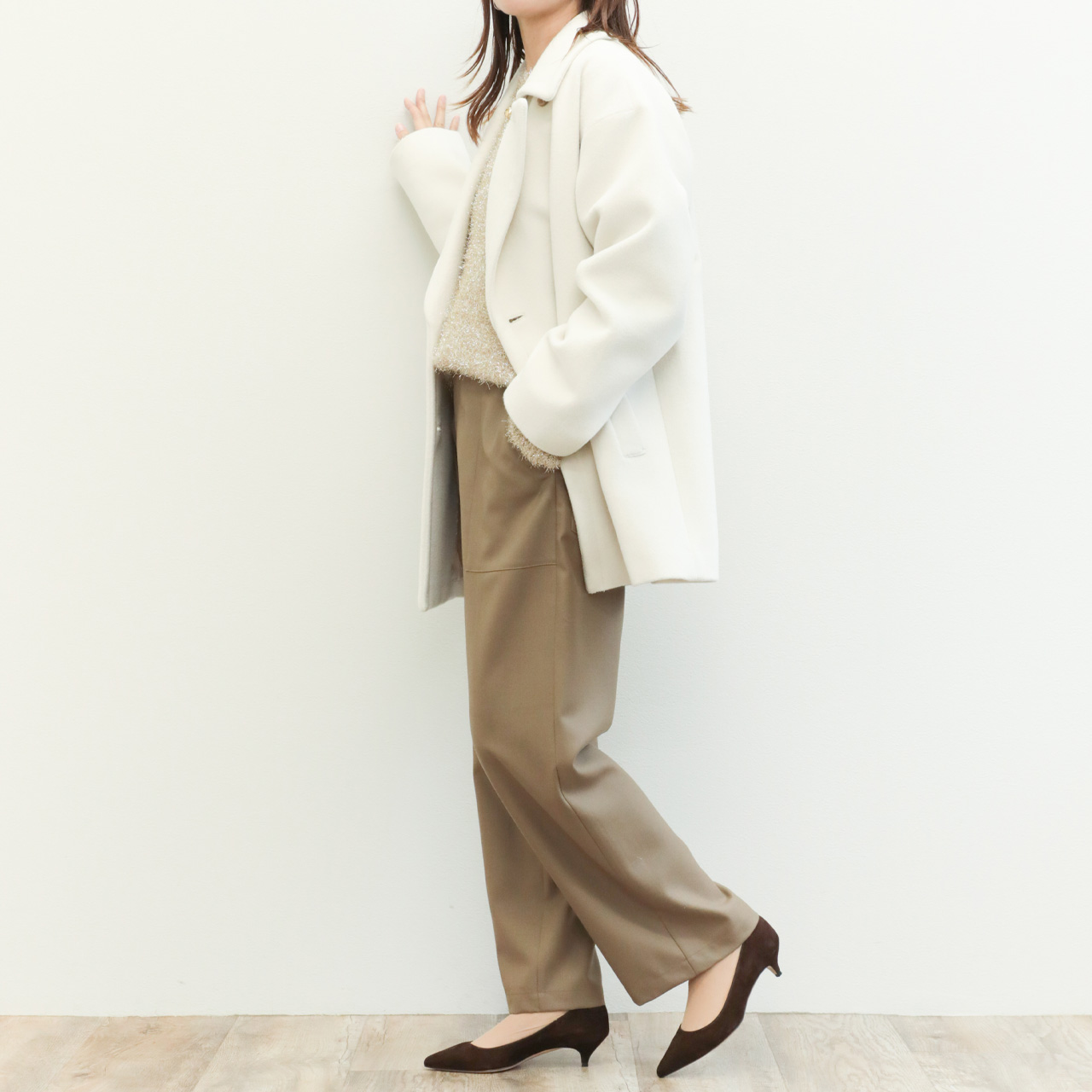 カラーはどんなアイテムにも合わせやすいカラーリングのアイボリー、キャメル、ネイビーでご用意しました。深みのあるネイビーは普段使いだけでなくお仕事でも使いやすい一着ではないでしょうか。