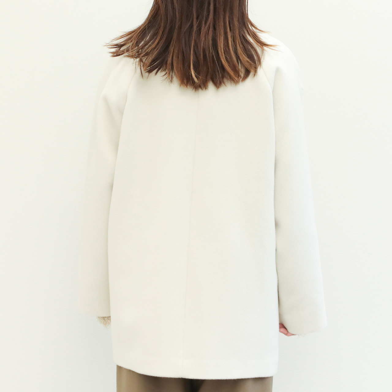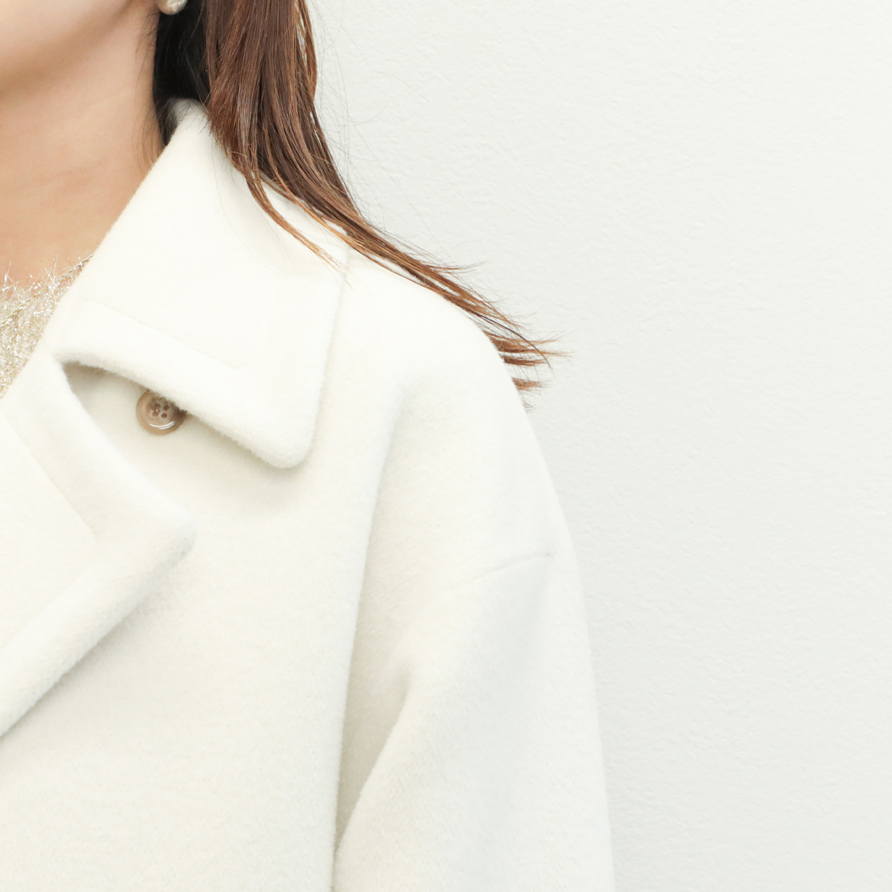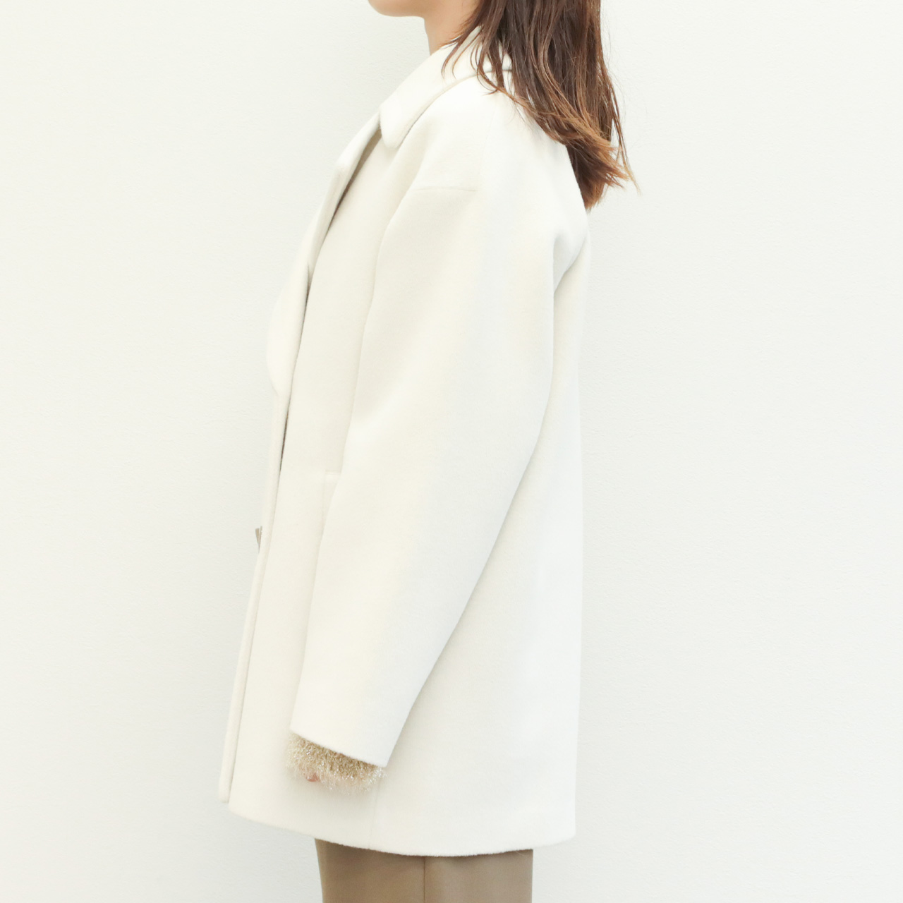 今季は昨年好評いただいたショート丈のPコートを別素材でもご用意しました。 ウールアンゴラ素材をベースに、ビーバー仕上げを施したオックスフォード地を採用したこちらのモデル。シャギータイプに比べて毛足が抑えられておりますので、より長いシーズンお楽しみいただける表情です。