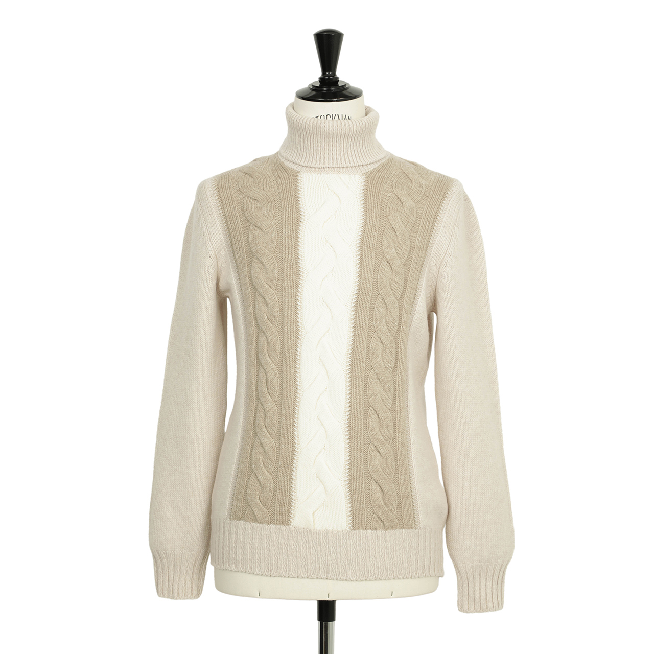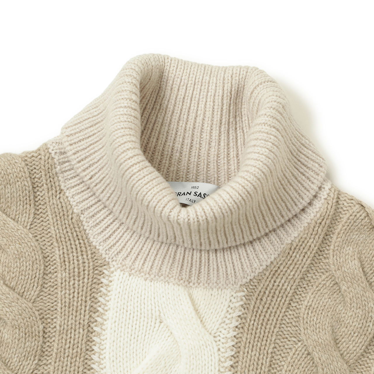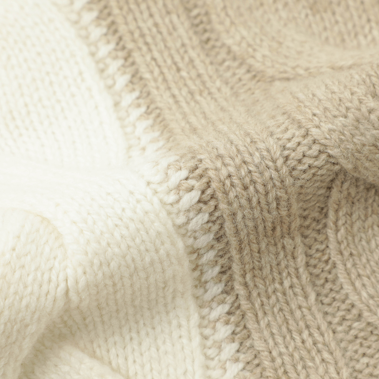 ミドルゲージのケーブルニット。文面だけでみれば定番のアイテムですが、一ひねり加えているのがこちら。ベージュのボディをベースとしながら、前身頃をホワイトとモカ系のブラウンカラーで切り替え、同時にケーブルのピッチも変えることで、デザインにアクセントを加えています。