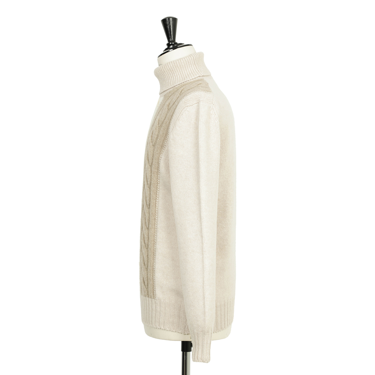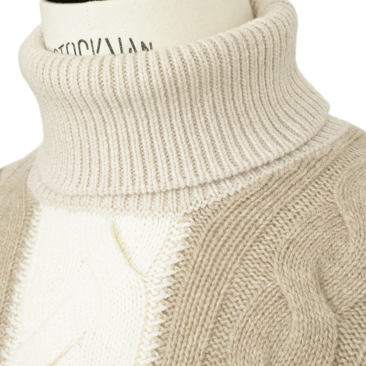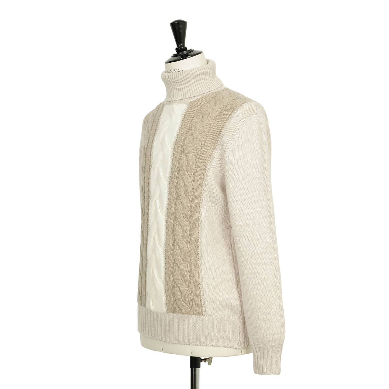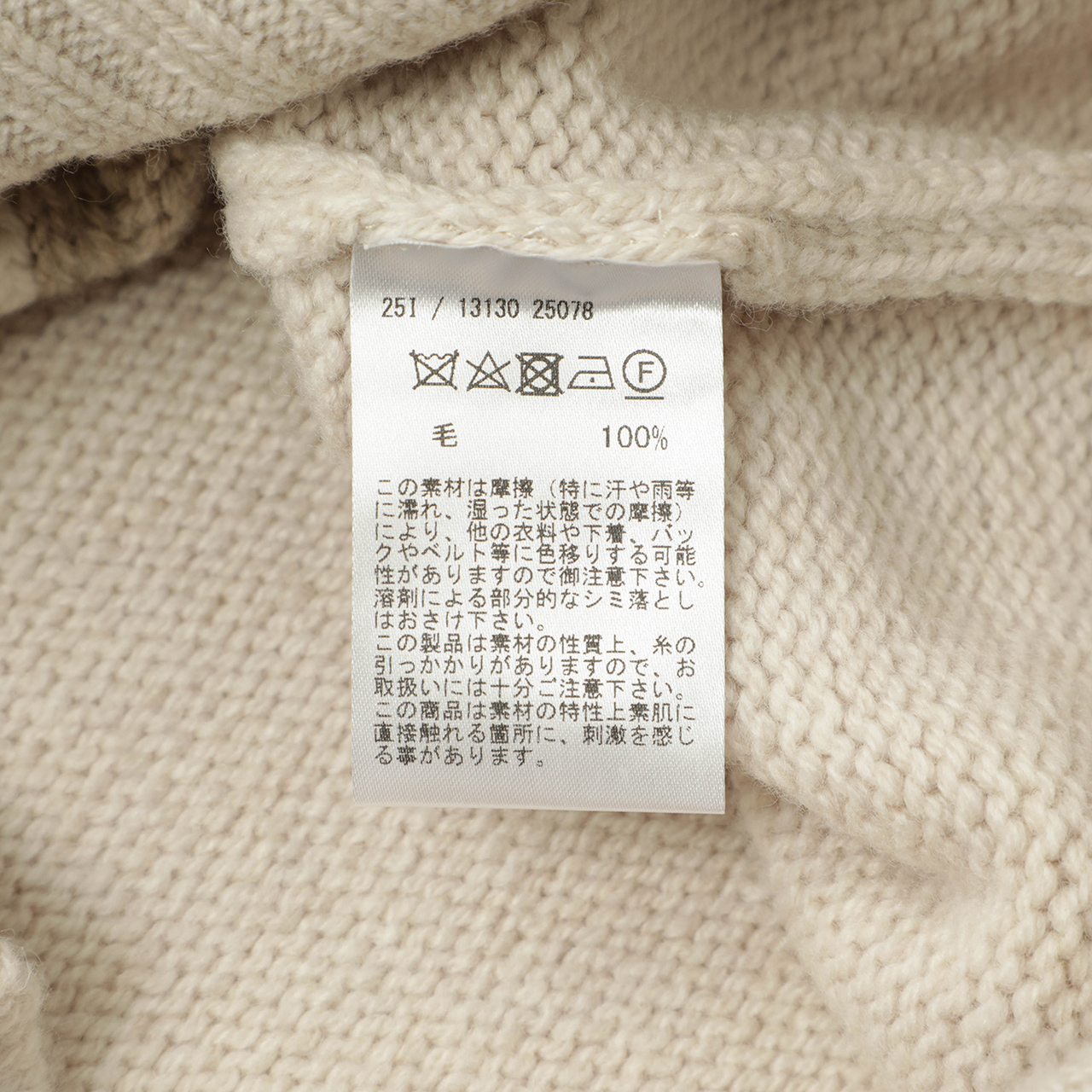 ミドルゲージのケーブルニット。文面だけでみれば定番のアイテムですが、一ひねり加えているのがこちら。ベージュのボディをベースとしながら、前身頃をホワイトとモカ系のブラウンカラーで切り替え、同時にケーブルのピッチも変えることで、デザインにアクセントを加えています。