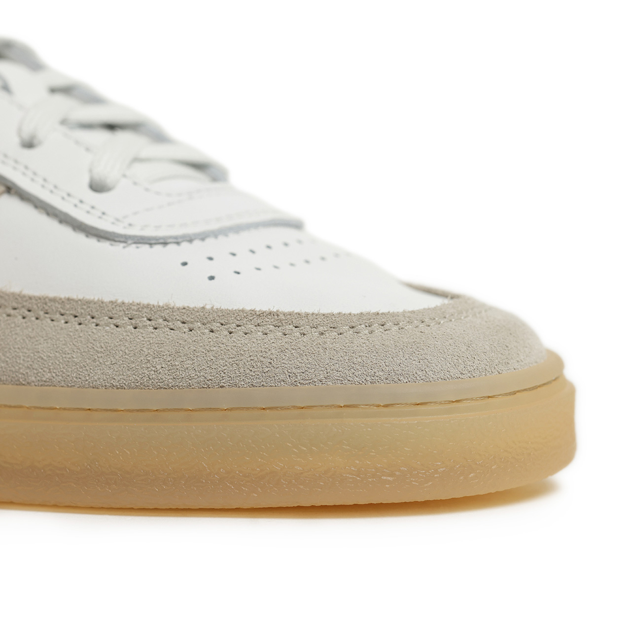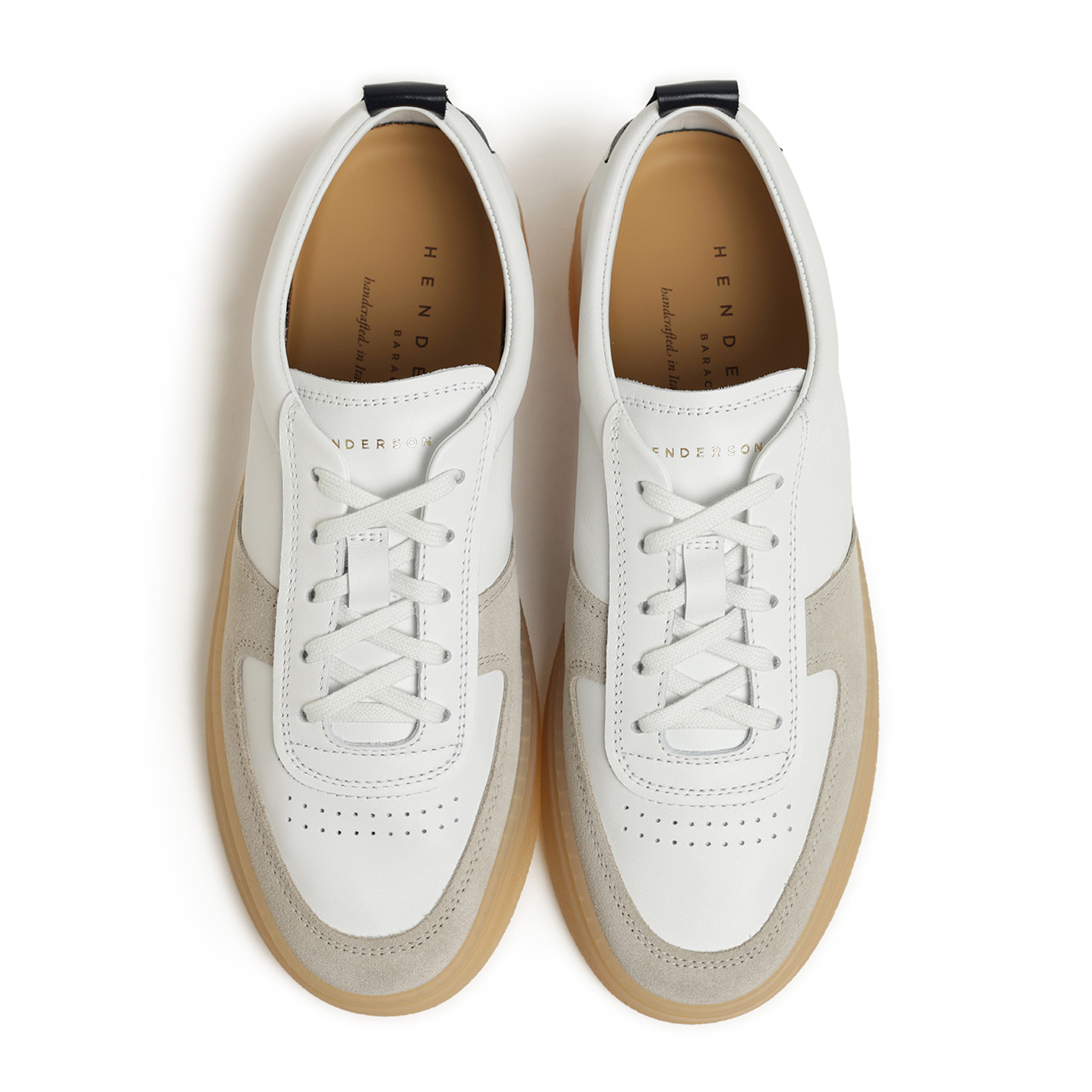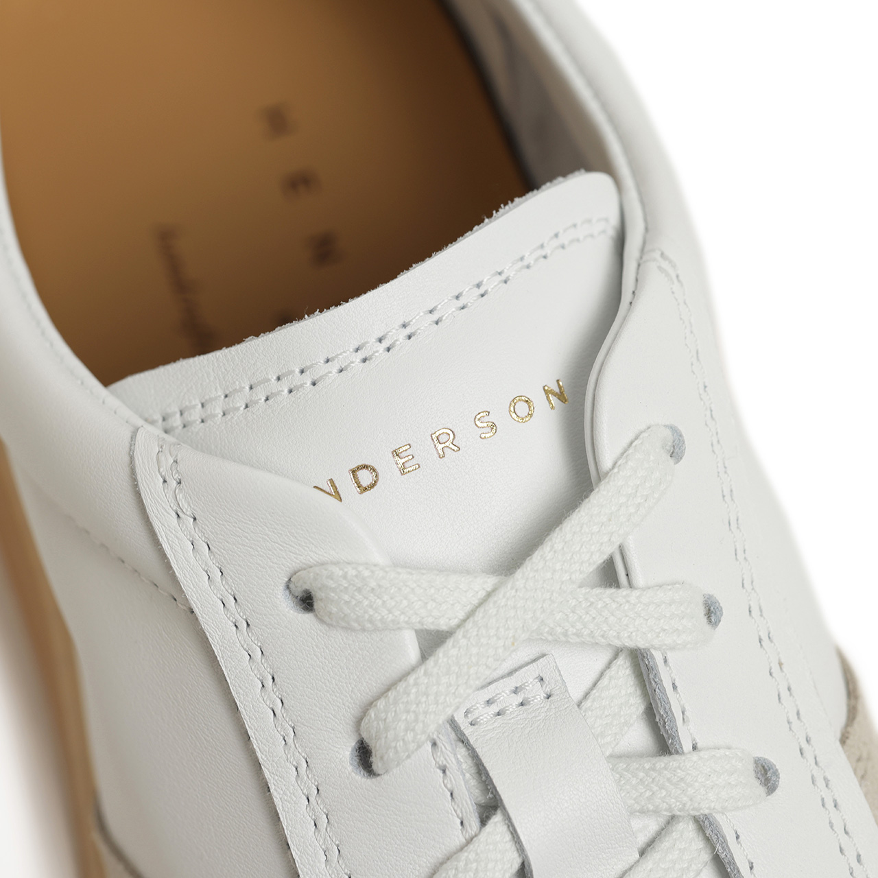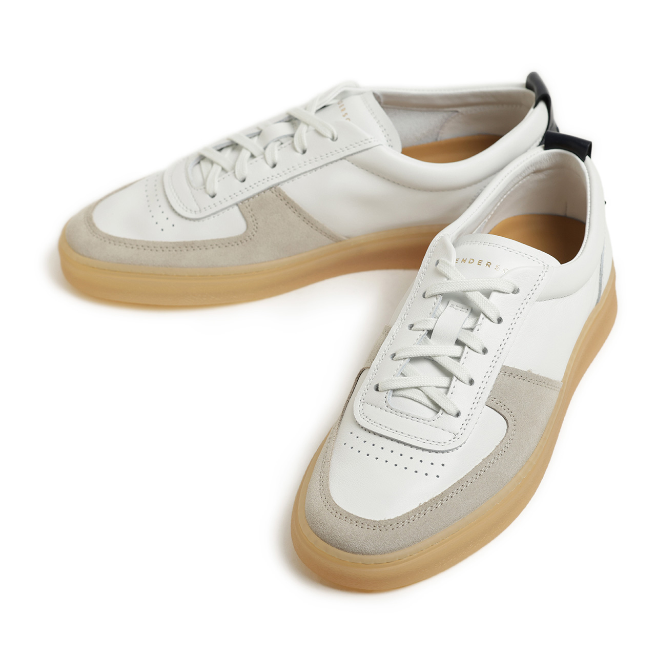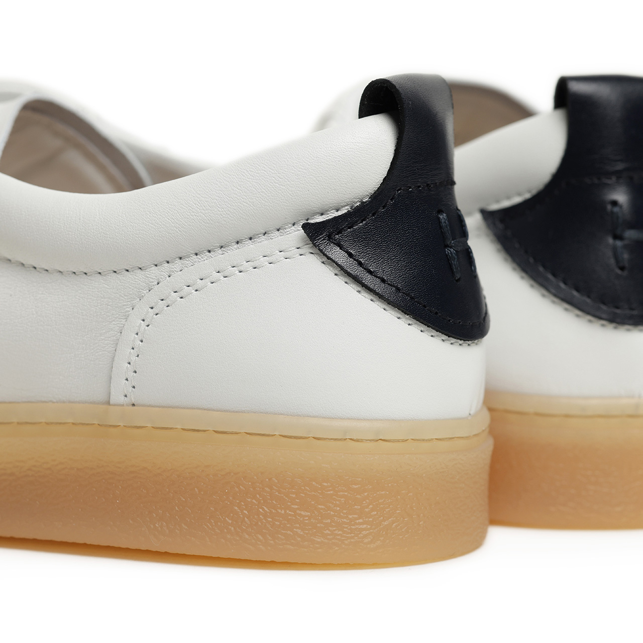 春夏らしいホワイトのカーフレザーアッパーをベースにトゥをベージュスエード、ヒール部分をネイビーのレザーで切り替え。何といってもソールがポイント。