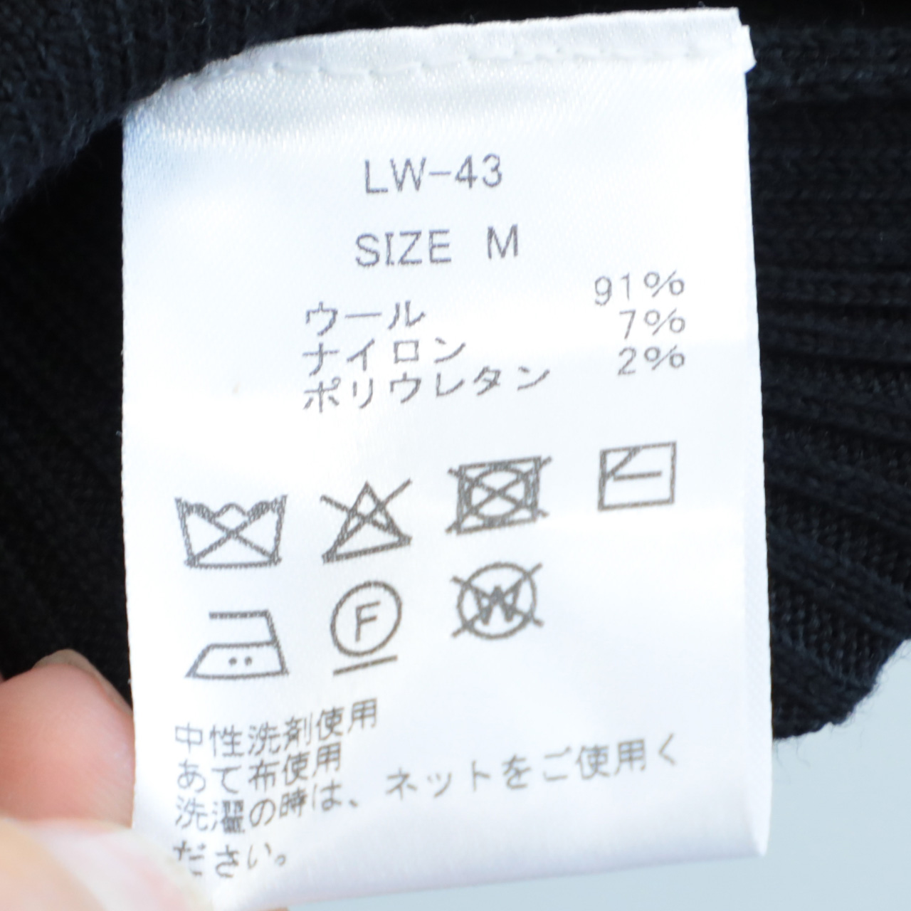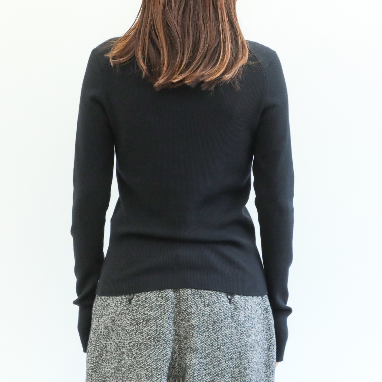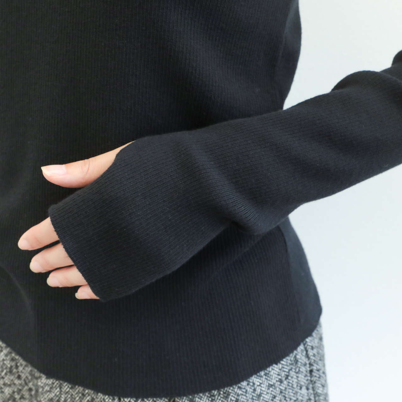 更に希少性の高い18Gの希少性の高いハイゲージで仕上げ。リブ編みにストレッチ糸を編み込んでいる分高密度でありながら柔らかくカシミヤに近いような肌触り、着心地を実現しています。