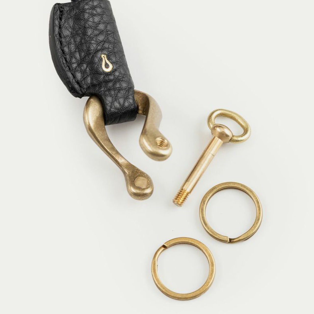 先端のメインパーツは、ドライバーなどを使わずに指でネジを着脱できる、シャックル機能付きのオリジナル真鍮金具で、ひねりが加えられた造形の美しさが個性的。