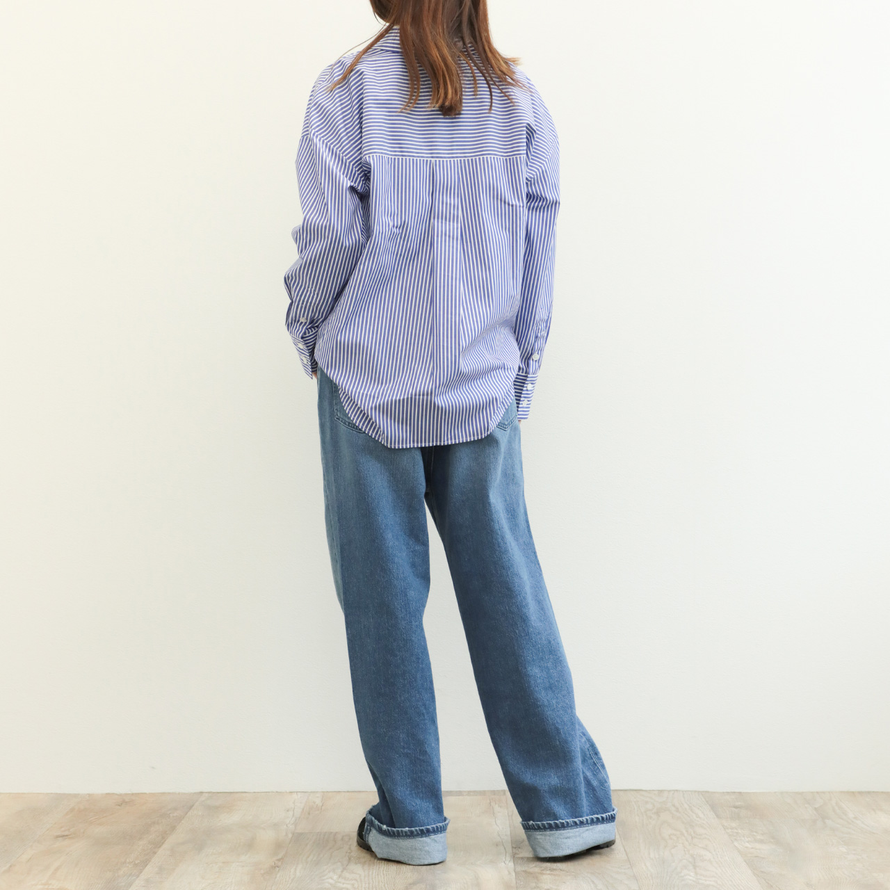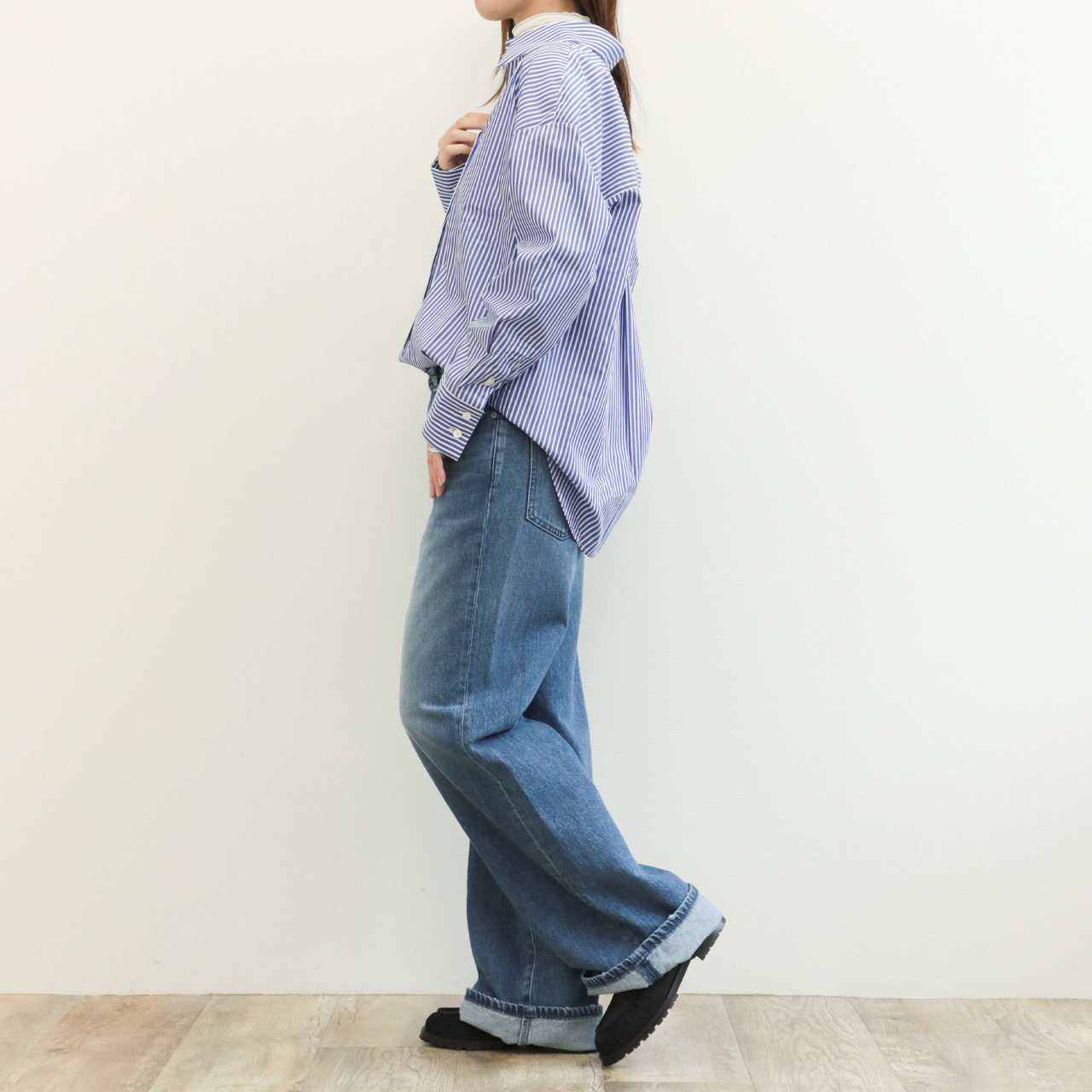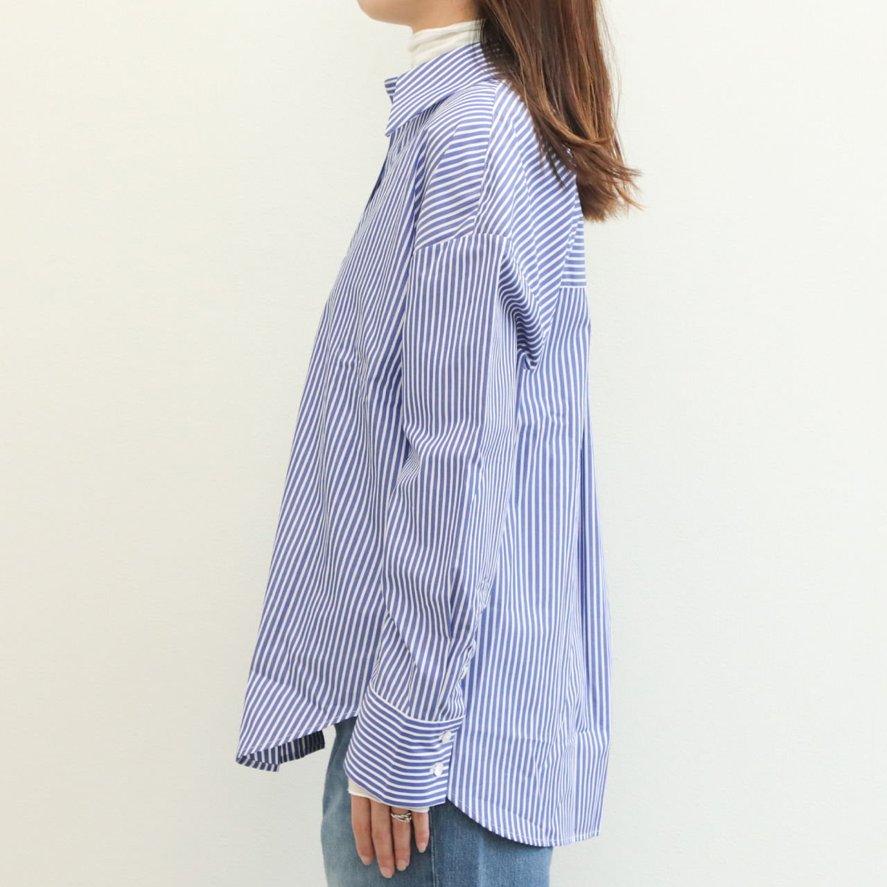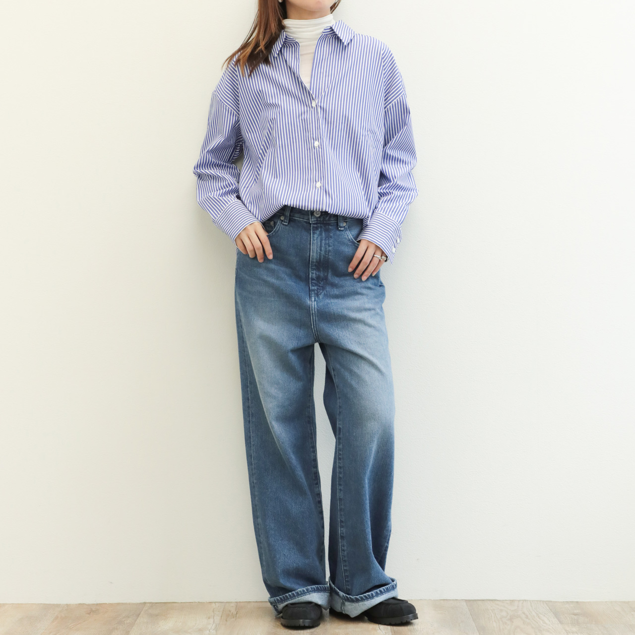 標準的なピッチのストライプ幅ですので、合わせに困らずお手持ちのアイテムとすぐにコーディネートしていただけます。また、インでもアウトでも着られるバランスですので、ボトムスもパンツからスカートまで幅広く合わせていただけます。