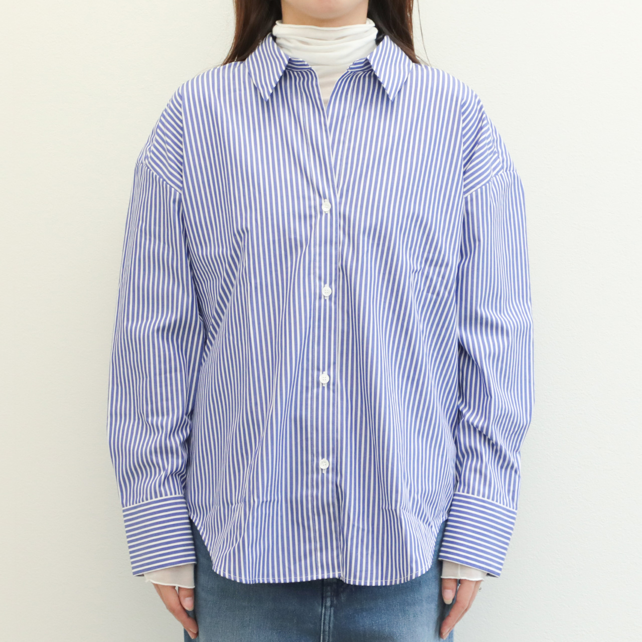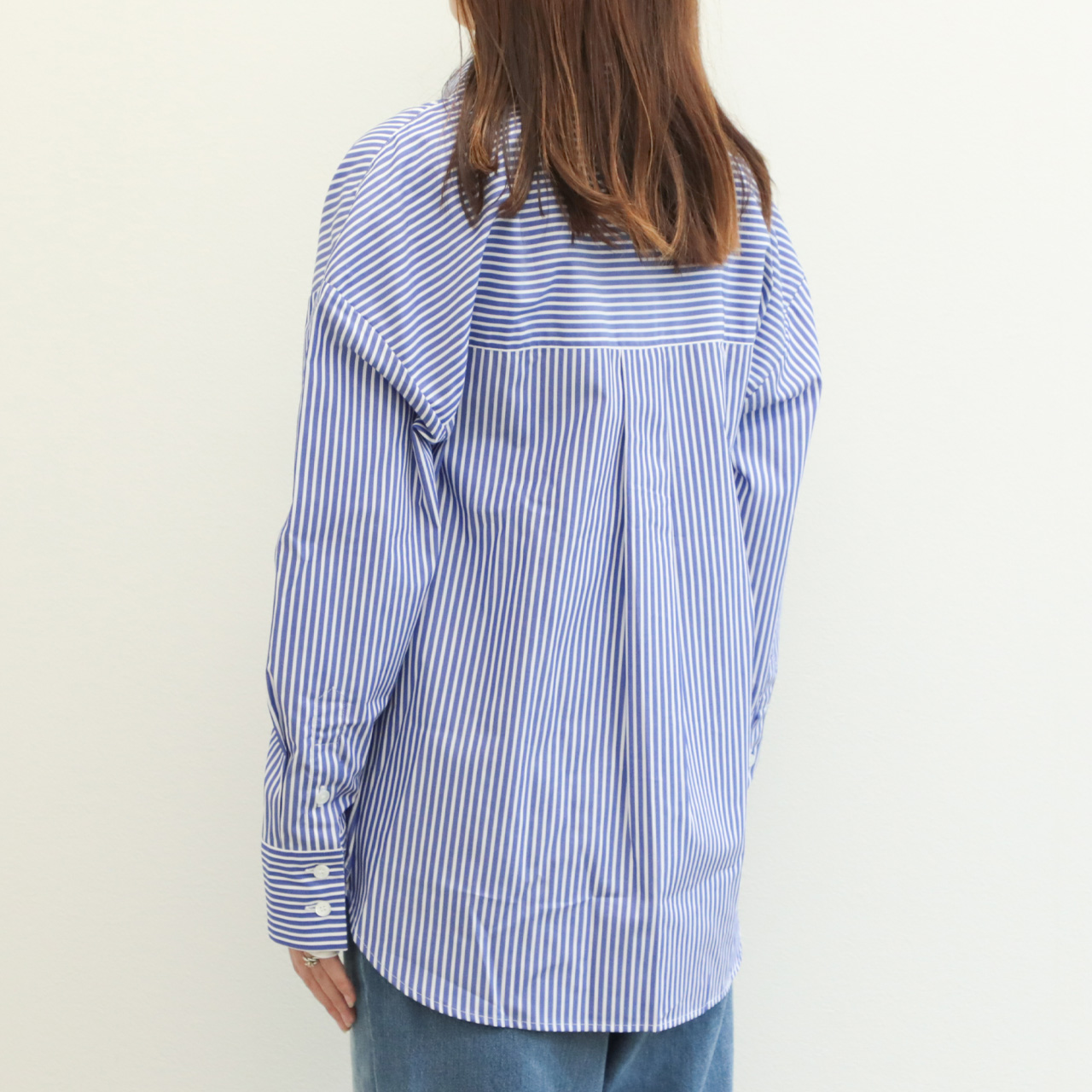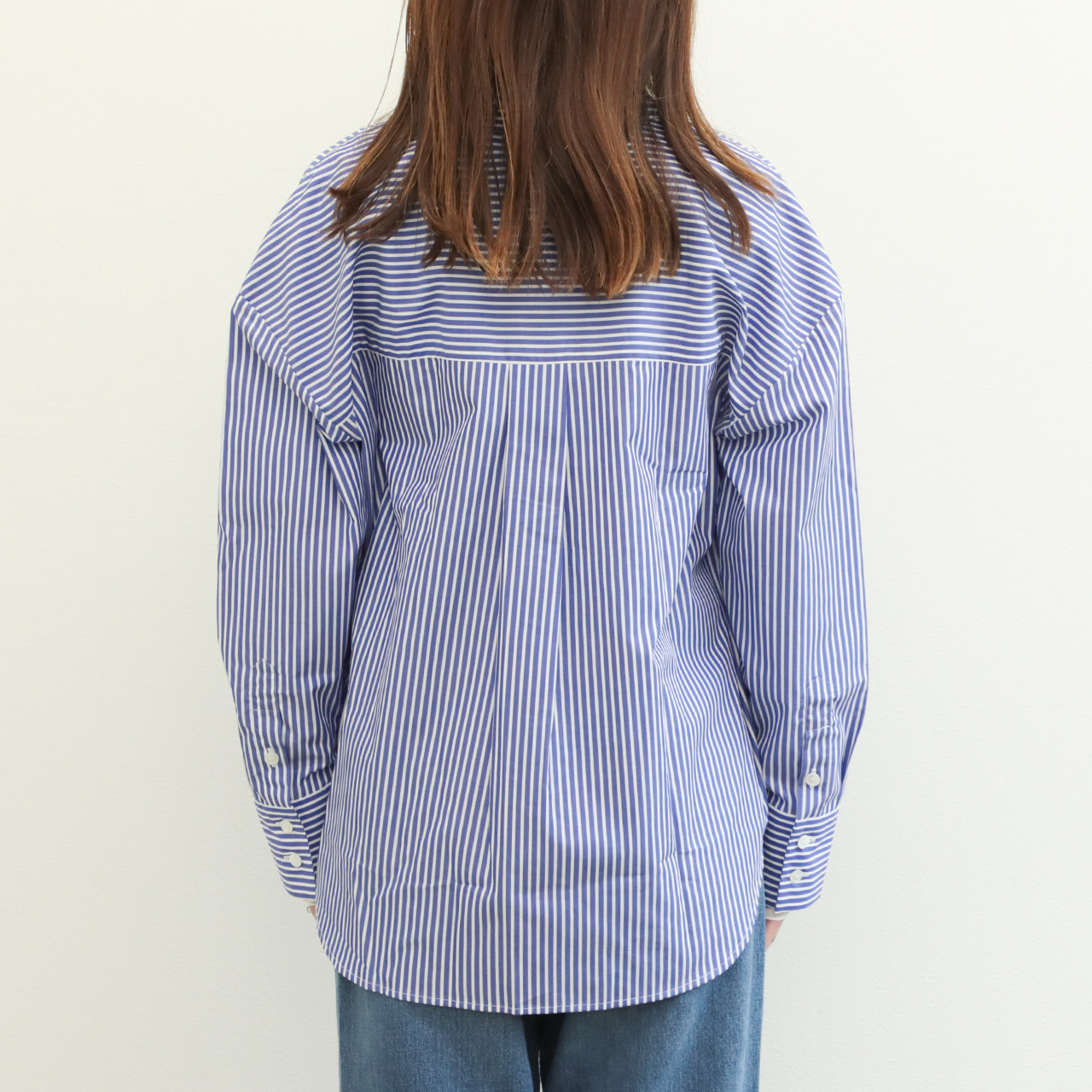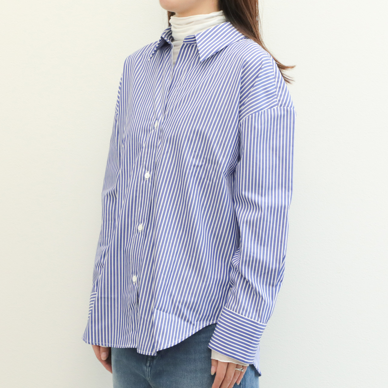 標準的なピッチのストライプ幅ですので、合わせに困らずお手持ちのアイテムとすぐにコーディネートしていただけます。また、インでもアウトでも着られるバランスですので、ボトムスもパンツからスカートまで幅広く合わせていただけます。