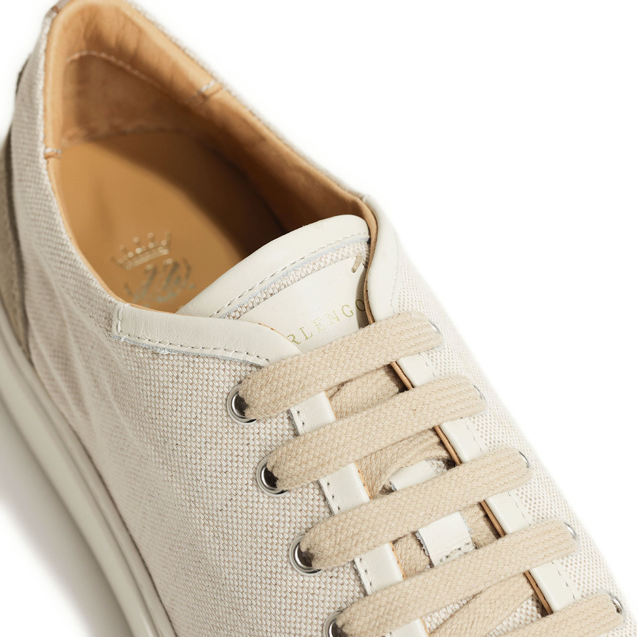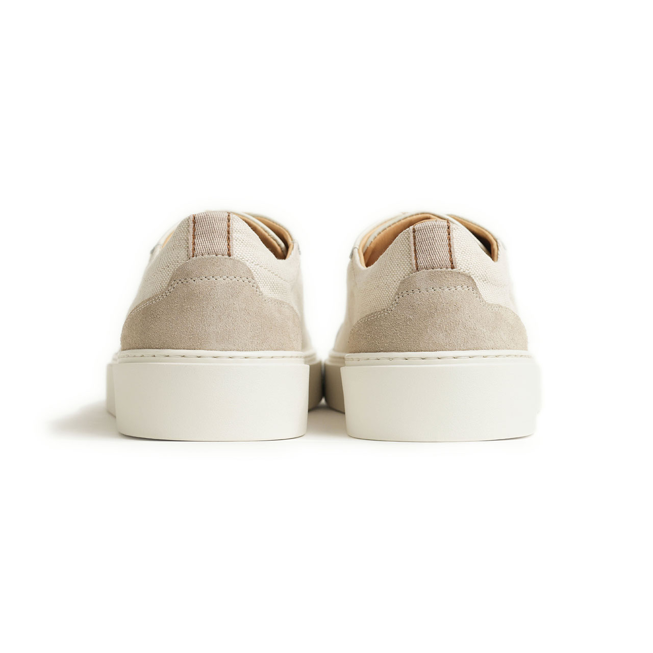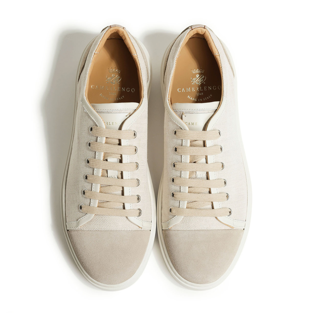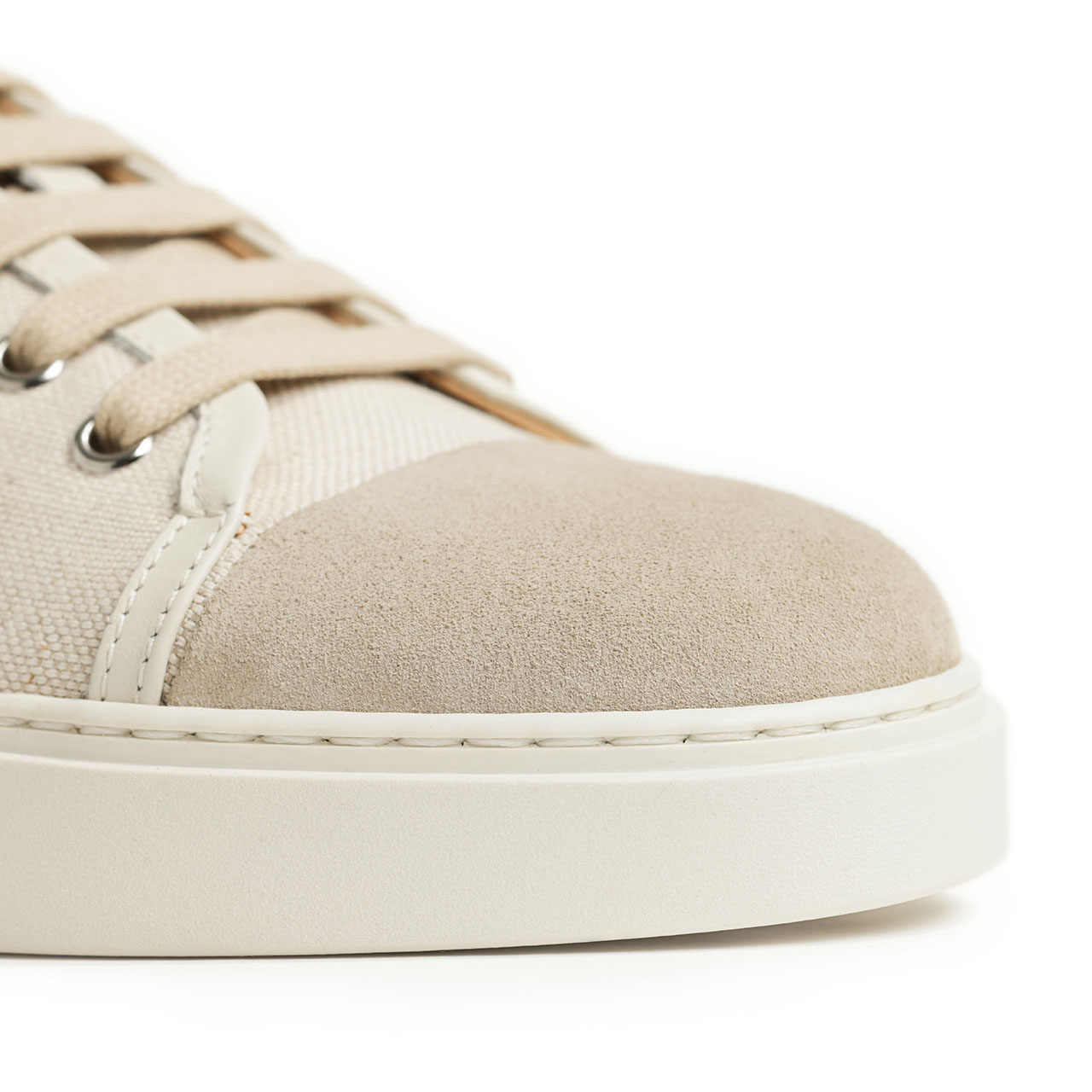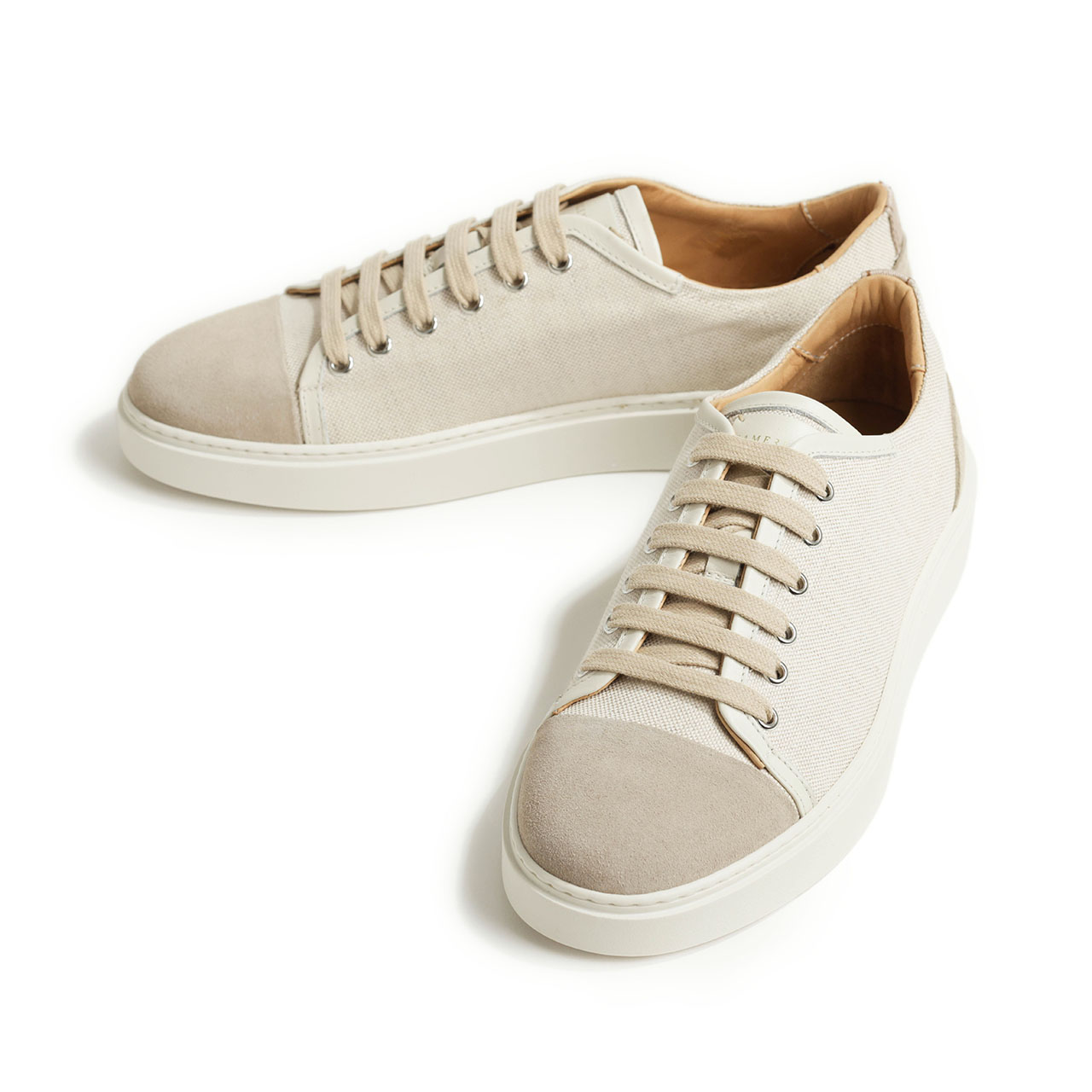 アッパーは春夏シーズンにピッタリのキャンバス素材をベースに、ヒールとトゥをスエードで切り替え。レザーでパイピングも施し、キャンバススニーカーに品をプラスしました。
