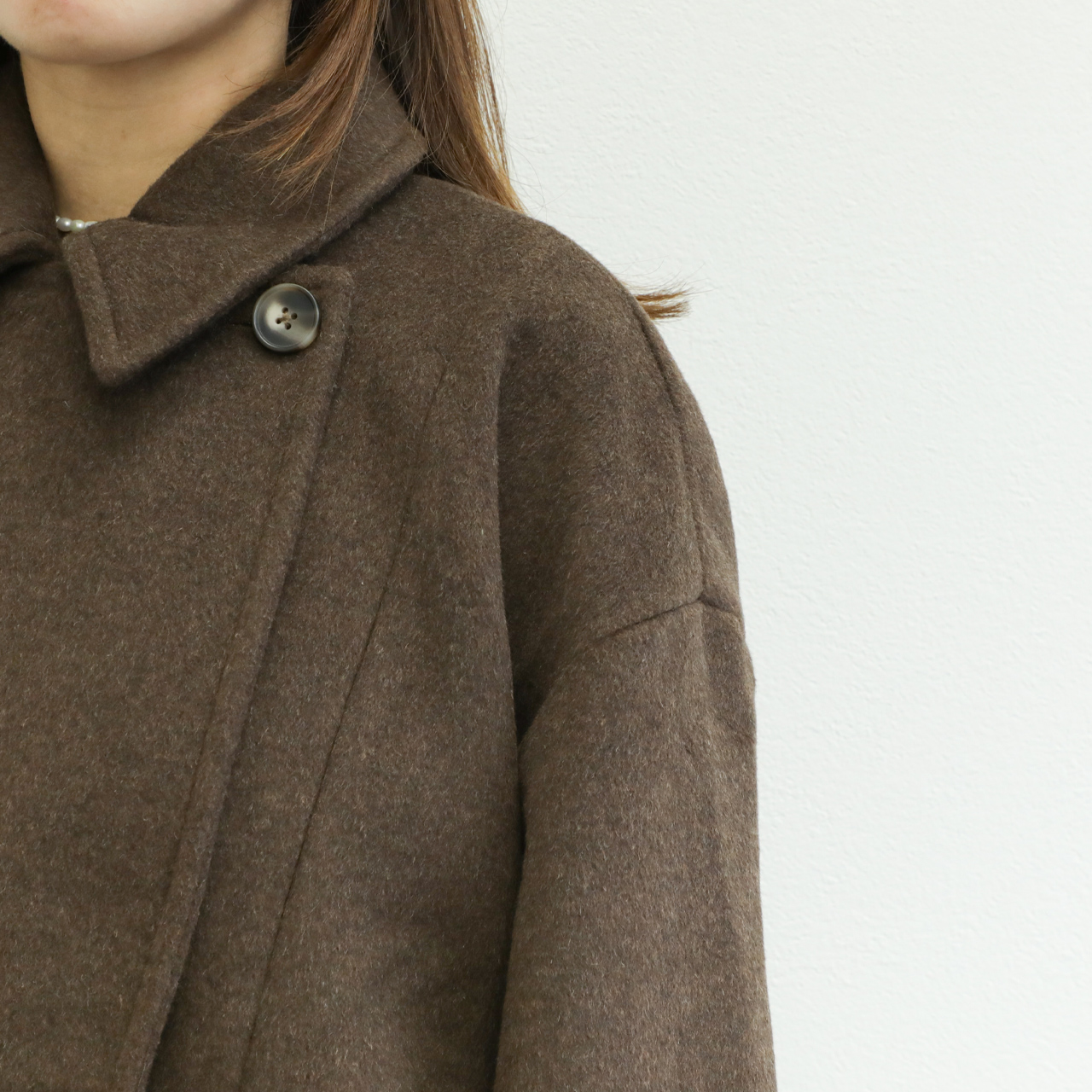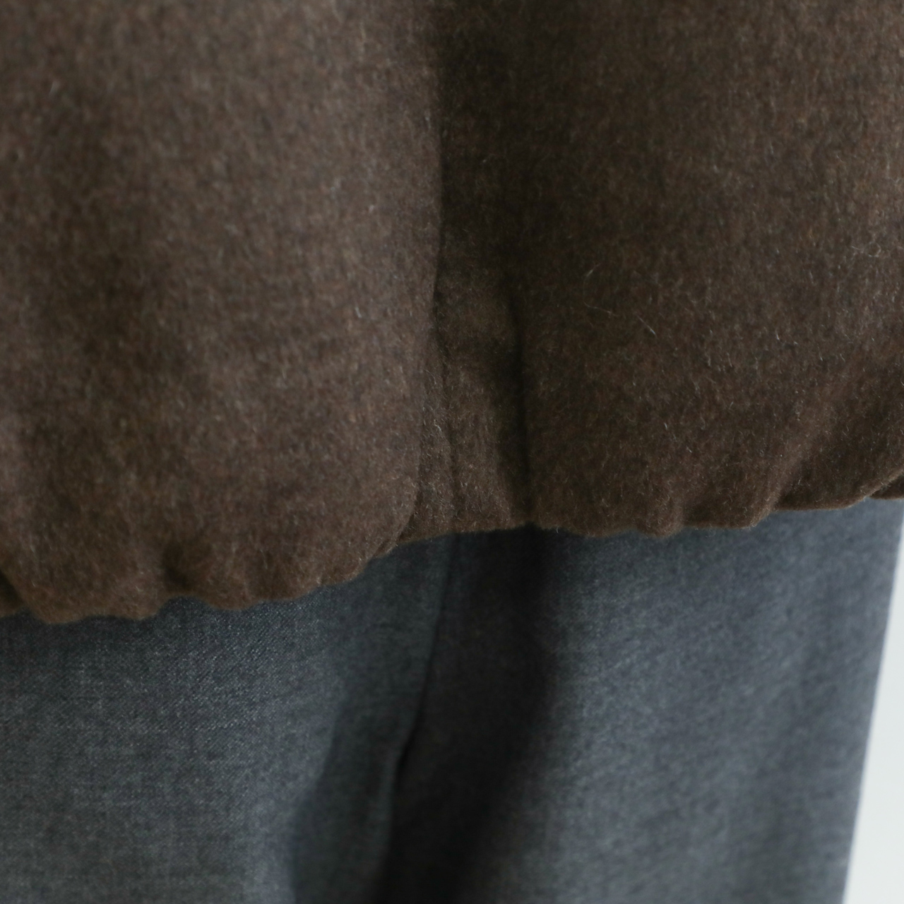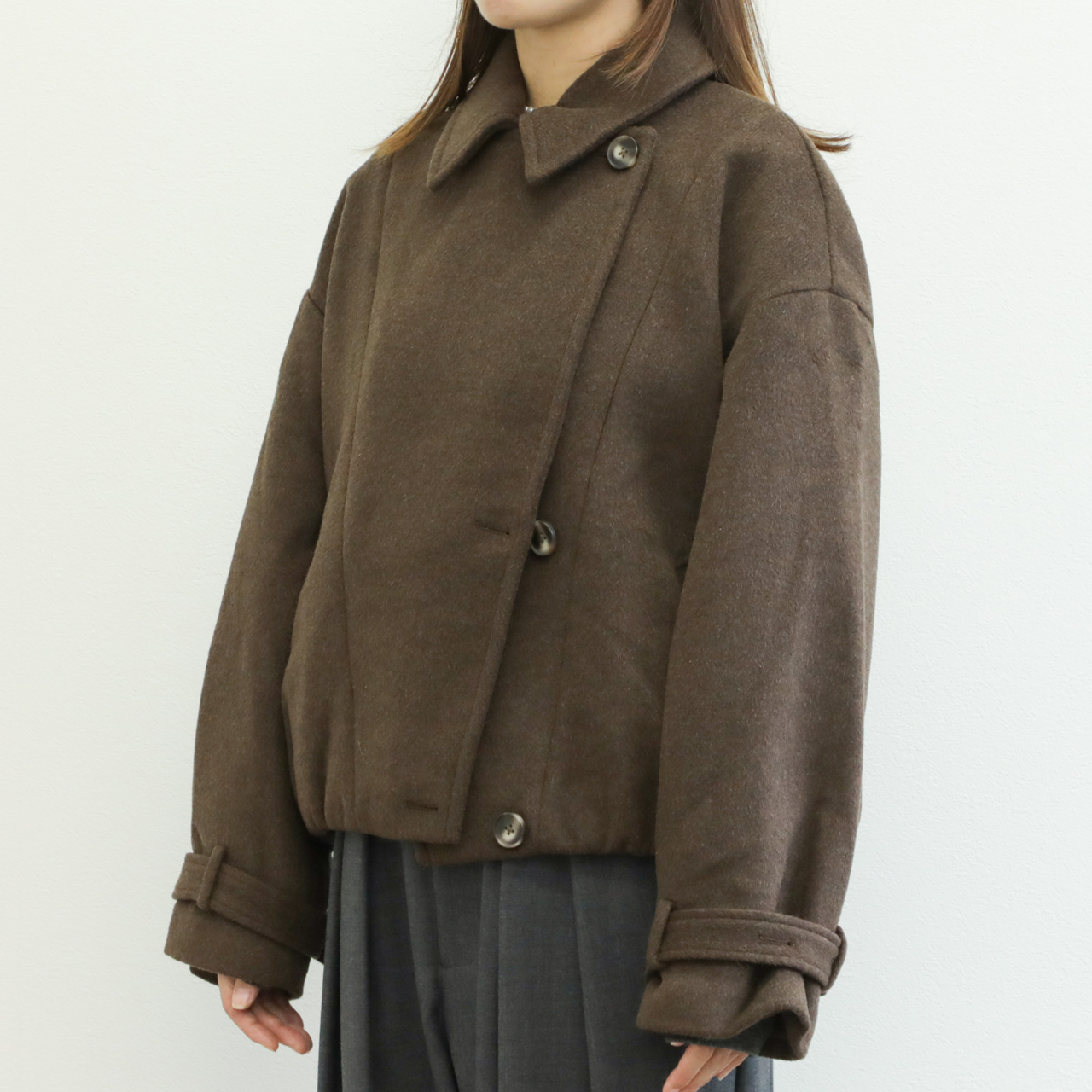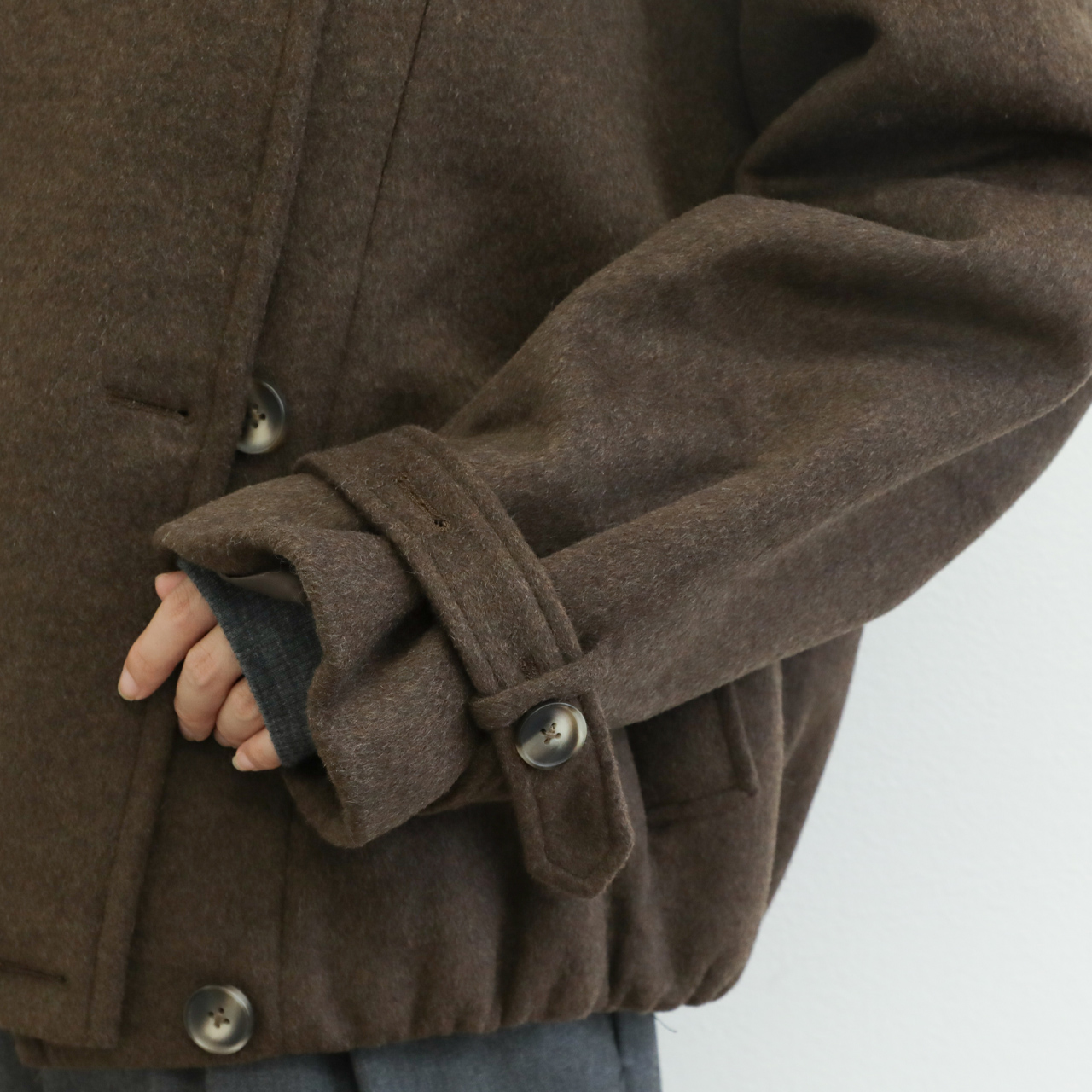 メルトンと聞くと硬く、重い印象がありますが、こちらの生地は軽くソフトな風合いが特徴的。若干シャギー感のある生地はカラーリングと相まって秋冬らしい表情を演出します。
