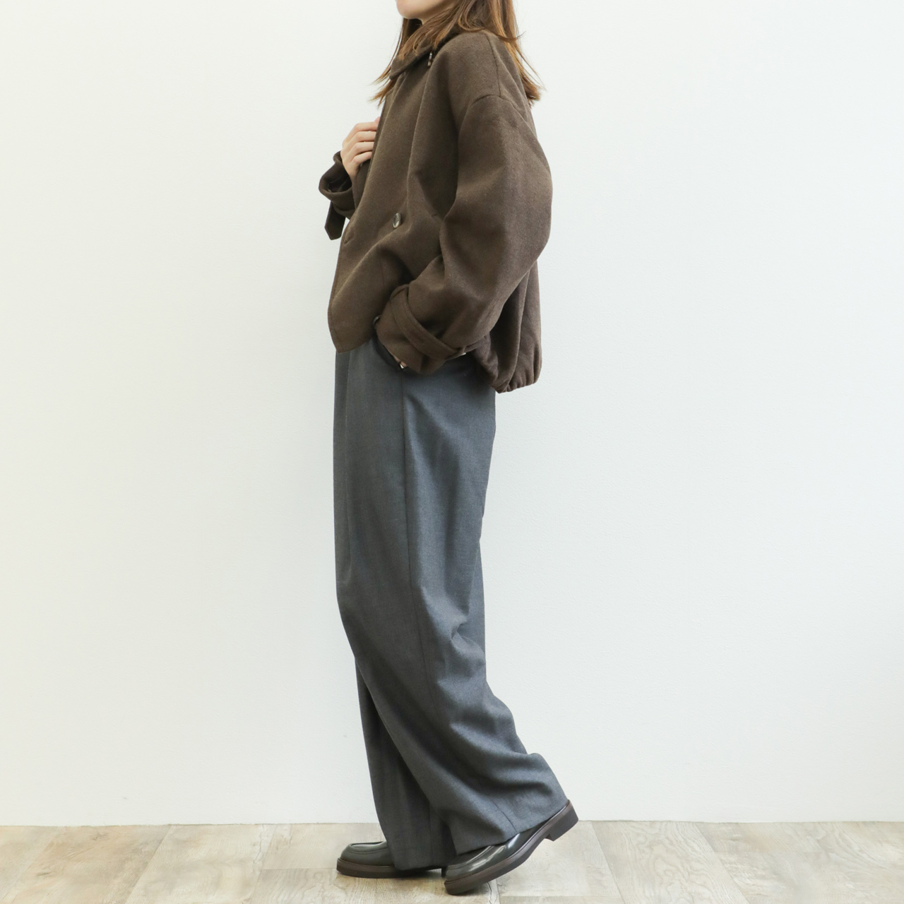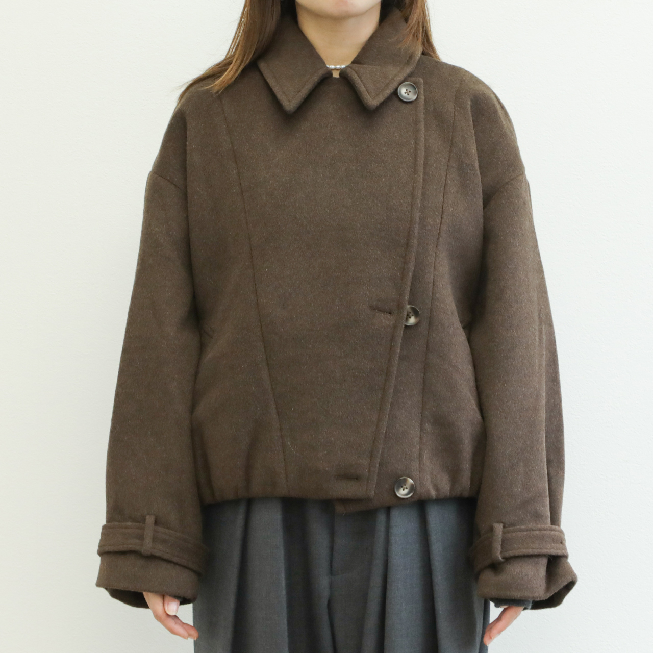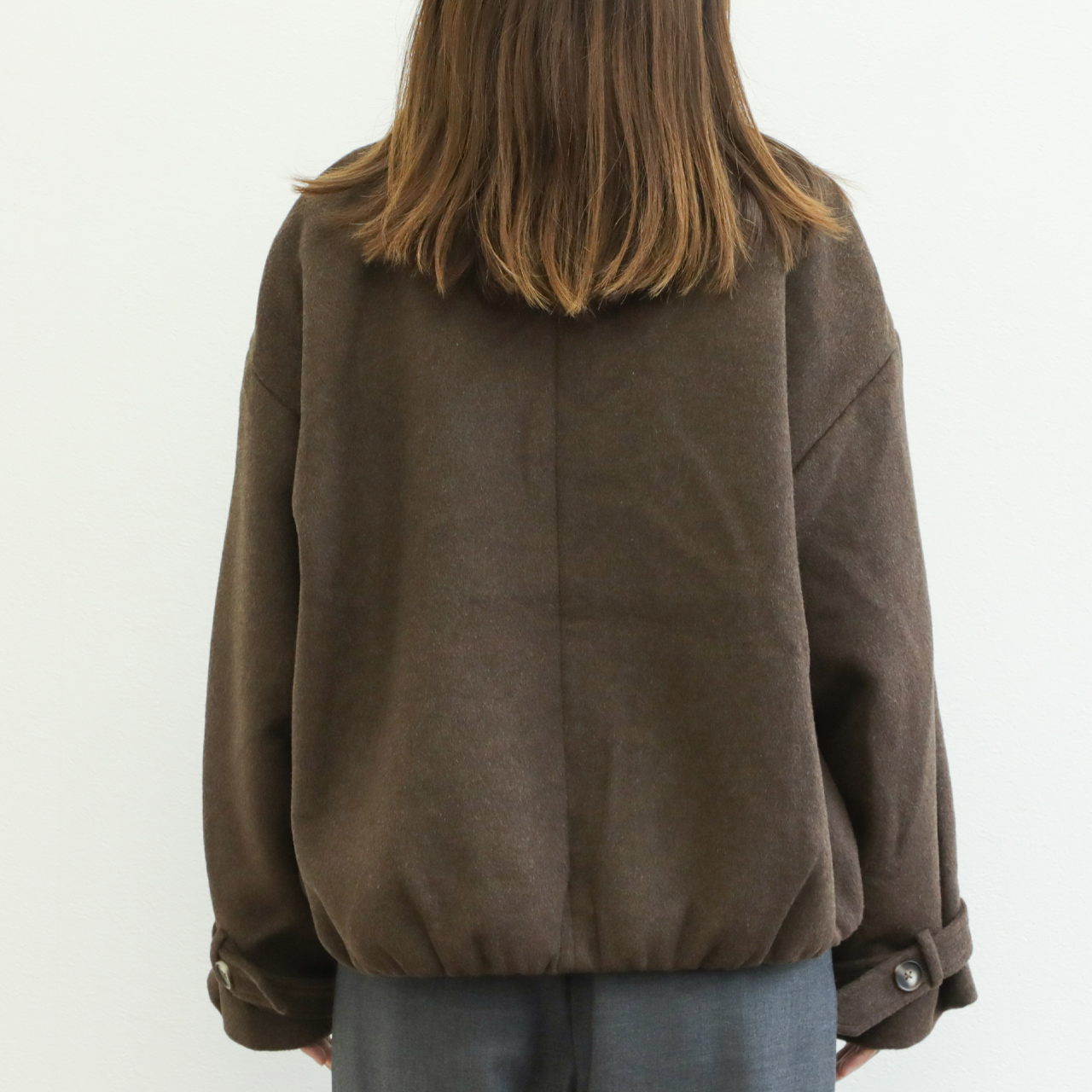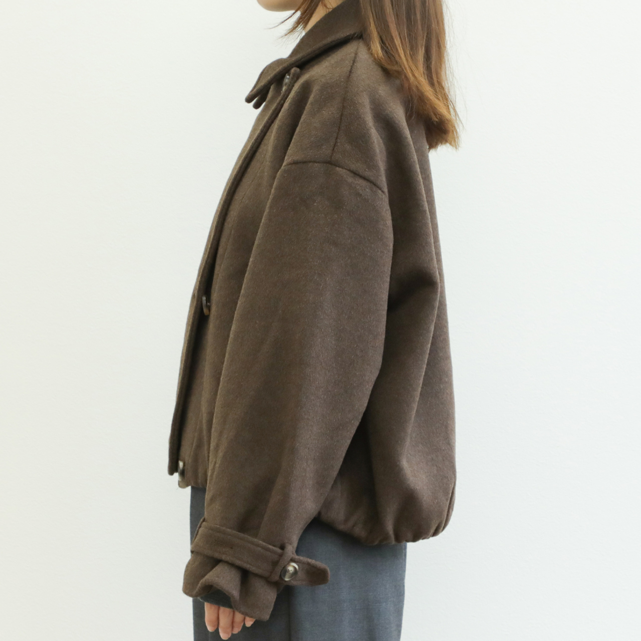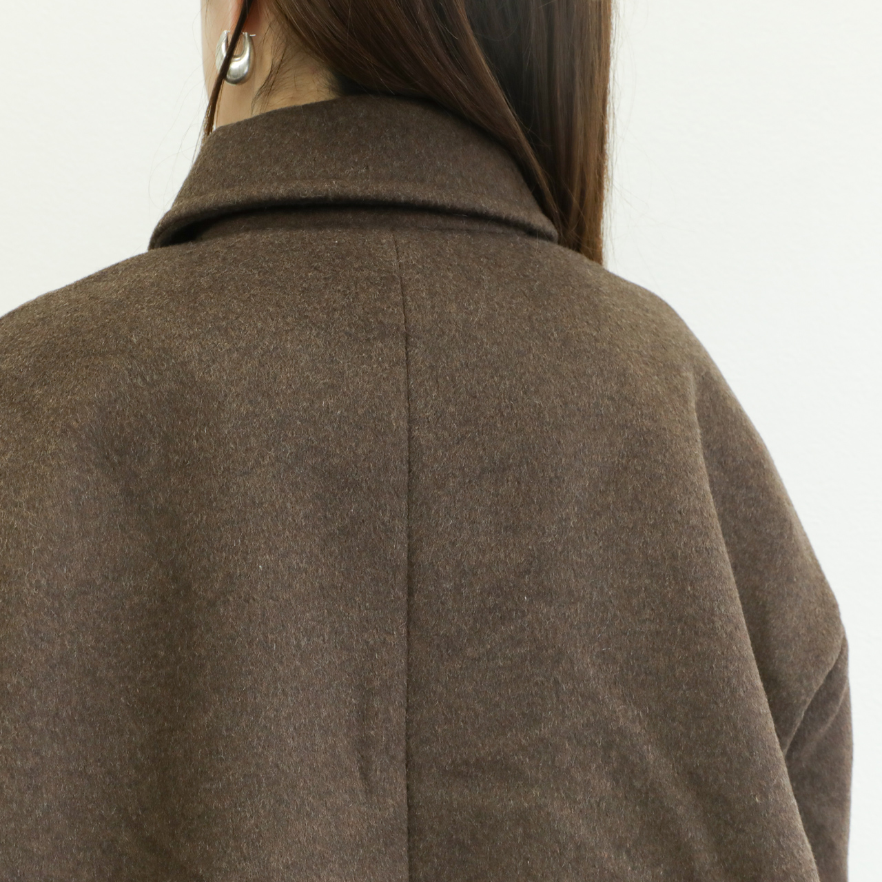 メルトンと聞くと硬く、重い印象がありますが、こちらの生地は軽くソフトな風合いが特徴的。若干シャギー感のある生地はカラーリングと相まって秋冬らしい表情を演出します。