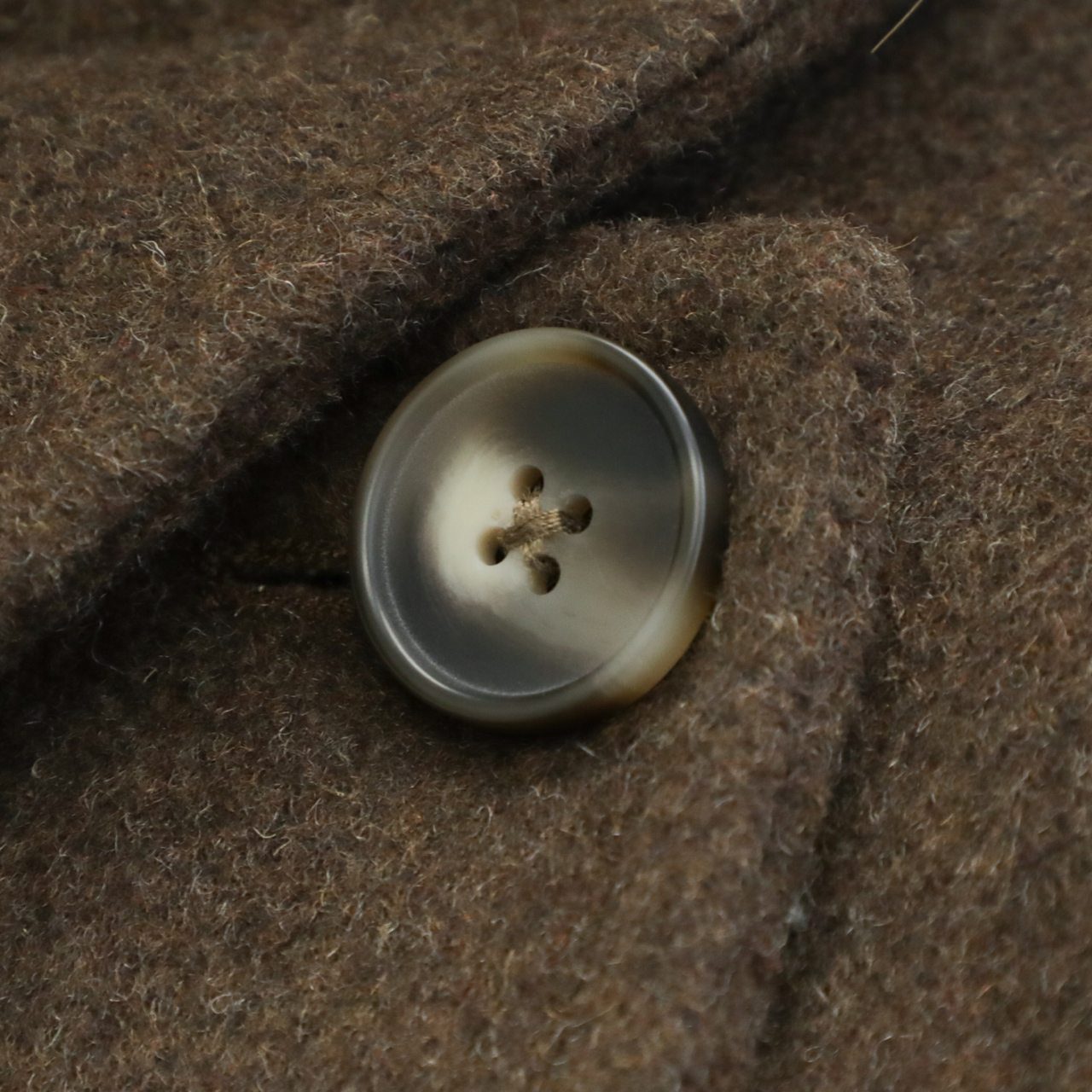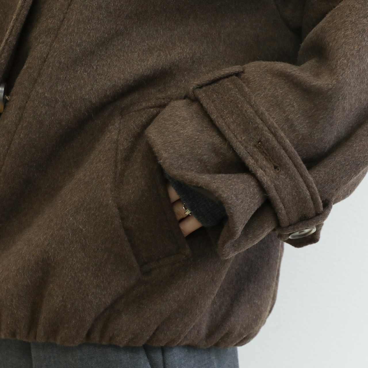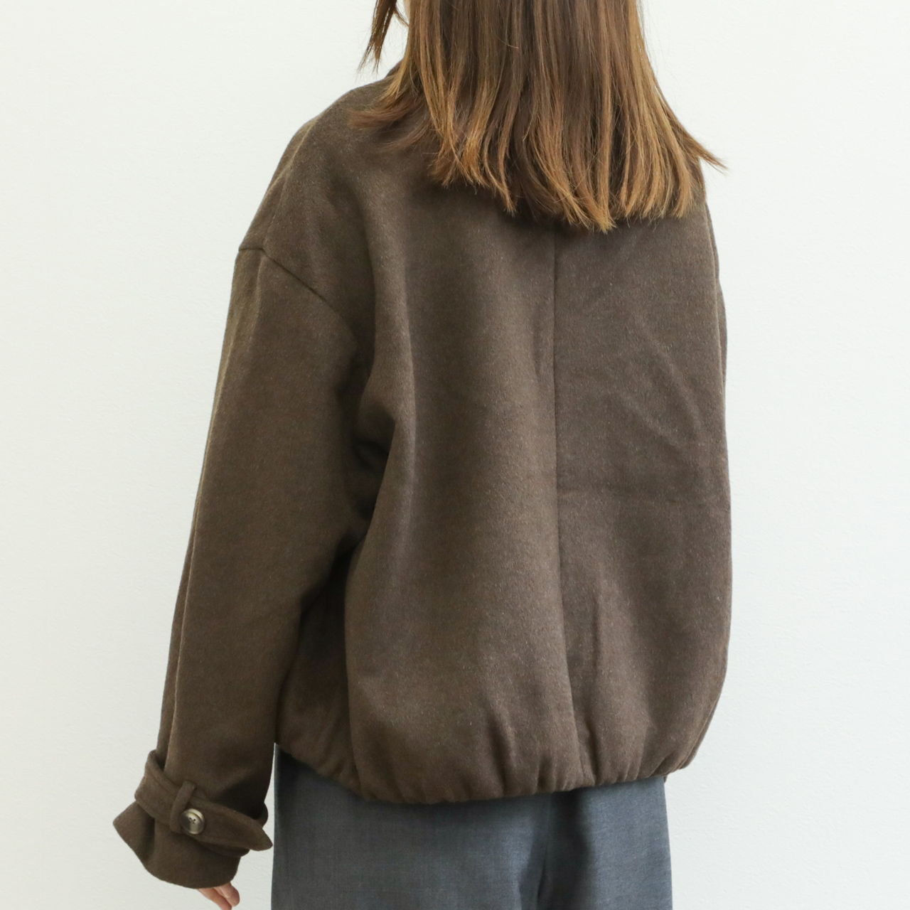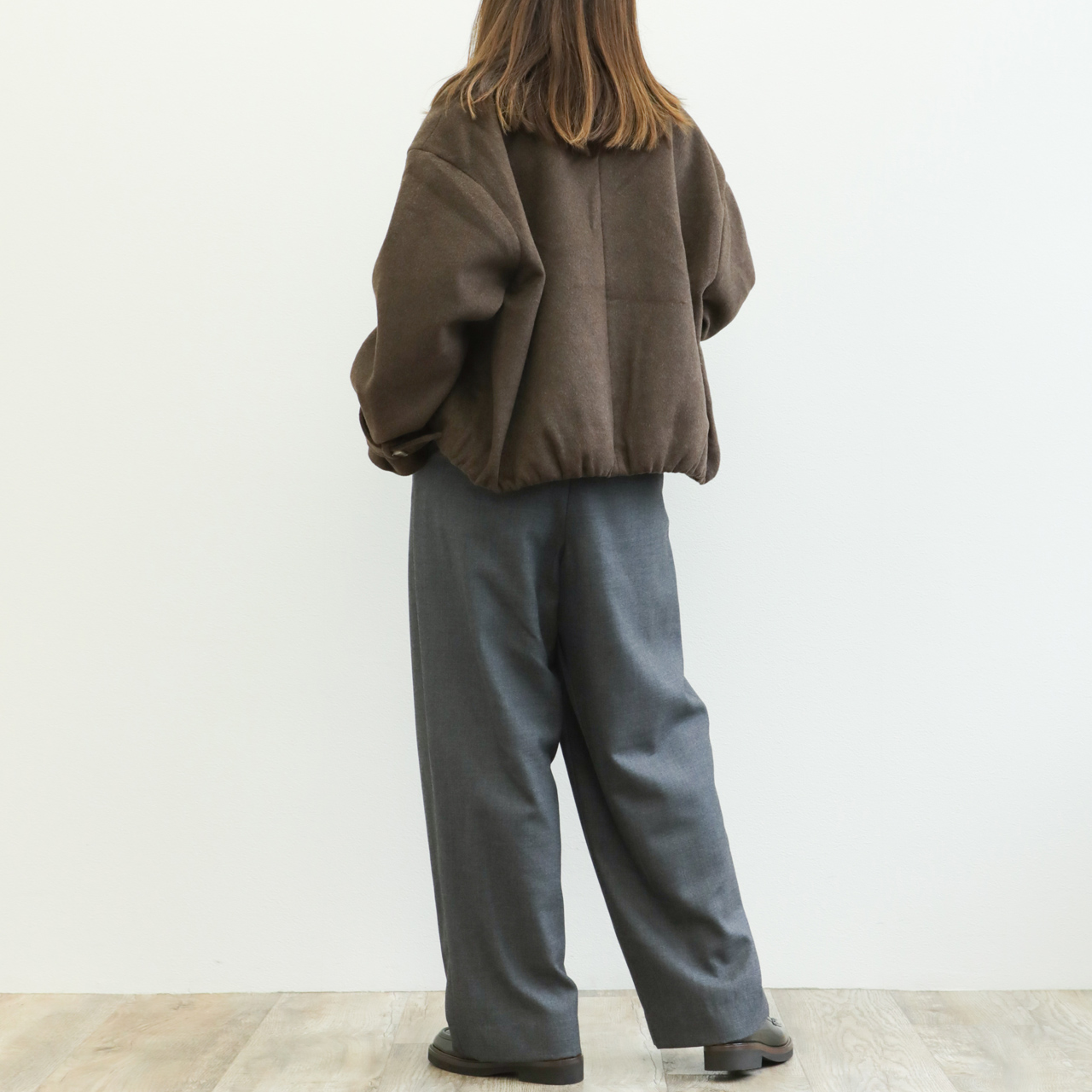 メルトンと聞くと硬く、重い印象がありますが、こちらの生地は軽くソフトな風合いが特徴的。若干シャギー感のある生地はカラーリングと相まって秋冬らしい表情を演出します。