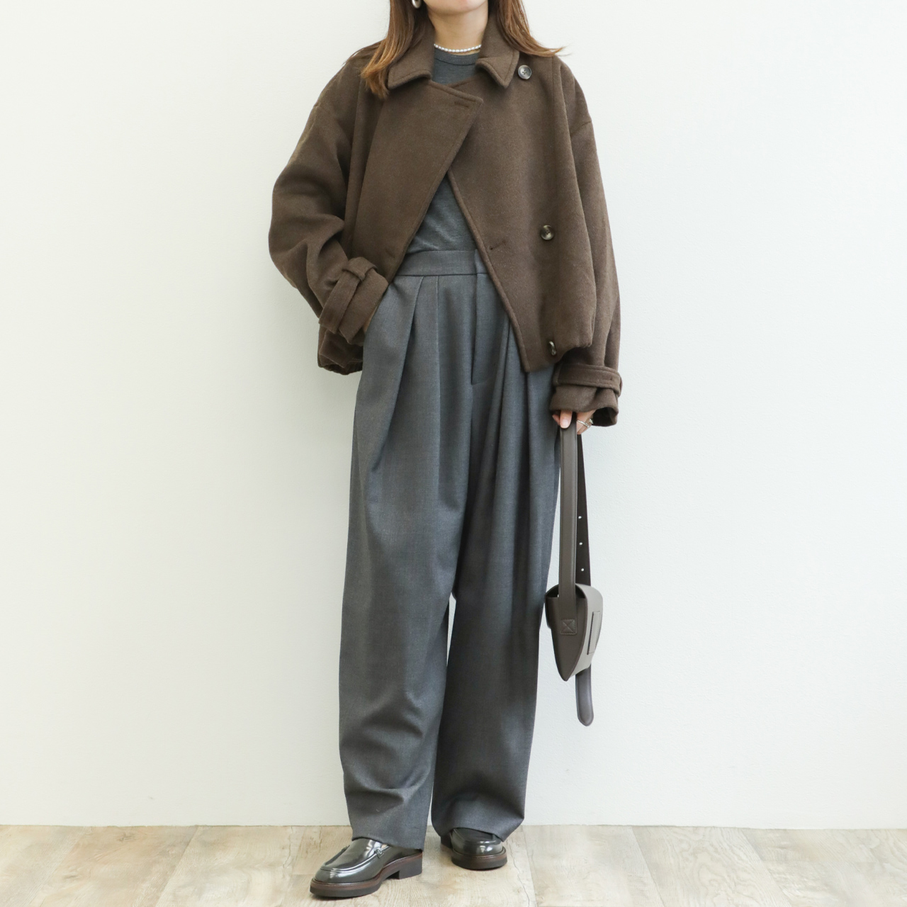 パンツでもスカートでもワンピースでも合わせられる万能なデザイン。ショート丈~ロング丈まで丈感も問わずに合わせられる万能さも是非ご体感ください。
