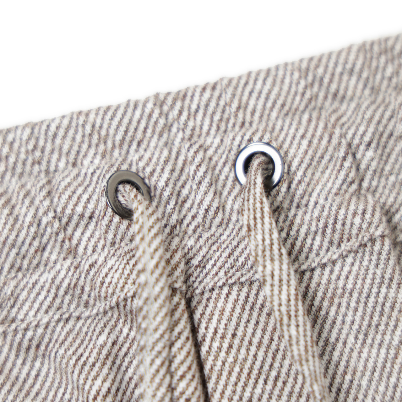 天然素材ならではの通気性と吸湿性があり、ウエストゴム+ドローコードのイージー仕様になっておりますので、ストレスのない快適な着心地を実現。