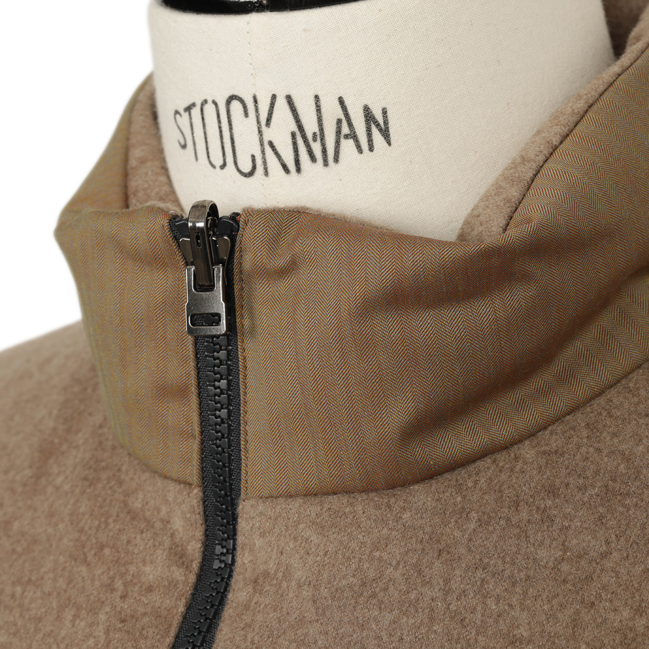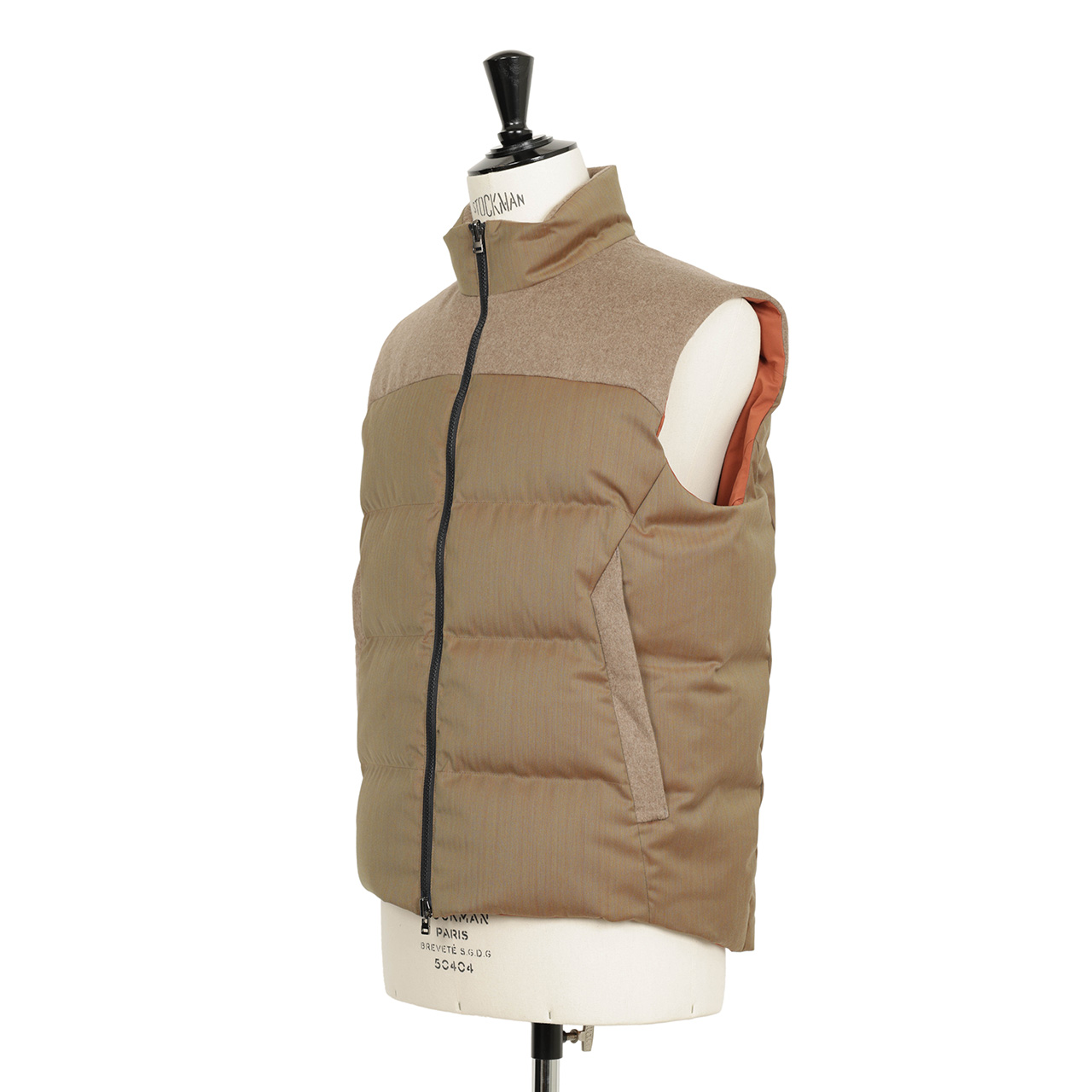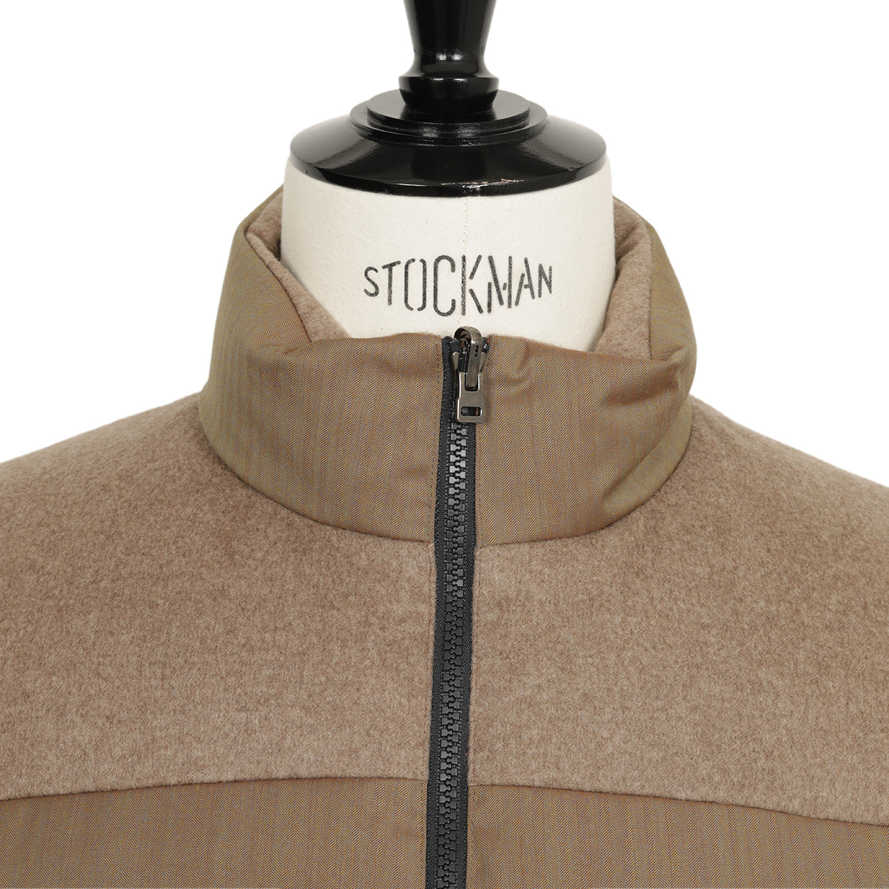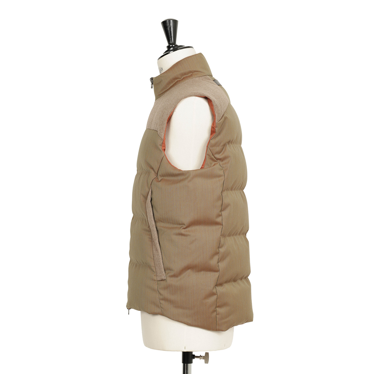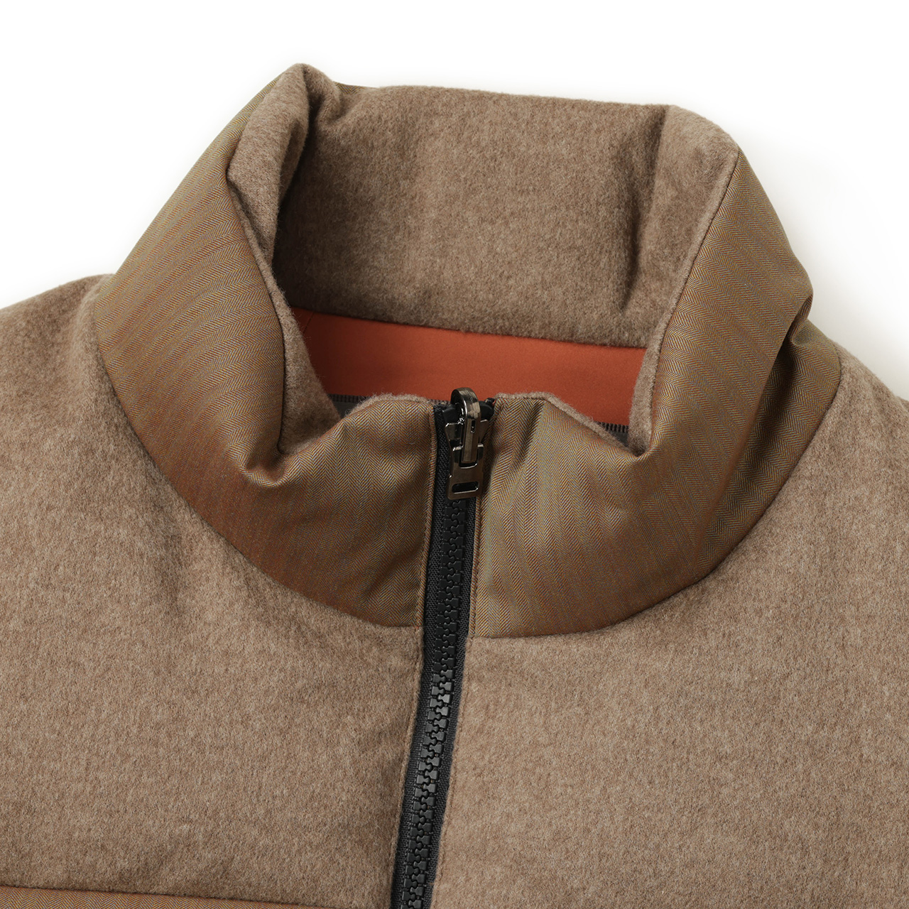 内襟、ポケット、肩の部分は品のあるベージュカラーのカシミヤのネル生地で切り替え。上質素材によるワントーンの切り替えでラグジュアリーな雰囲気にまとめています。