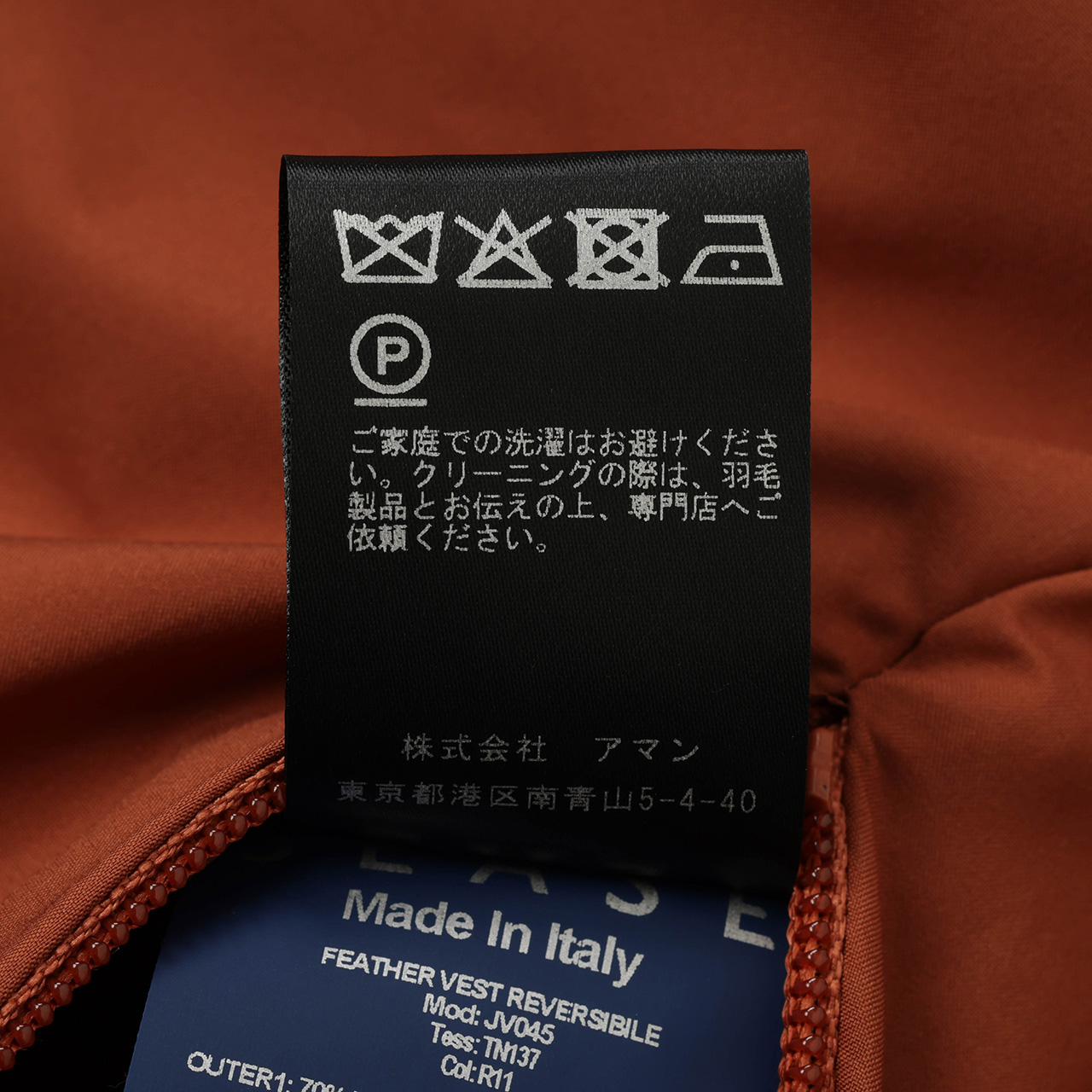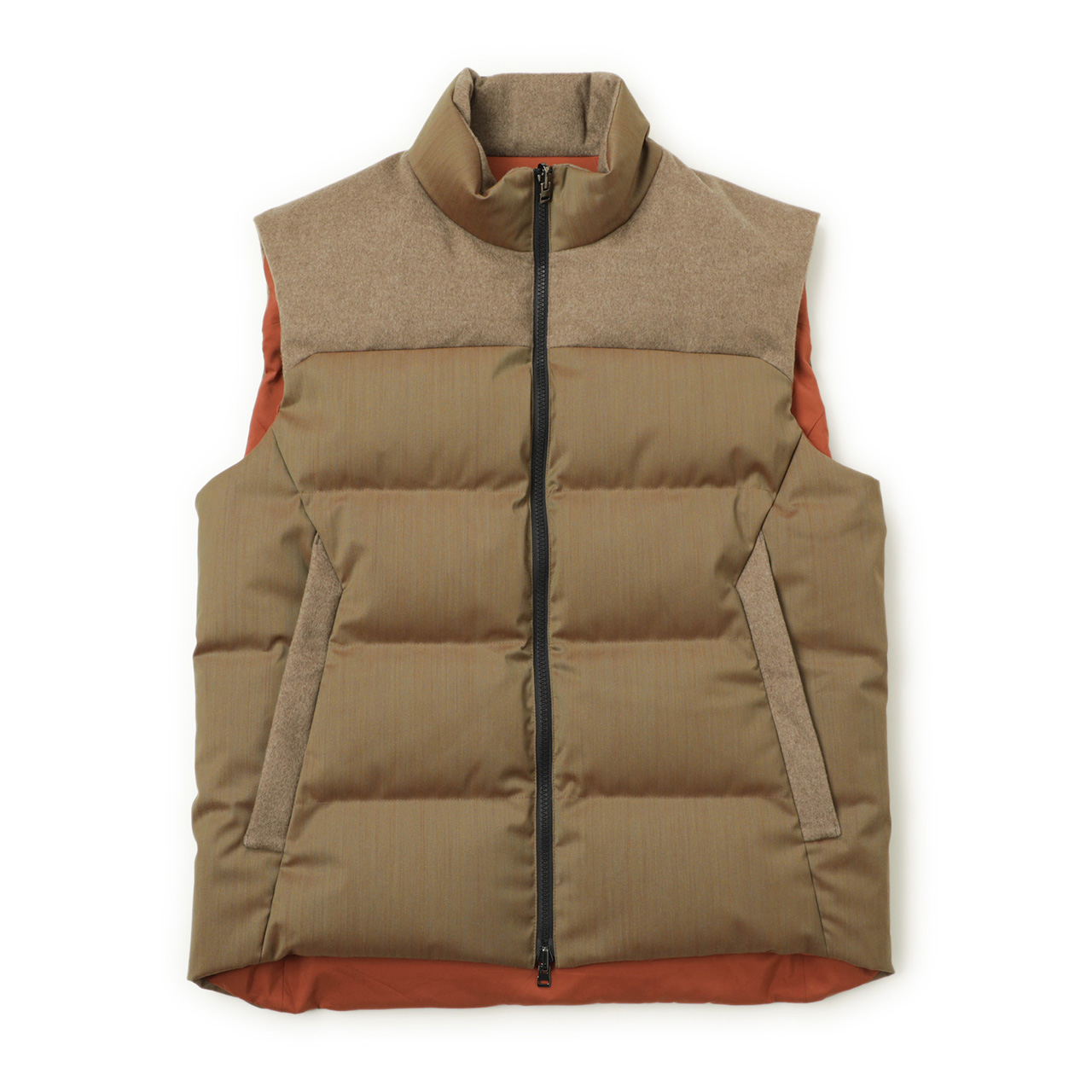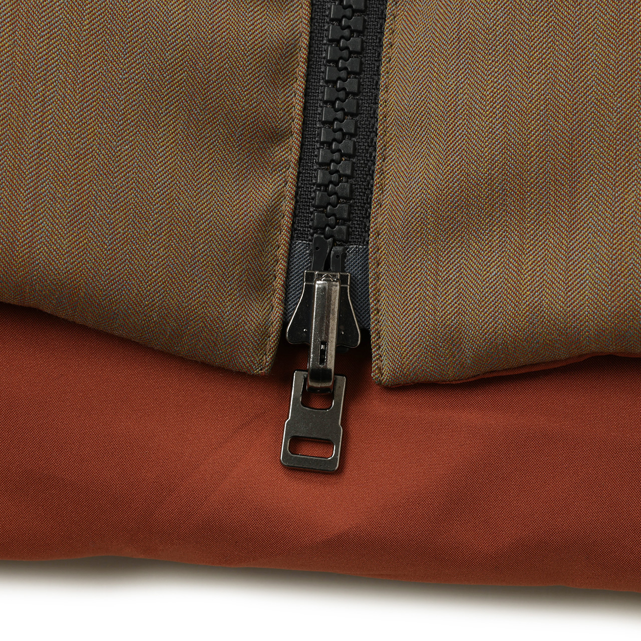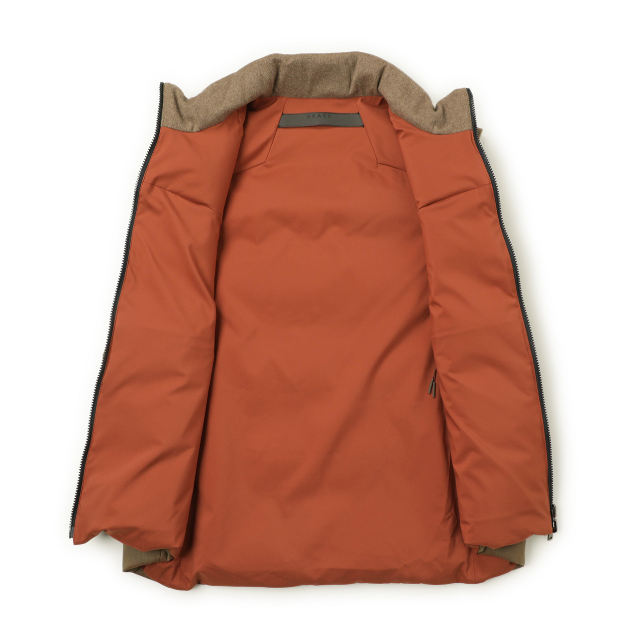 裏面は同じくブラウン系、テラコッタカラーのポリエステル生地を使用。ポケットのジップも極力見せないミニマルな縫製で、表面とはガラッと変わった見た目に。