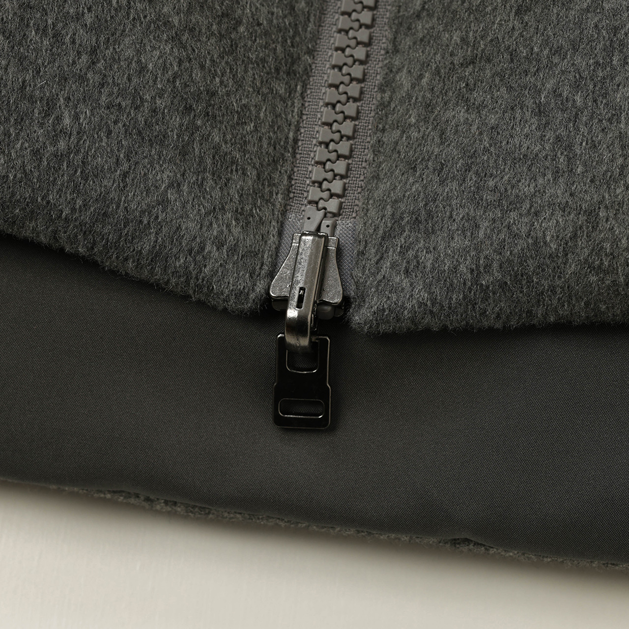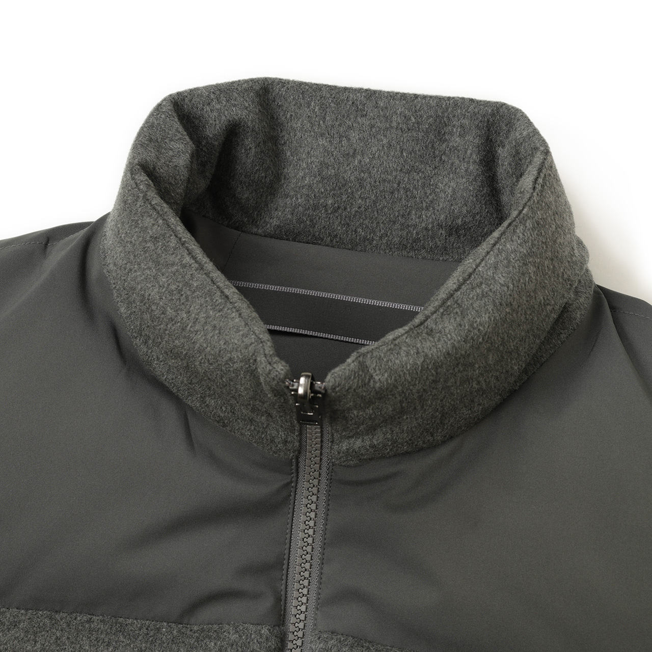 ヨーク部分、リバーシブルで使える裏地は同色グレーのポリエステル生地を使用。落ち着いたワントーンでまとめた一着は大人のカジュアルスタイルにピッタリとはまります。