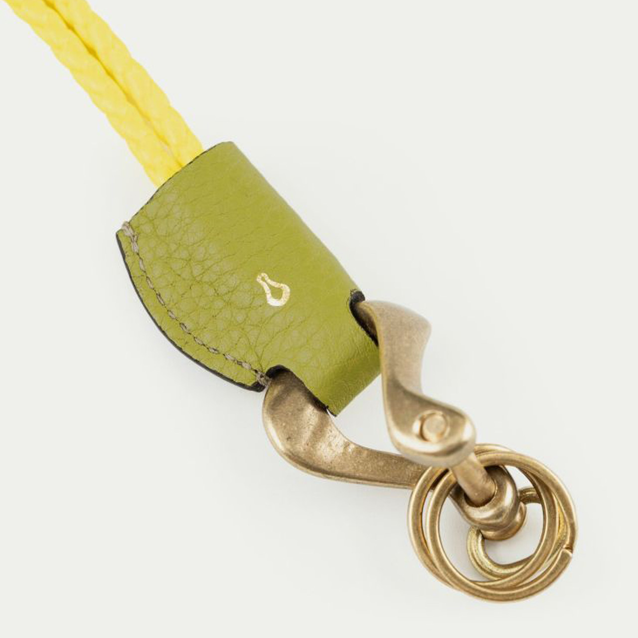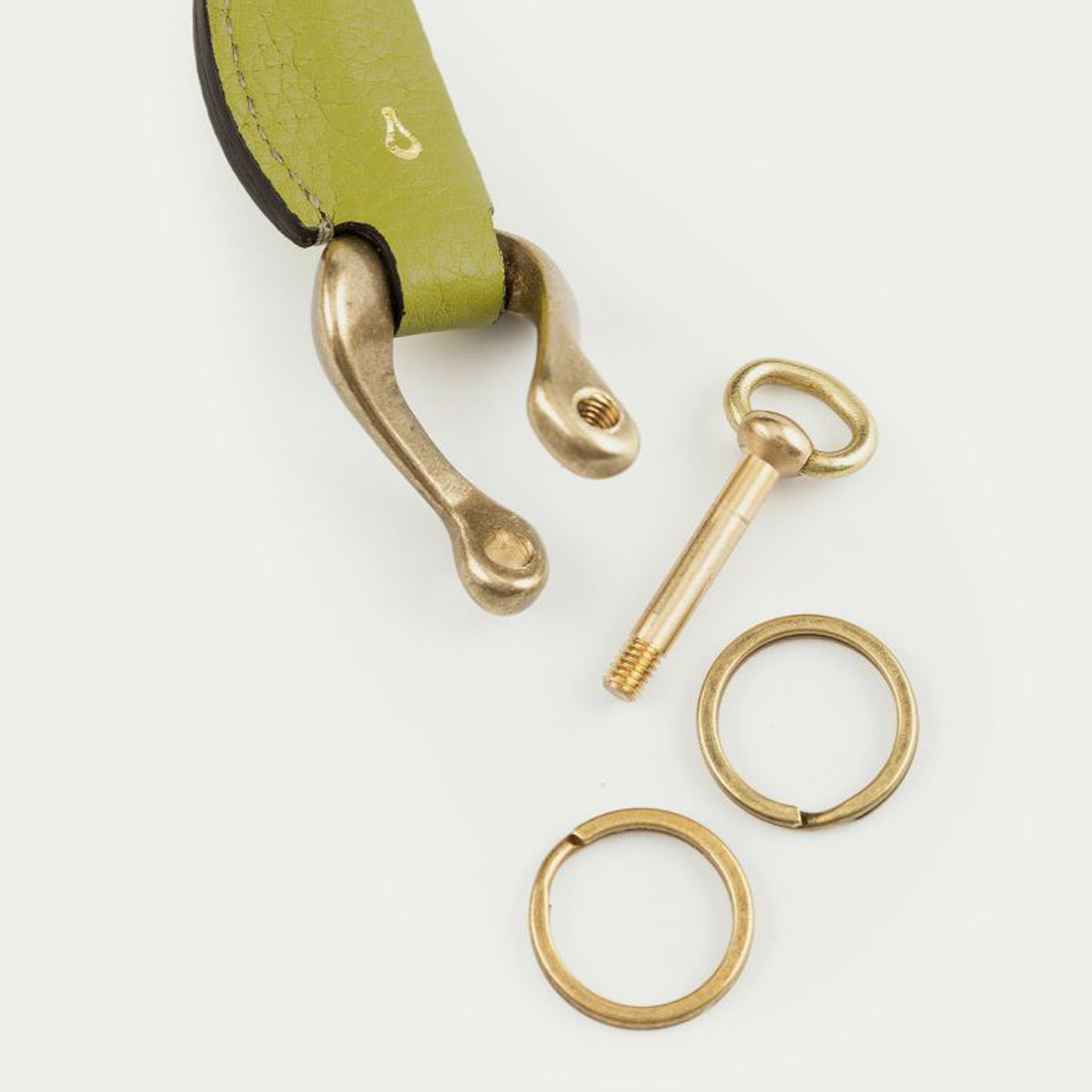 先端のメインパーツは、ドライバーなどを使わずに指でネジを着脱できる、シャックル機能付きのオリジナル真鍮金具で、ひねりが加えられた造形の美しさが個性的。