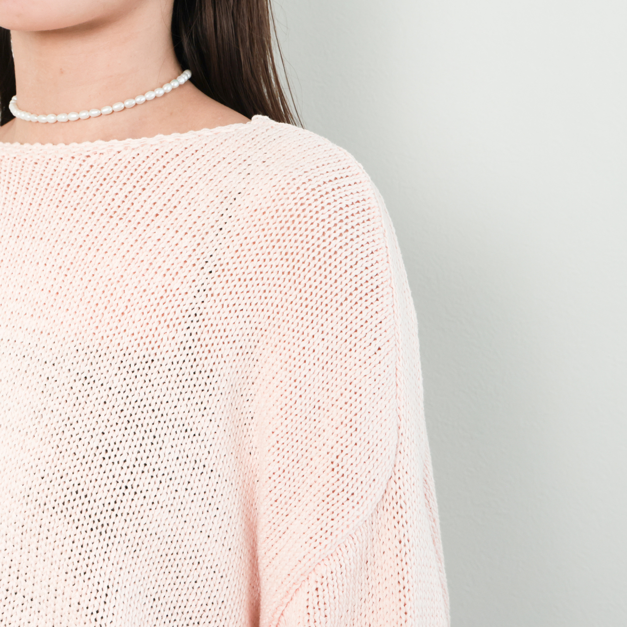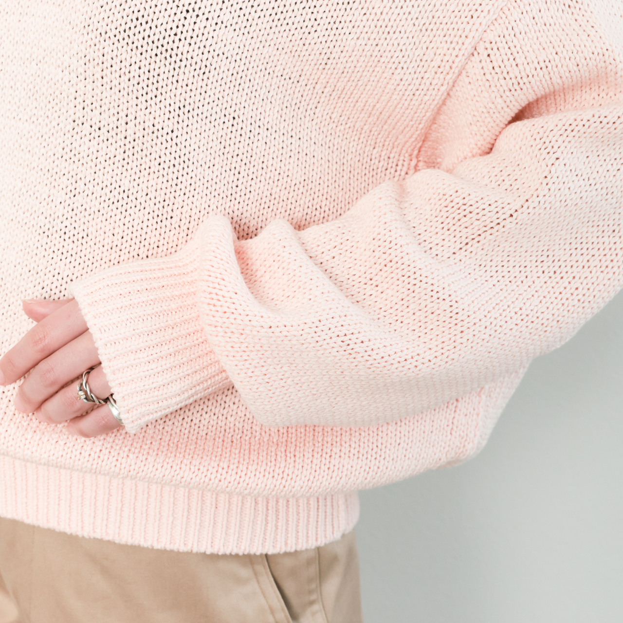 カラーはグレージュとピンクの2色をご用意。ボトムスはきれいめ、カジュアル問わずパンツからスカートまで悩まずにコーディネートしてOK。
