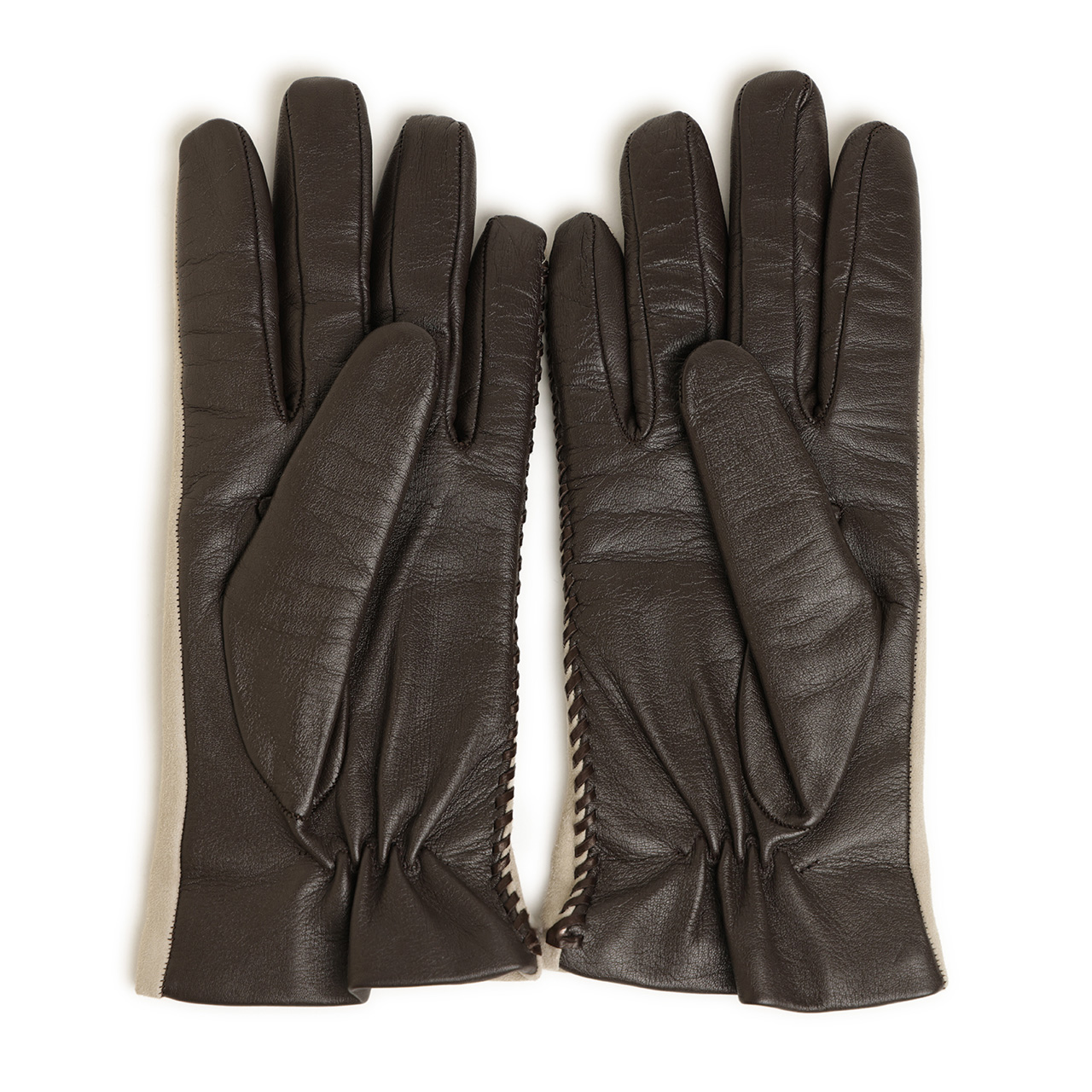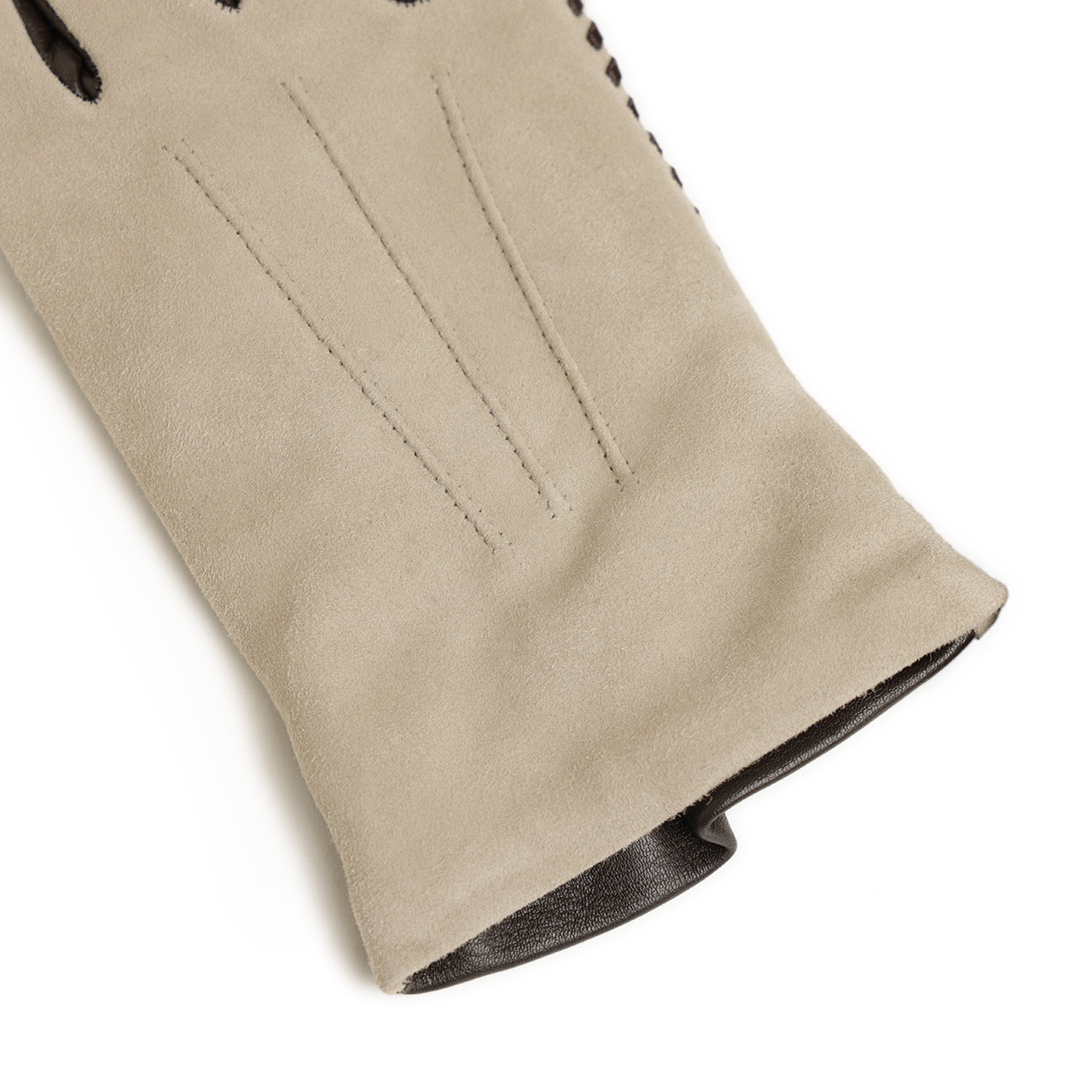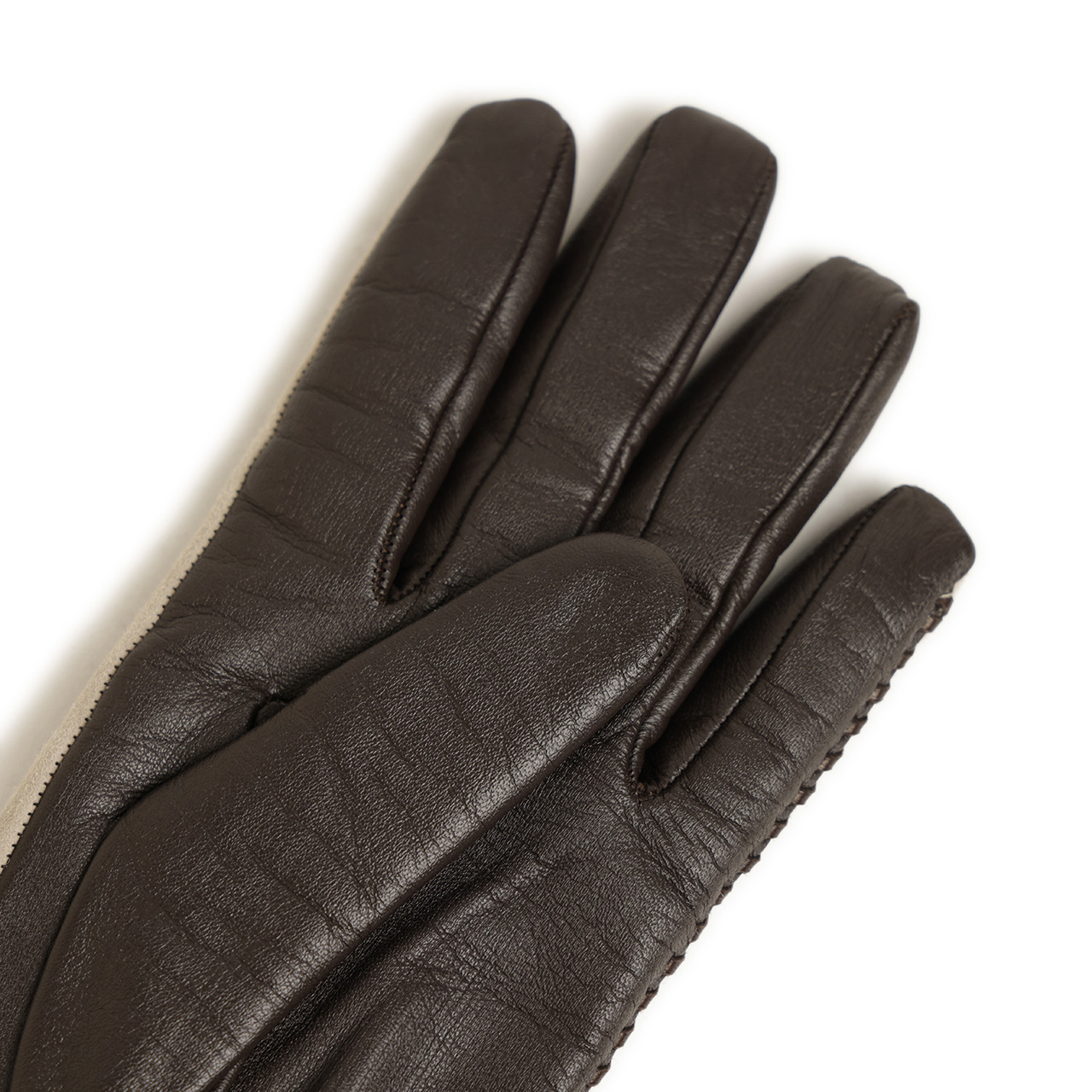 甲側にスエード、手のひら側にラムレザーを使用し素材切り替えを施した本モデル。きめ細かくソフトなレザーは手を通すごとにご自身の手に馴染み、まるでグローブをはめている事すら忘れさせてくれる着用感。