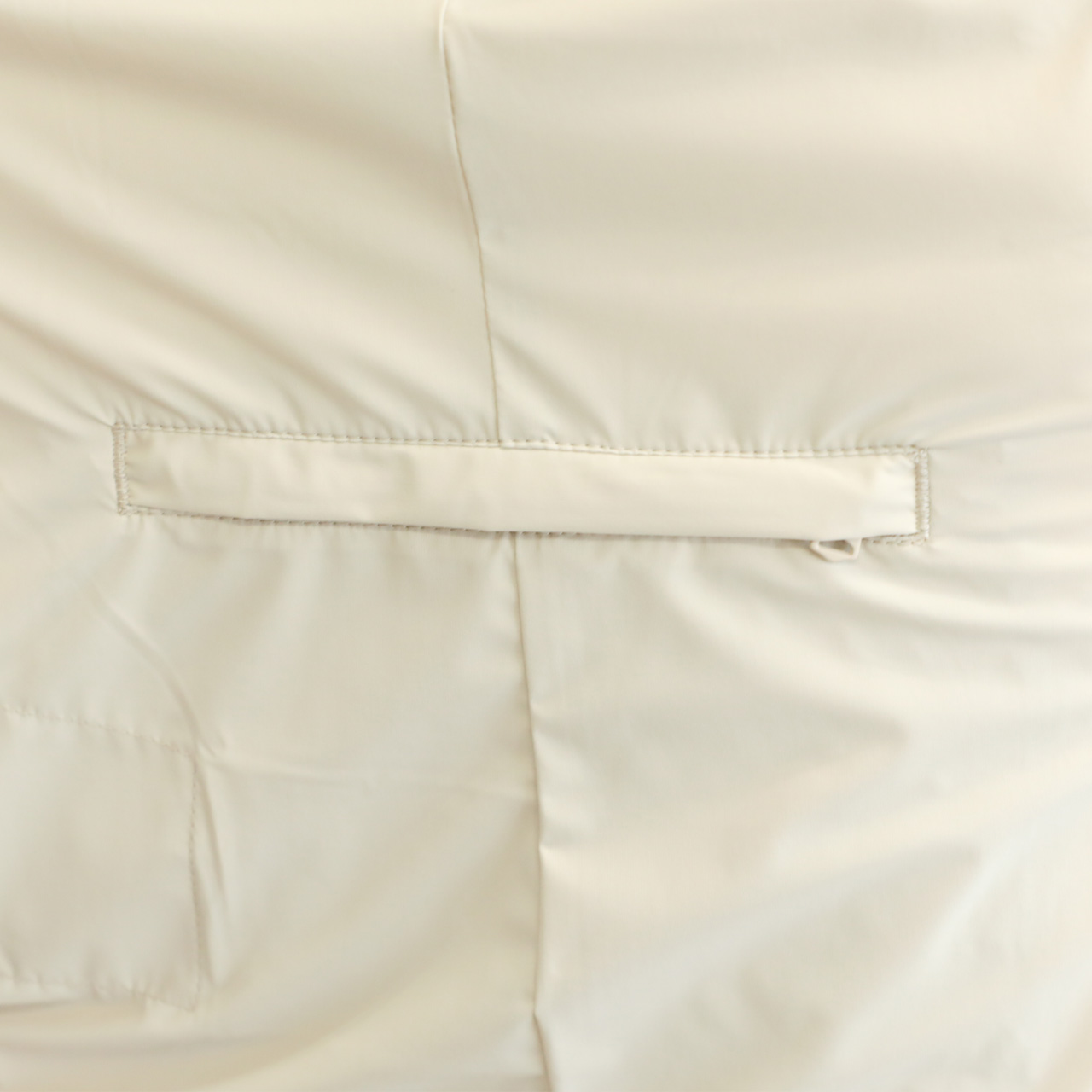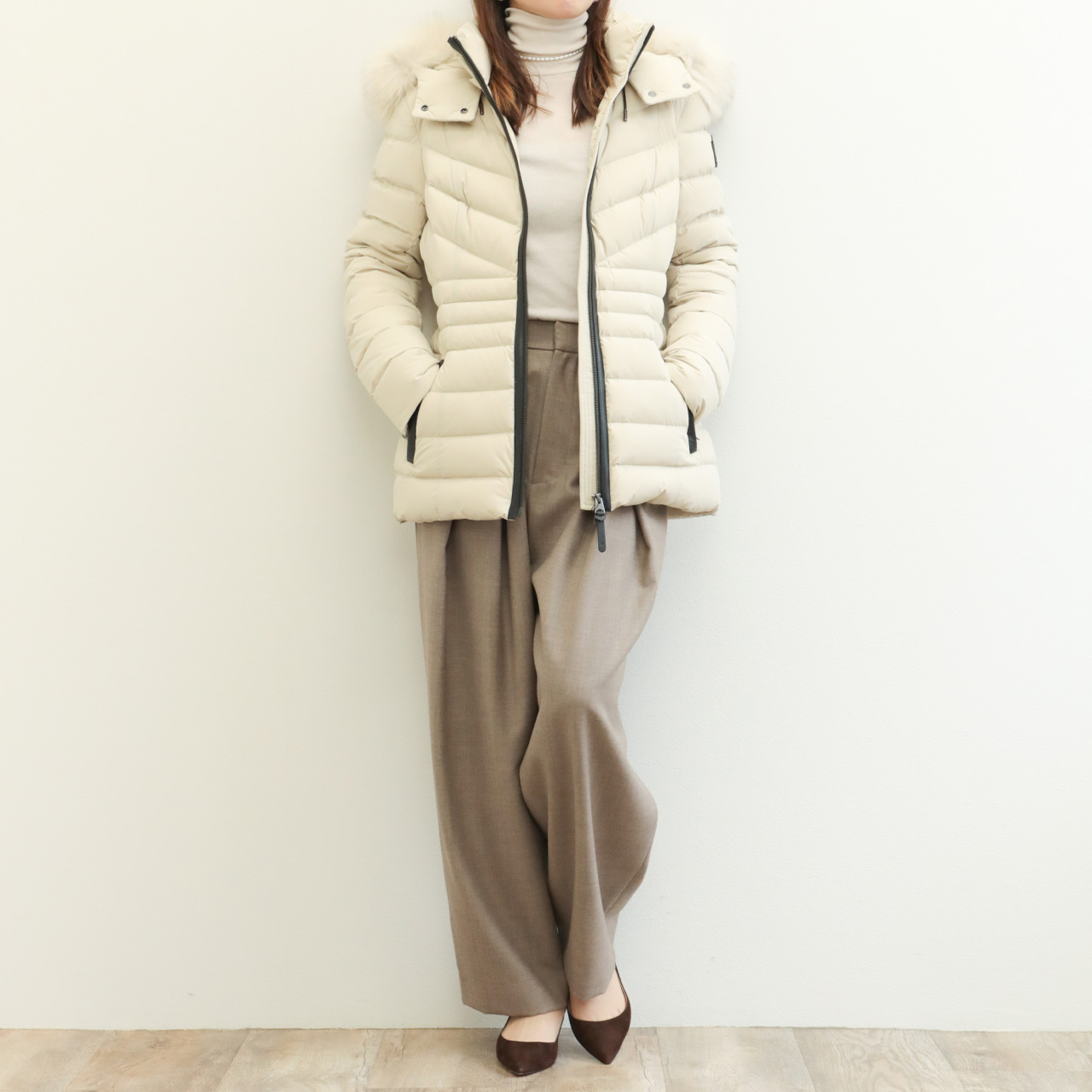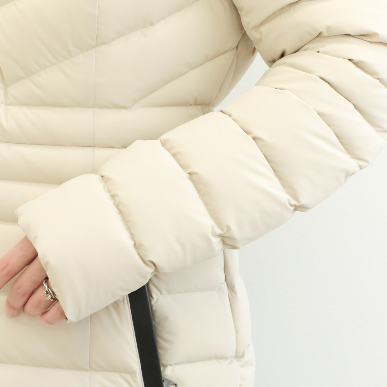 生地と共に特徴的なのがこちらのシルエット。ストレッチ素材を使用しているからこその絞りの効いたウエストシェイプ。ダウンとは思えないほど着ぶくれ感なくすっきりと着ていただけます。