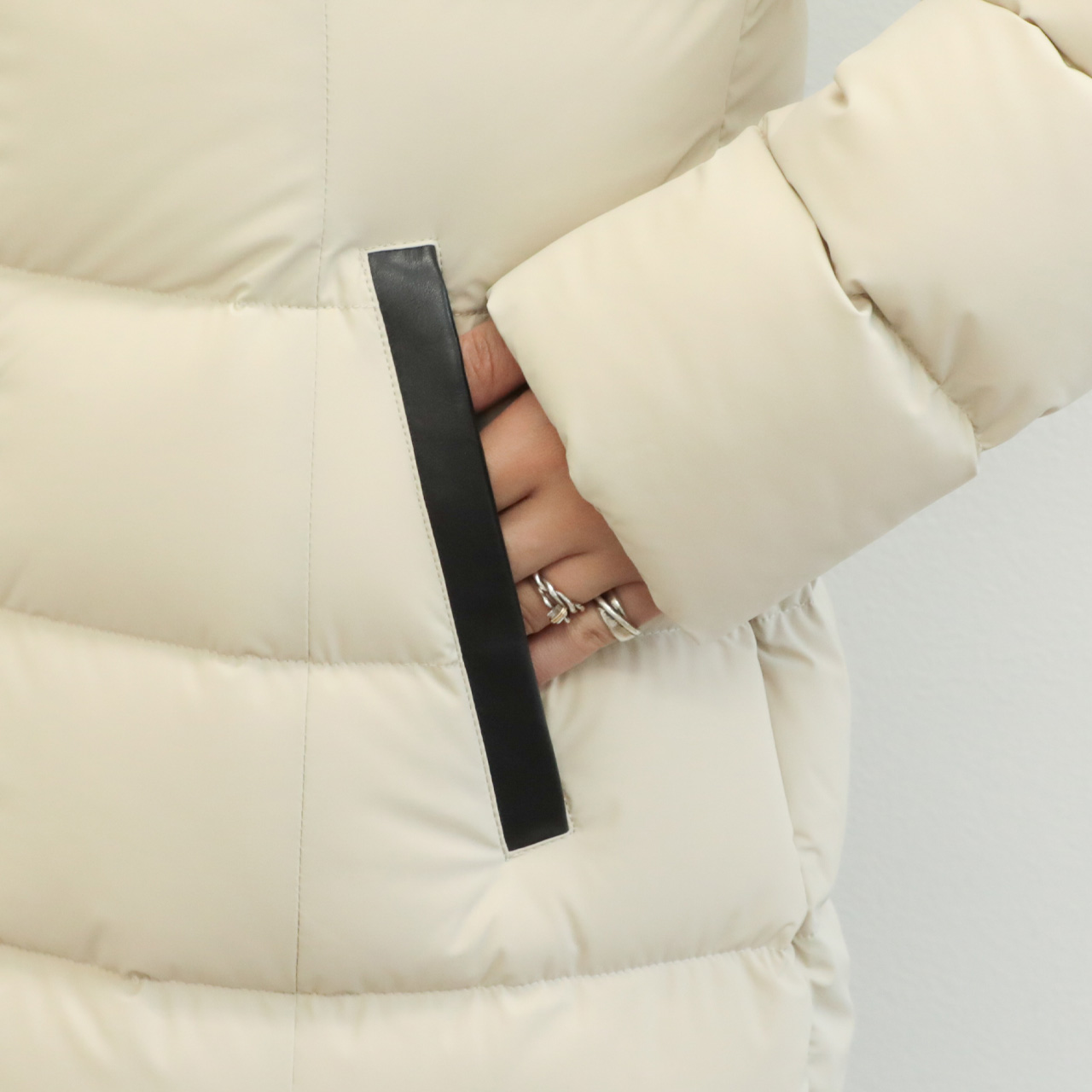 生地と共に特徴的なのがこちらのシルエット。ストレッチ素材を使用しているからこその絞りの効いたウエストシェイプ。ダウンとは思えないほど着ぶくれ感なくすっきりと着ていただけます。