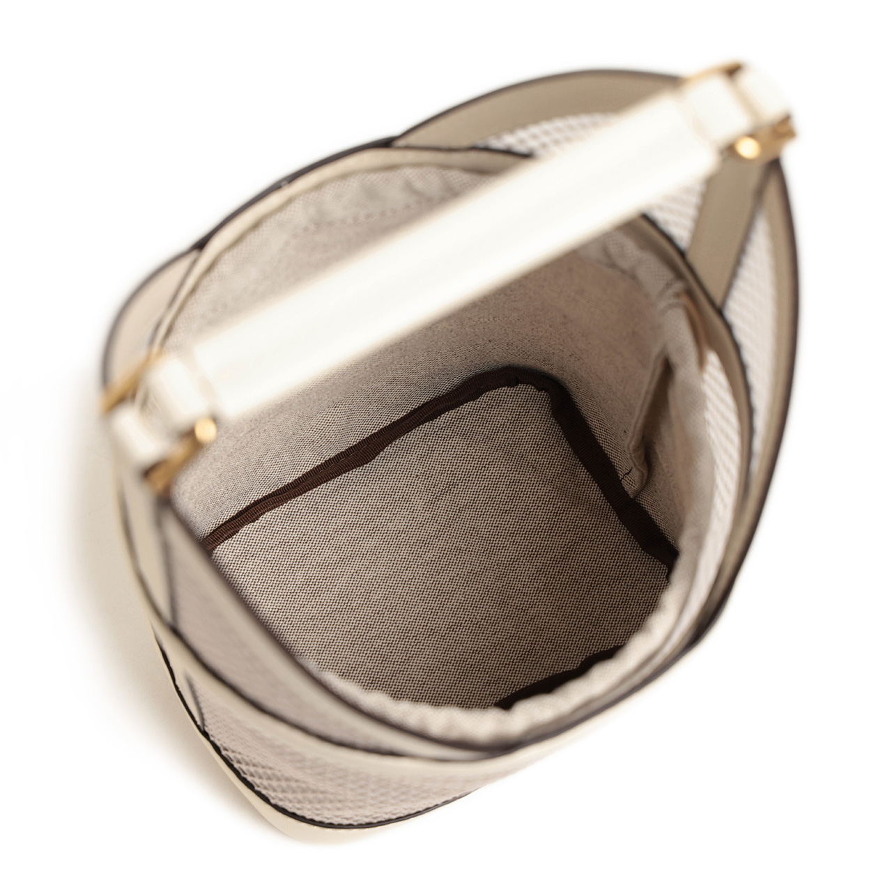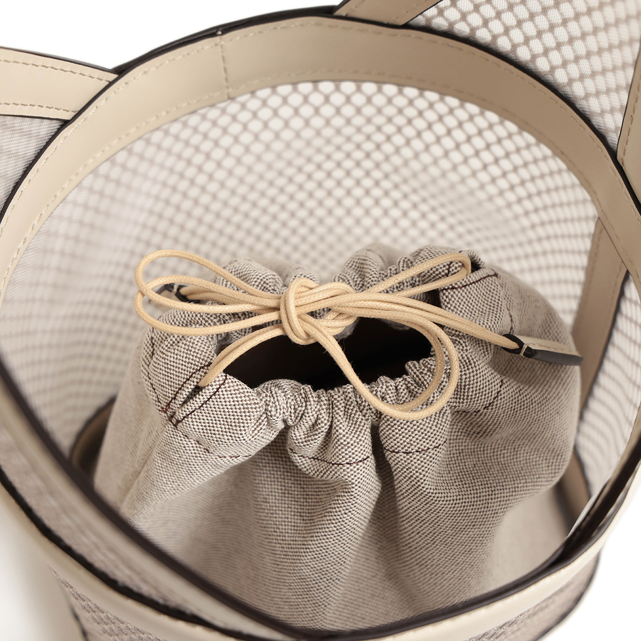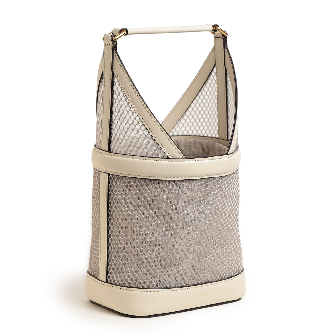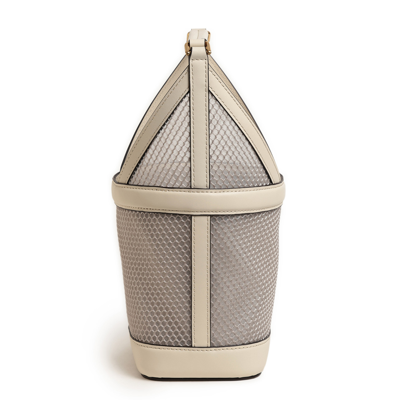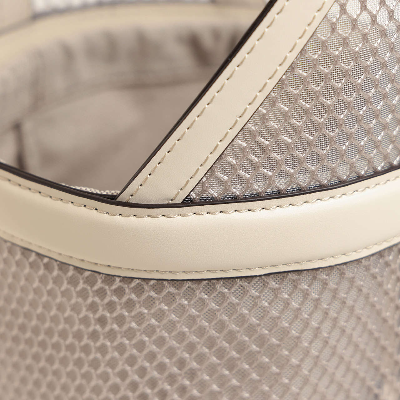 こちらは素材切り替えがポイントとなったハンドバッグ。メッシュ素材をベースにし、レザーで切り替えを施した軽やかかつきれいめなデザイン。ゴールドの金具使いも上品さを後押しします。