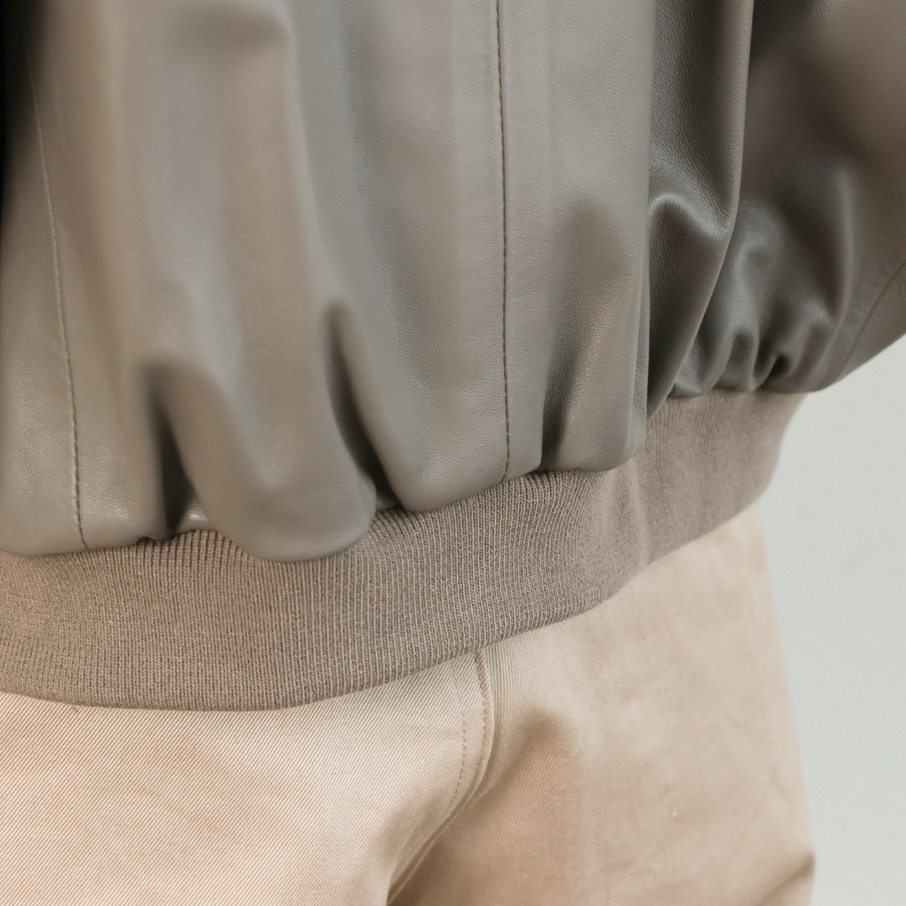 レザーでドルマンスリーブを作るとするならば、求められるのが革の柔らかさ。白羽の矢がたったのがEMMETIが展開するレザーで1,2を争う薄さのナッパシルク(0.5mm厚)。