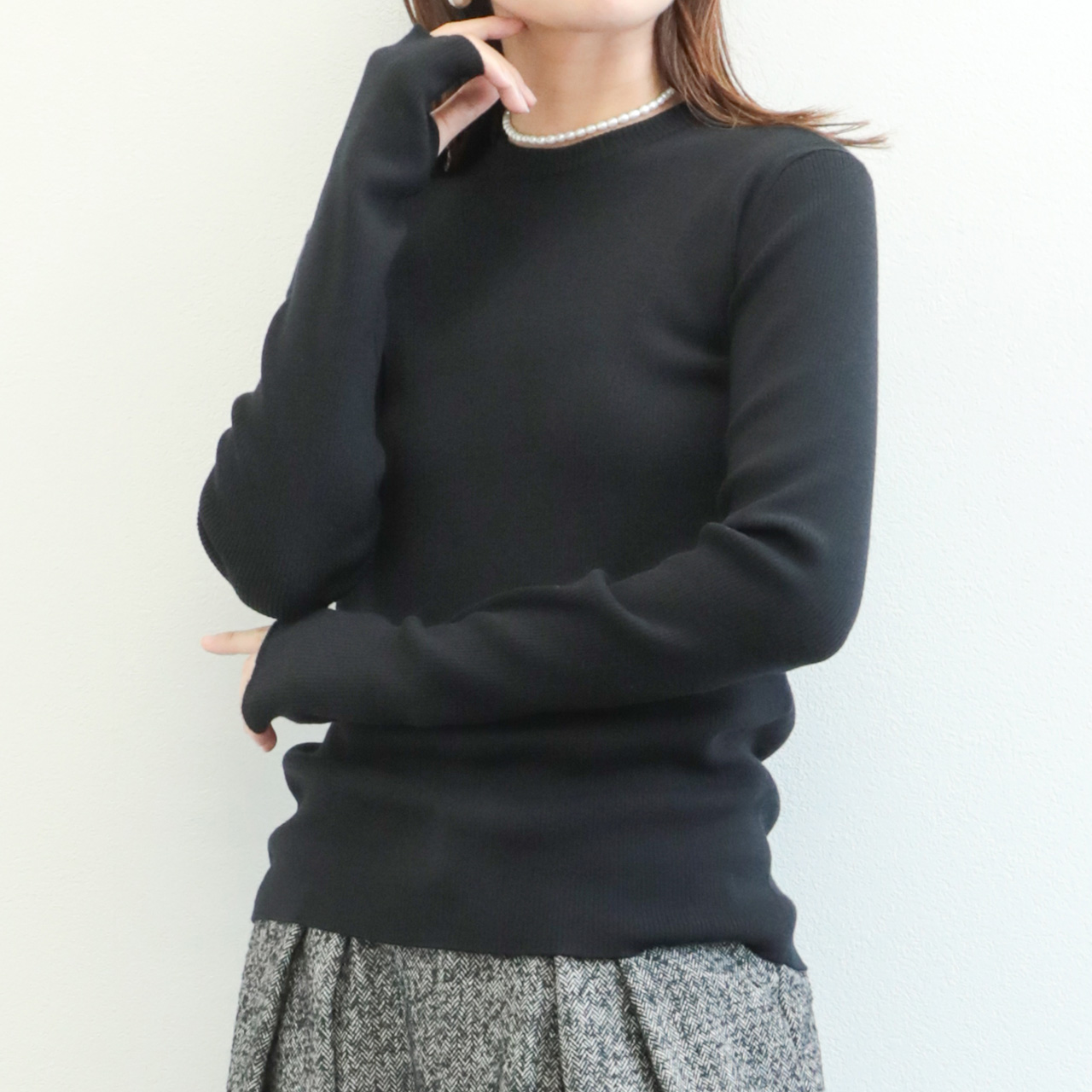 LOWER ローヴァー レディース ニット 長袖 ウール メリノ スーパーエクストラファイン Super 140's リブ ストレッチ 丸首 クルーネック 18G Ribbed Crewneck Pullover LW-43 BLACK/ブラック