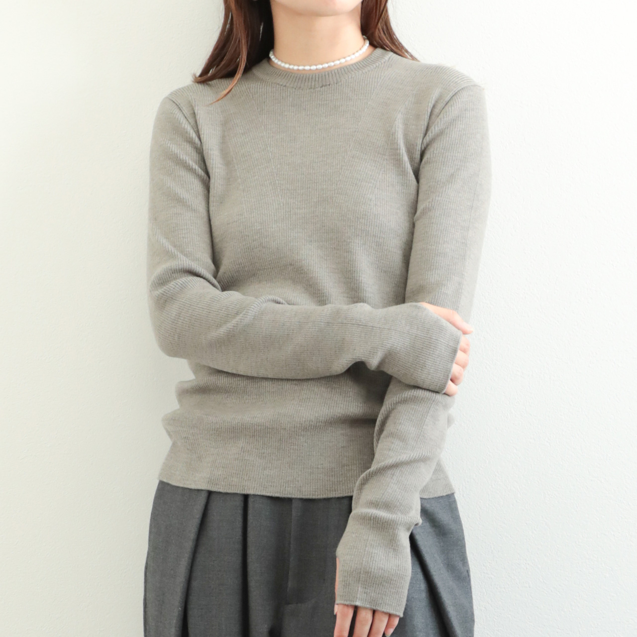 LOWER ローヴァー レディース ニット 長袖 ウール メリノ スーパーエクストラファイン Super 140's リブ ストレッチ 丸首 クルーネック 18G Ribbed Crewneck Pullover LW-43 CUT STONE/グレー