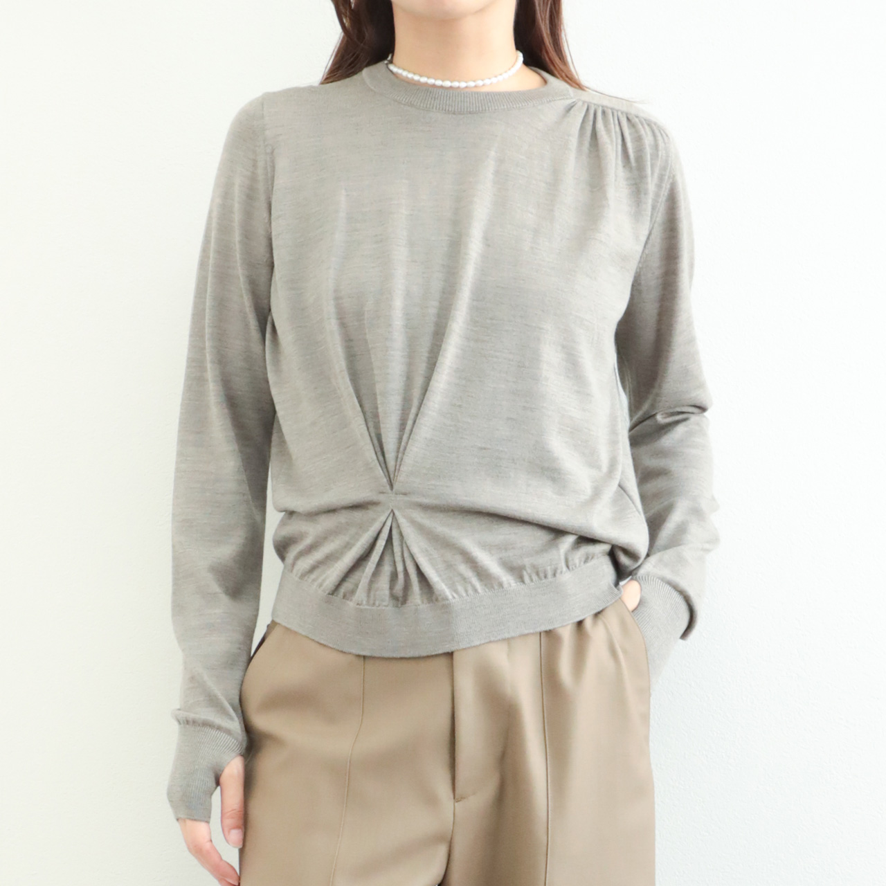 LOWER ローヴァー レディース ニット 長袖 ウール メリノ スーパーエクストラファイン Super 140's リブ 丸首 クルーネック ギャザー タック 18G Plainstitch asmmetry drape pullover LW-45 CUT STONE/グレー