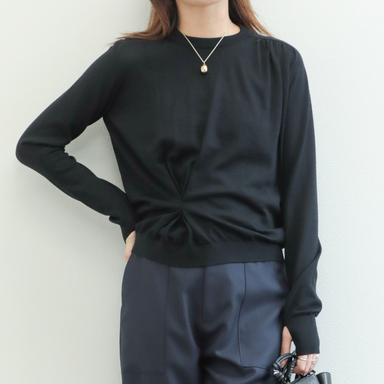 LOWER ローヴァー レディース ニット 長袖 ウール メリノ スーパーエクストラファイン Super 140's リブ 丸首 クルーネック ギャザー タック 18G Plainstitch asmmetry drape pullover LW-45 BLACK/ブラック