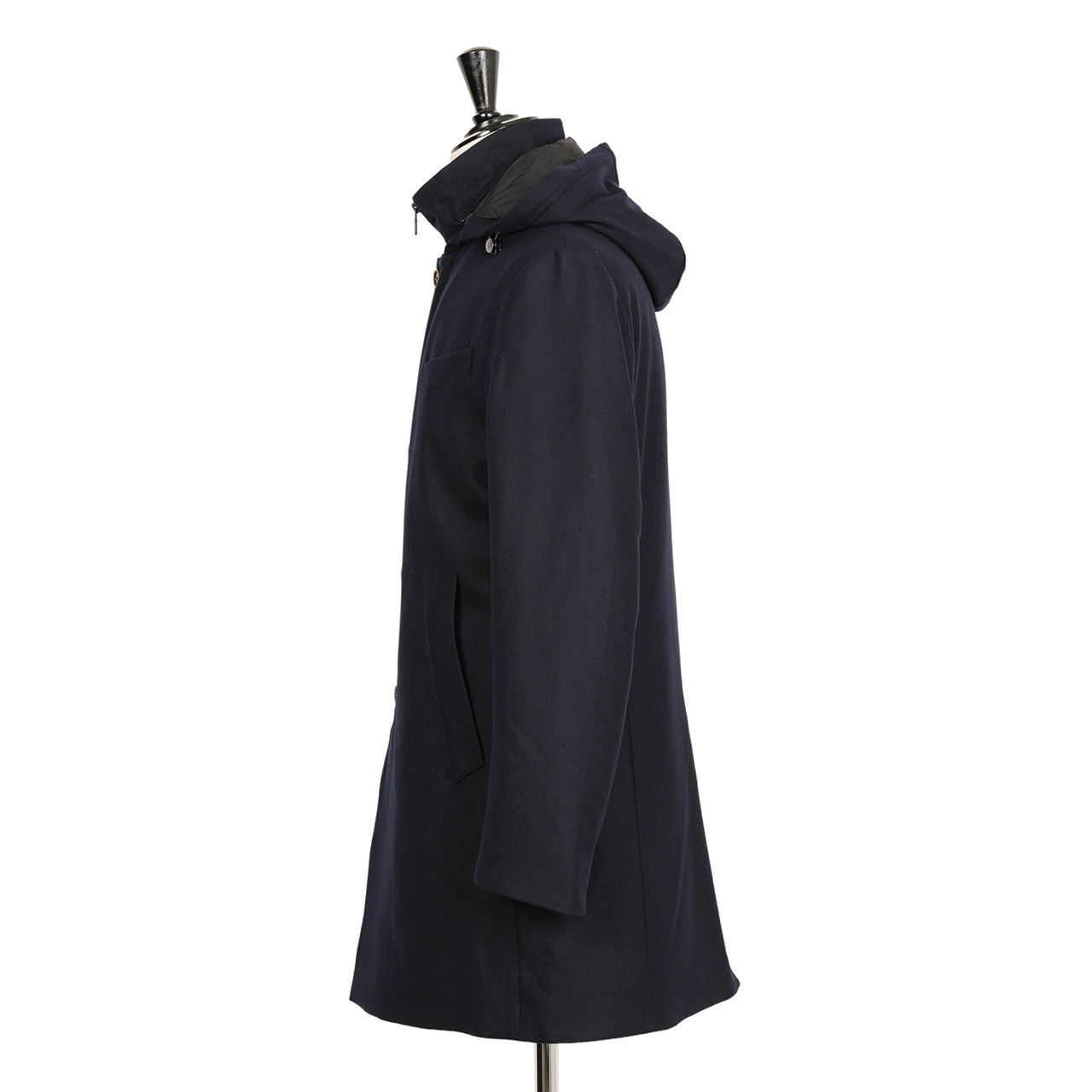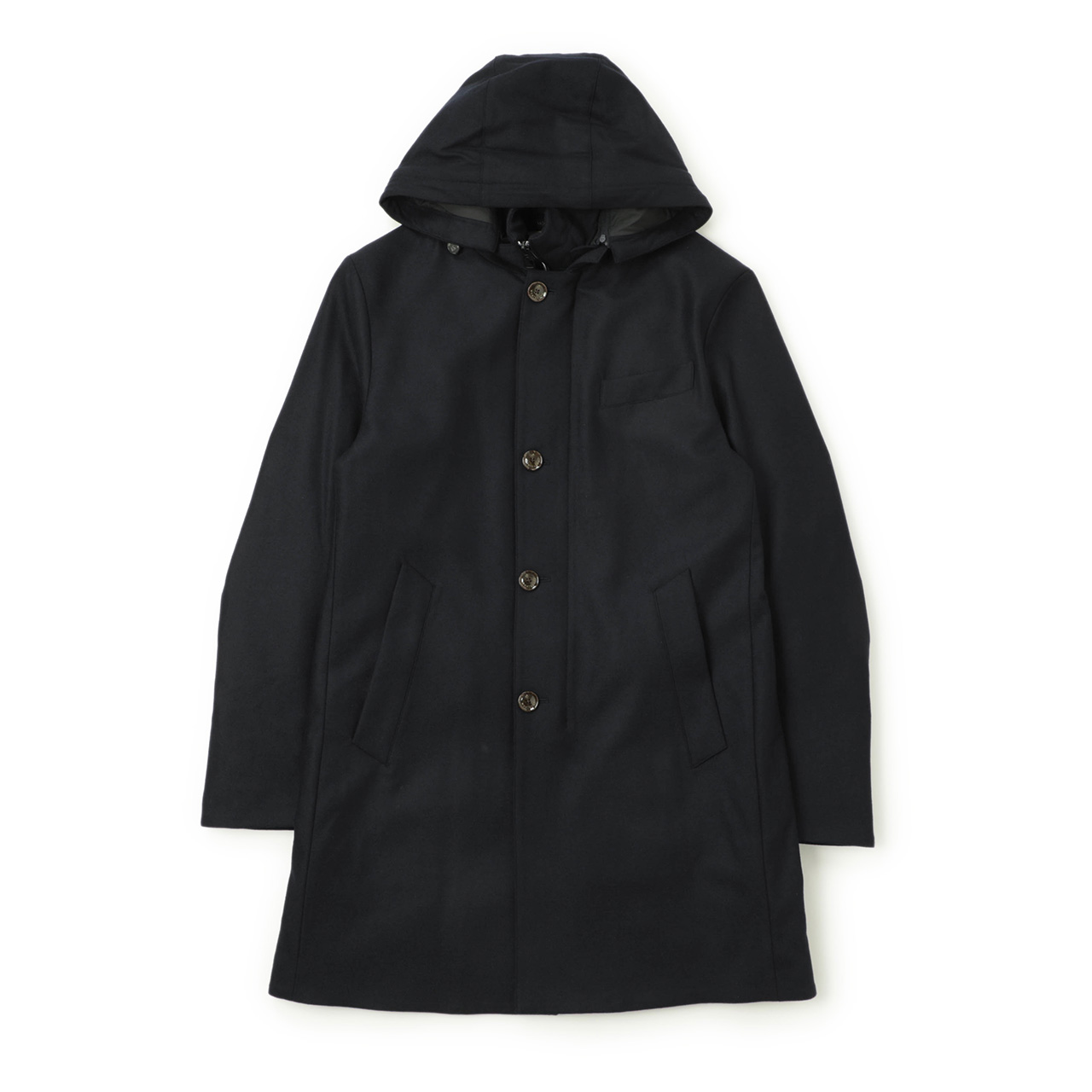 伝統的に培ったテーラード技術をベースとしたもの作りから生まれるシルエットの美しさにも注目。前立て部分はボタンで、フードはジップで取り外し可能ですので、シーズンやスタイル、シーンに応じて見せ方を変えることが可能です。