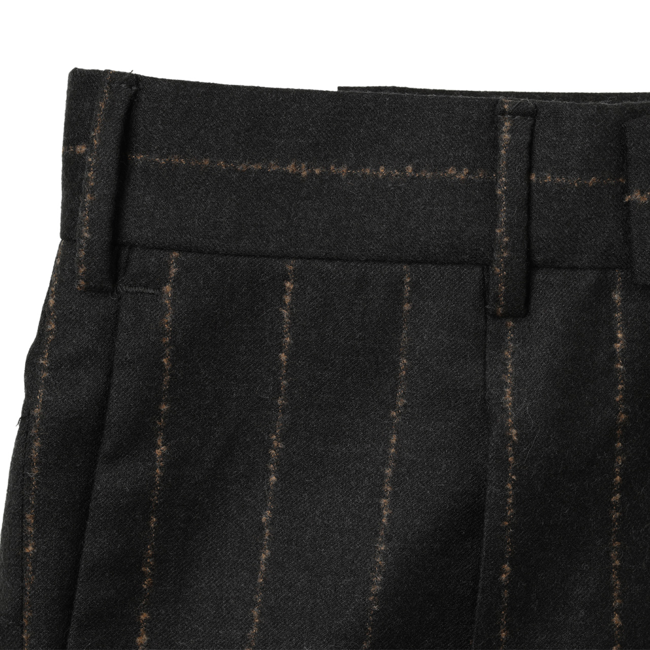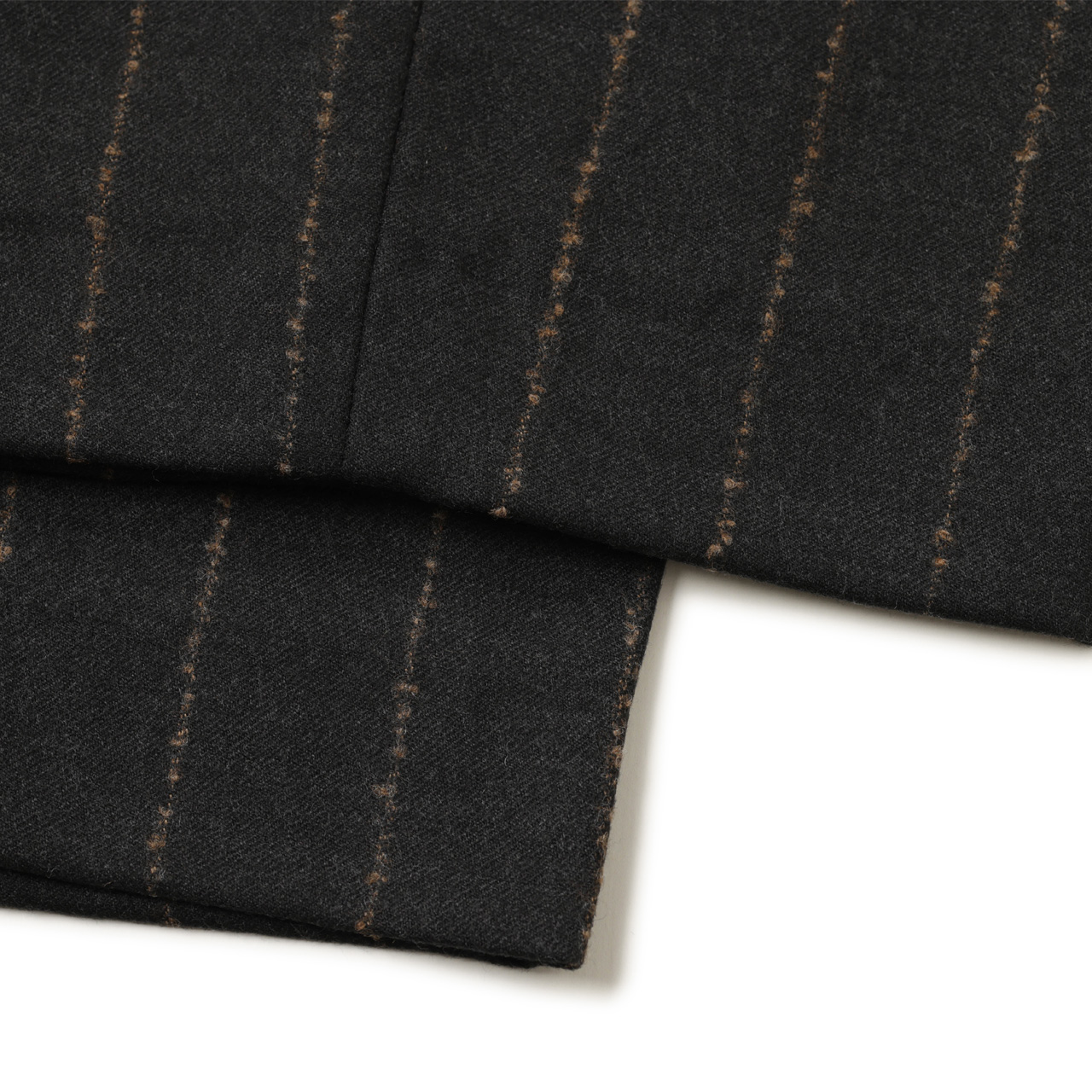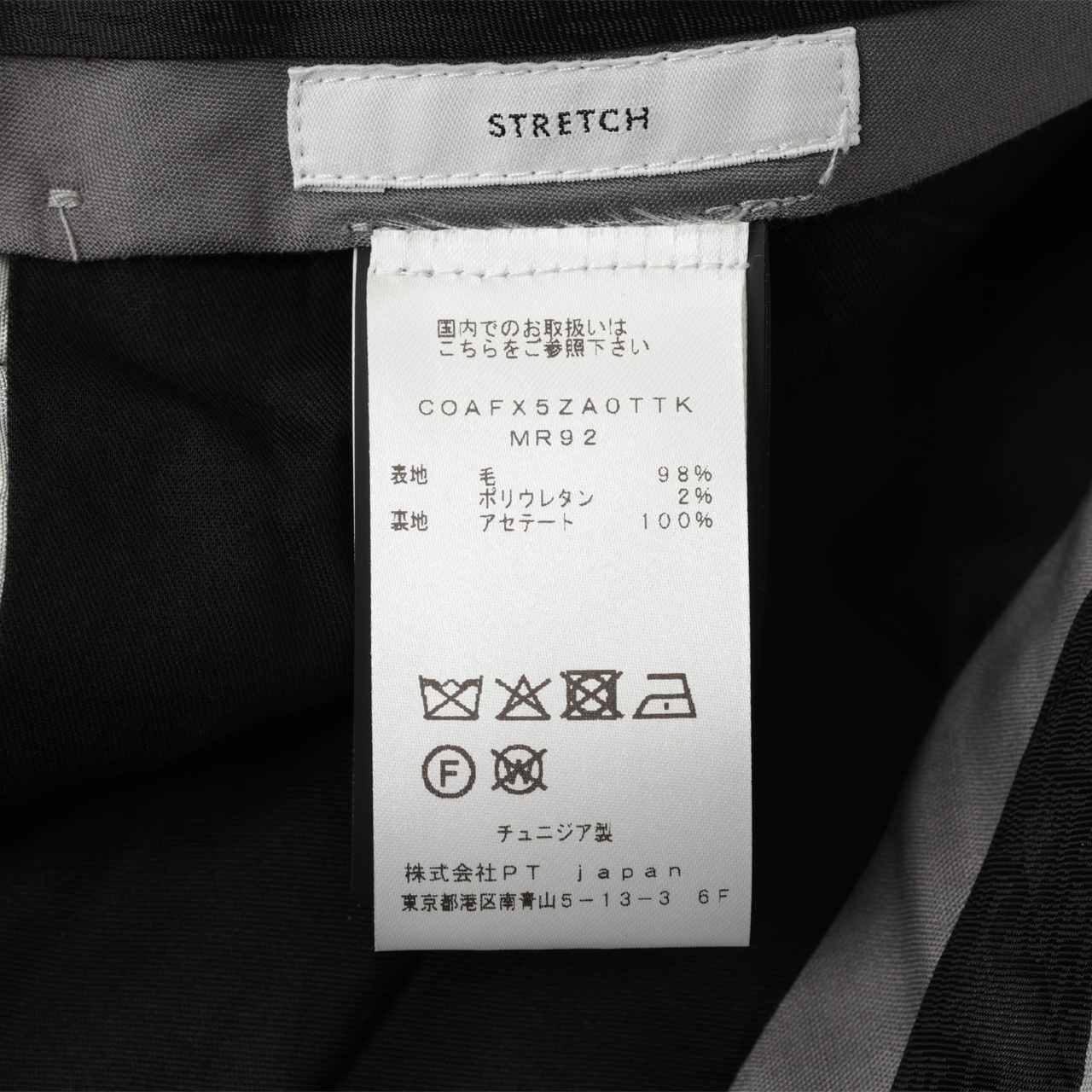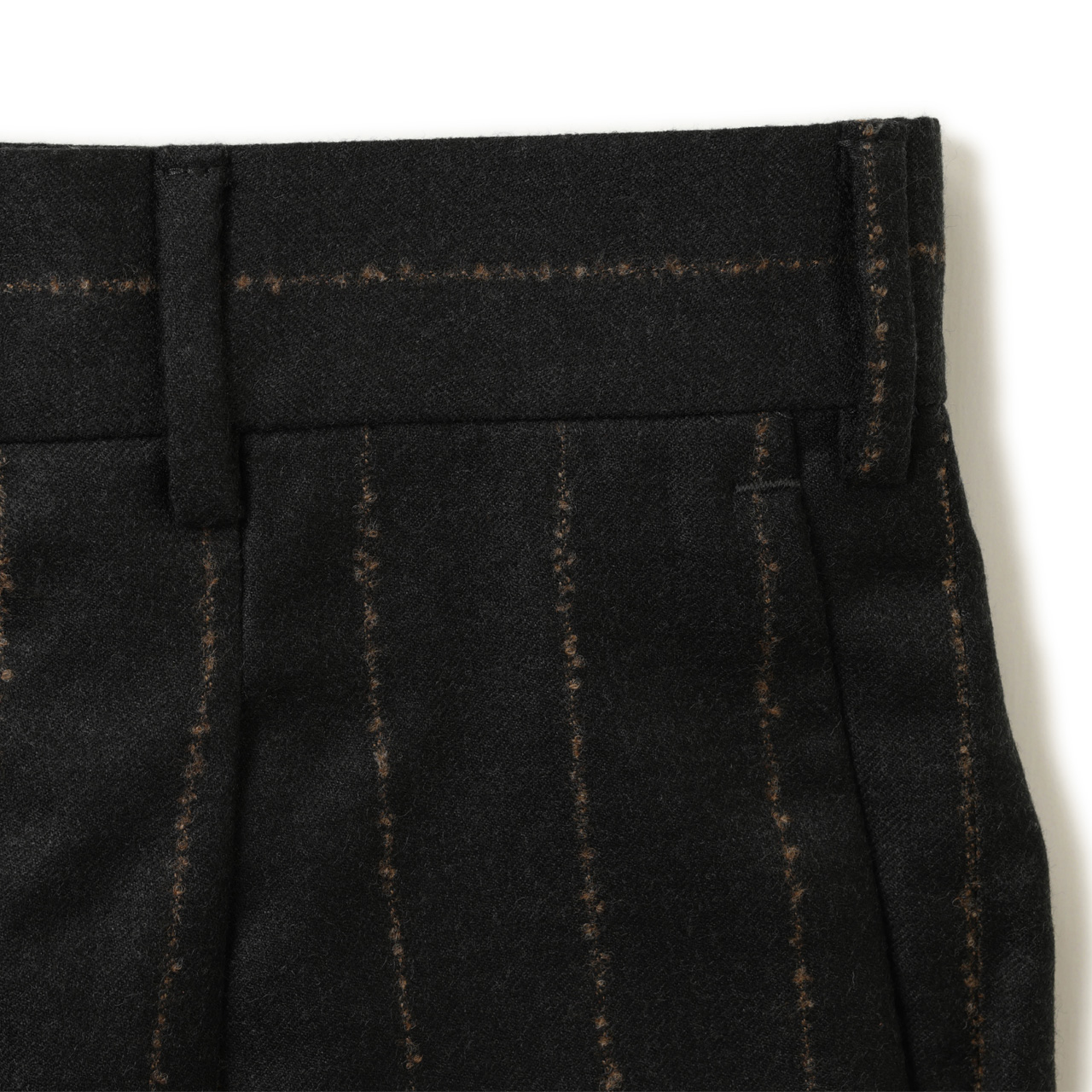 素材はストレッチウール。滑らかな中に秋冬らしい起毛感、そしてソフトな生地感の上質なウール素材をベースにブークレ調のブラウンのストライプがスタイリングにアクセントをプラスしてくれます。