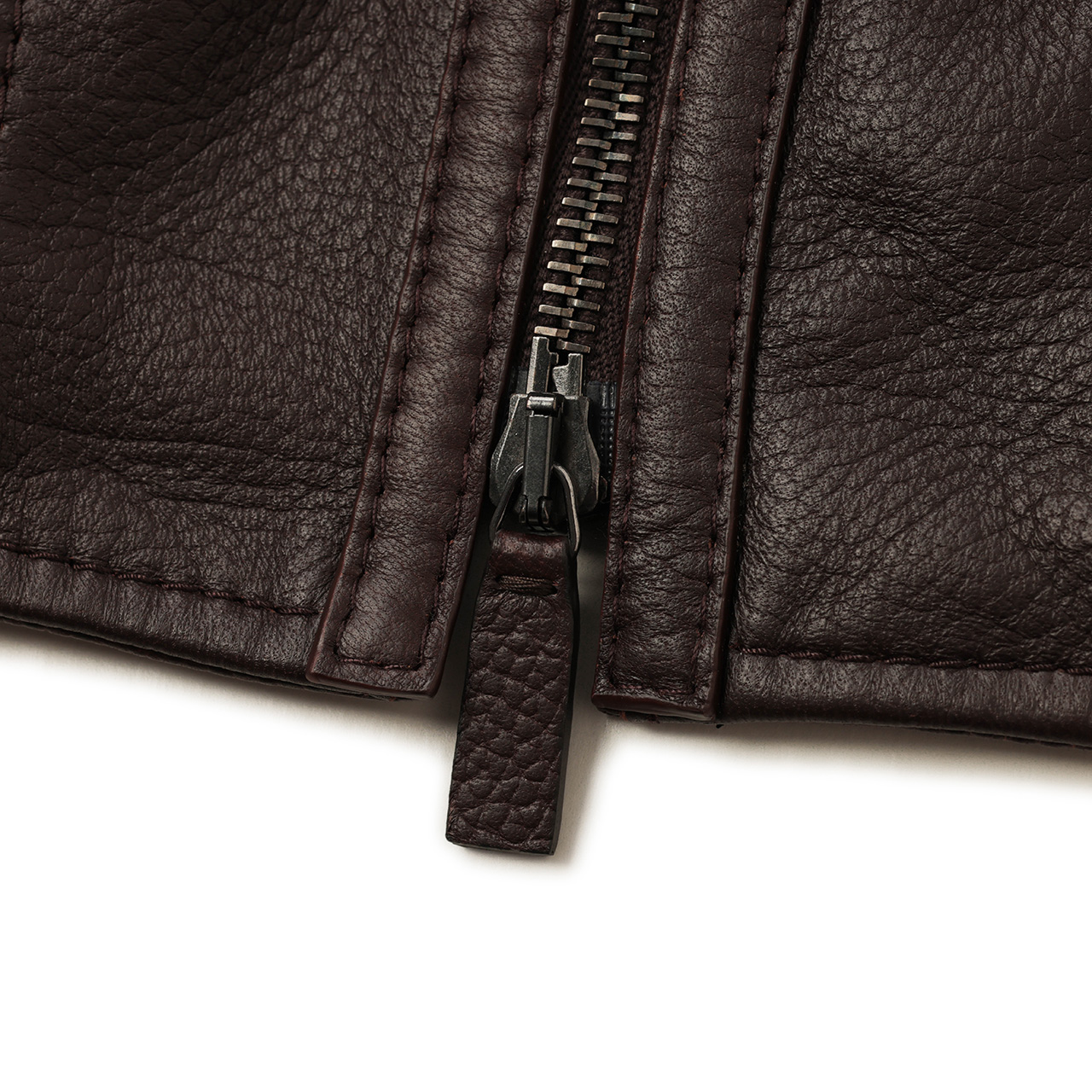 レザー×ボルドーの色合いは都会的な羽織りに最適です。
