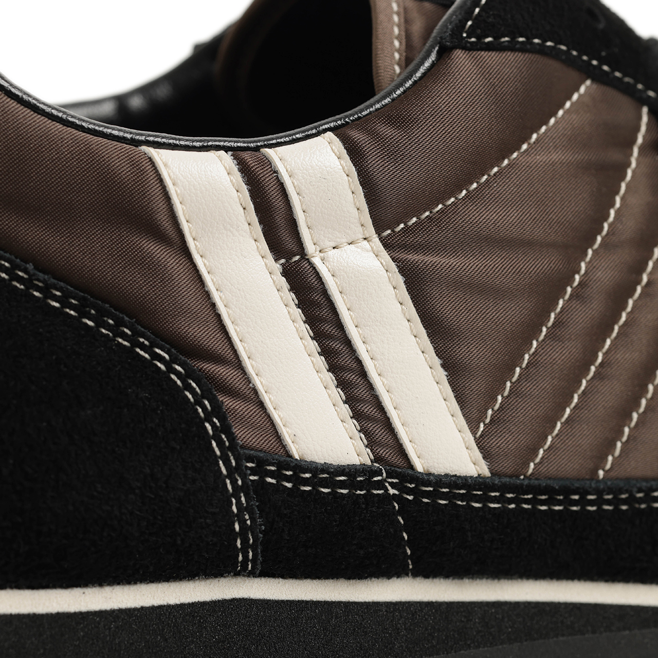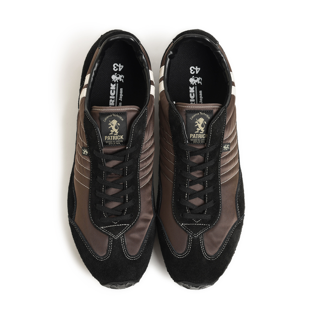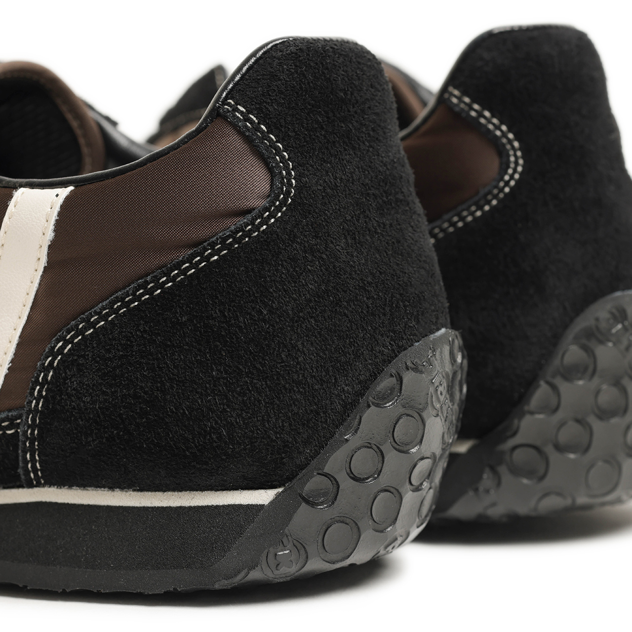 チャコールグレーのナイロンとブラックのスエードを組み合わせた良く焼かれたステーキを思わせるカラーリング。
