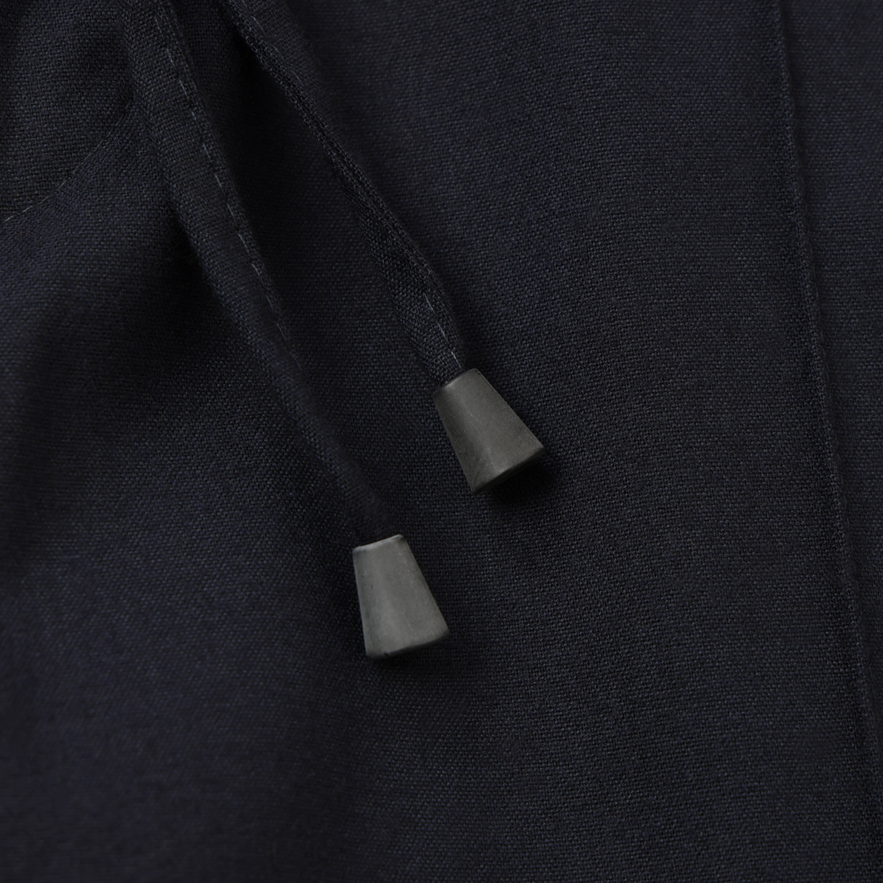 ウエスト部分のドローコード、サイドに施されたシャーリングがコンフォートな穿き心地を実現しつつも、一方で細身ですっきりと見えるシルエット。
