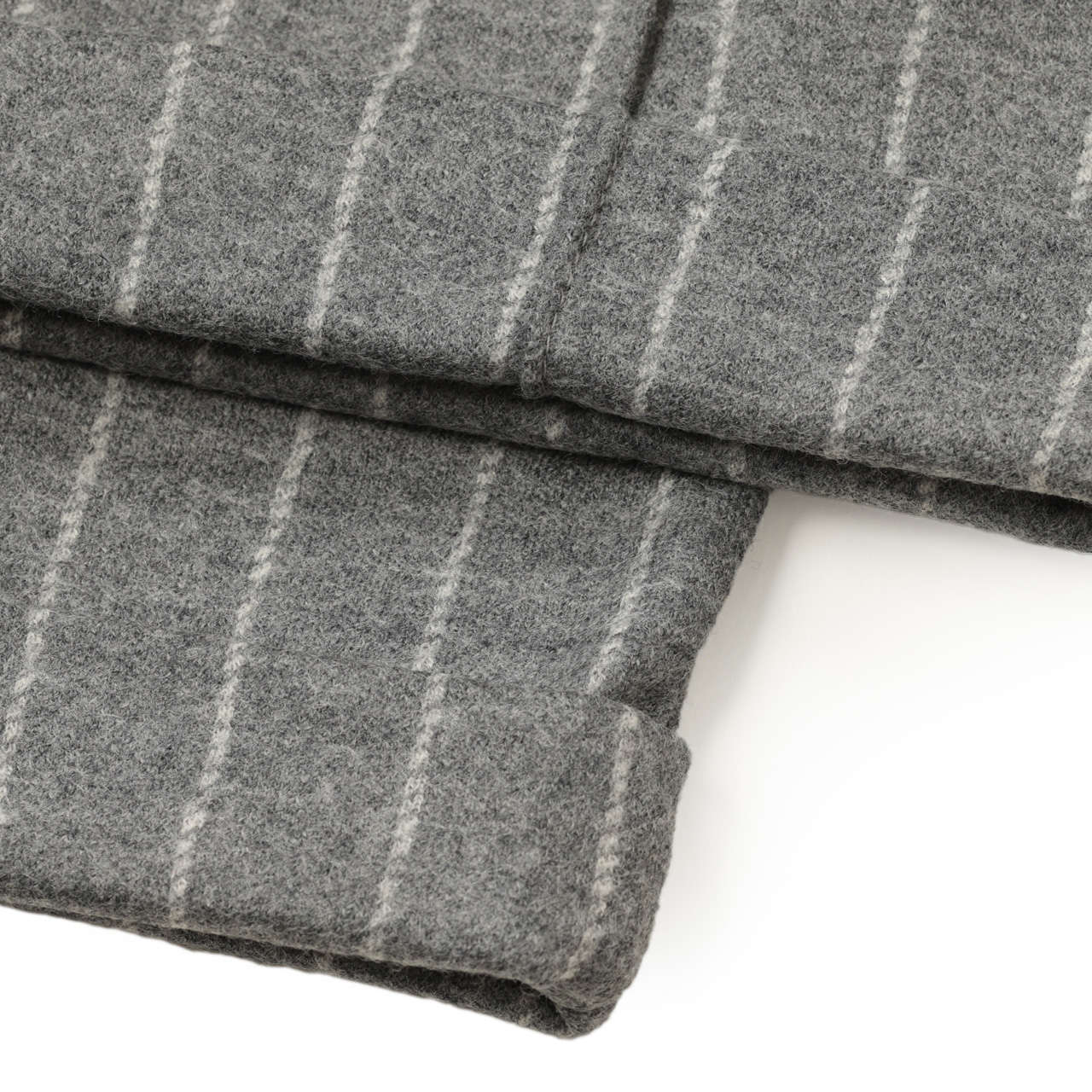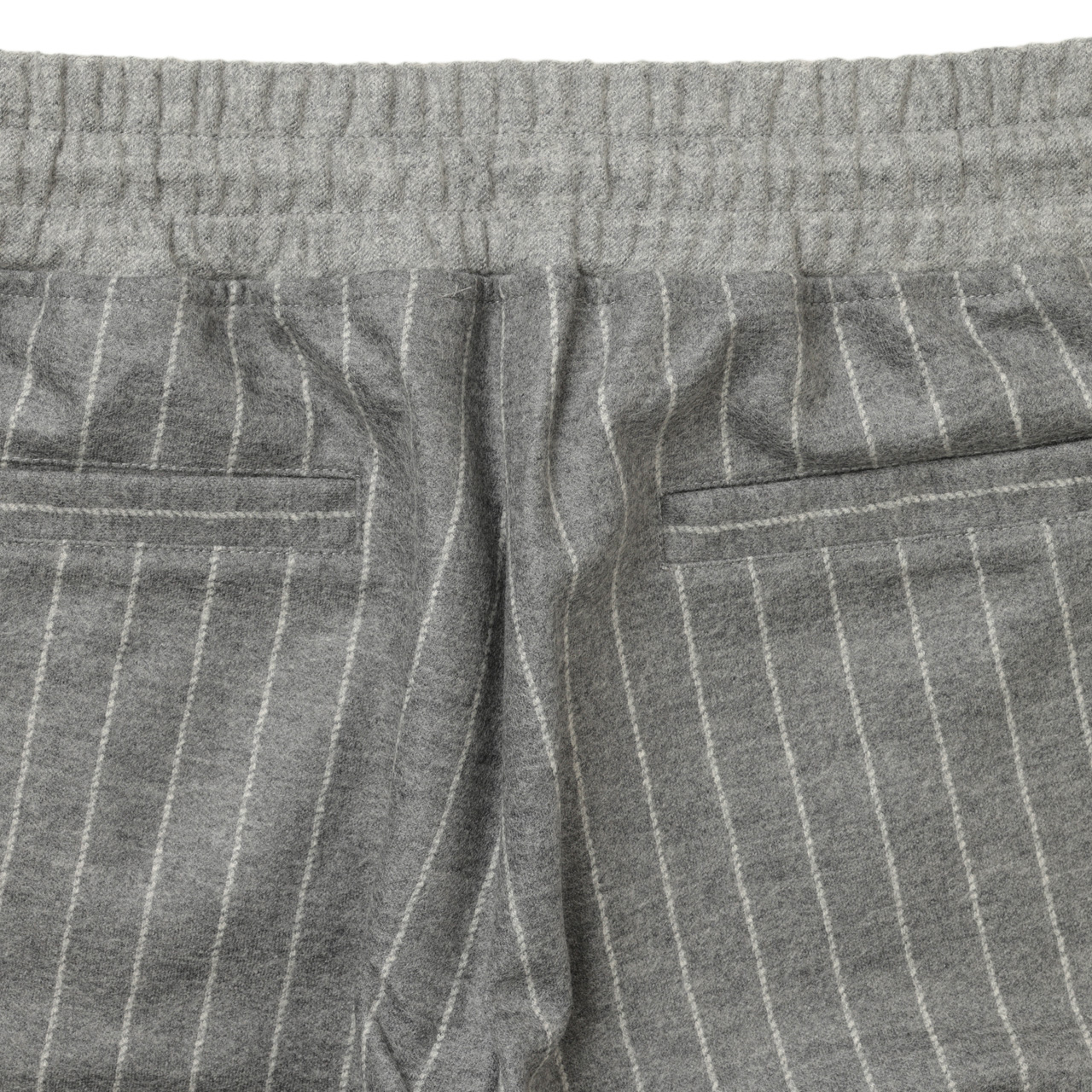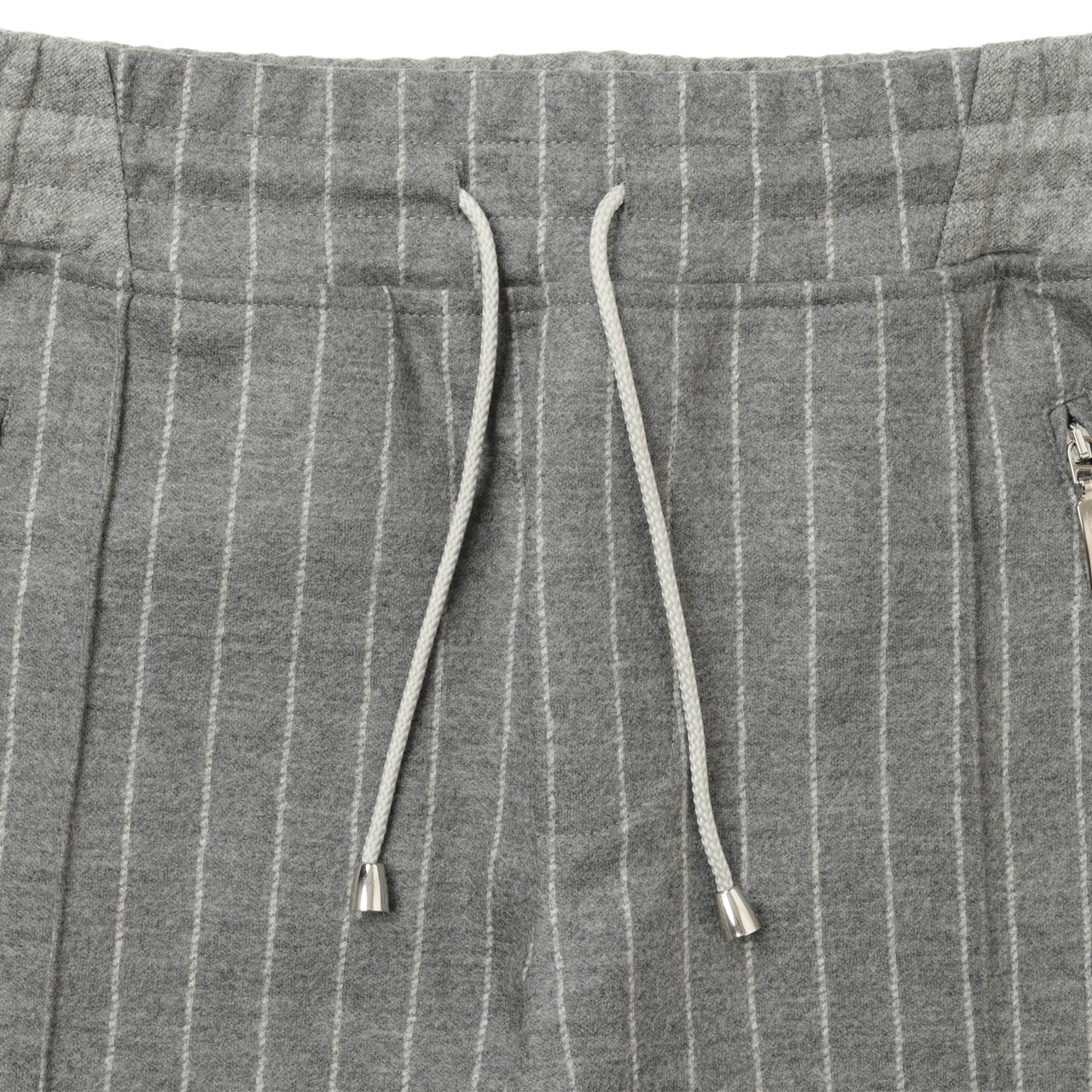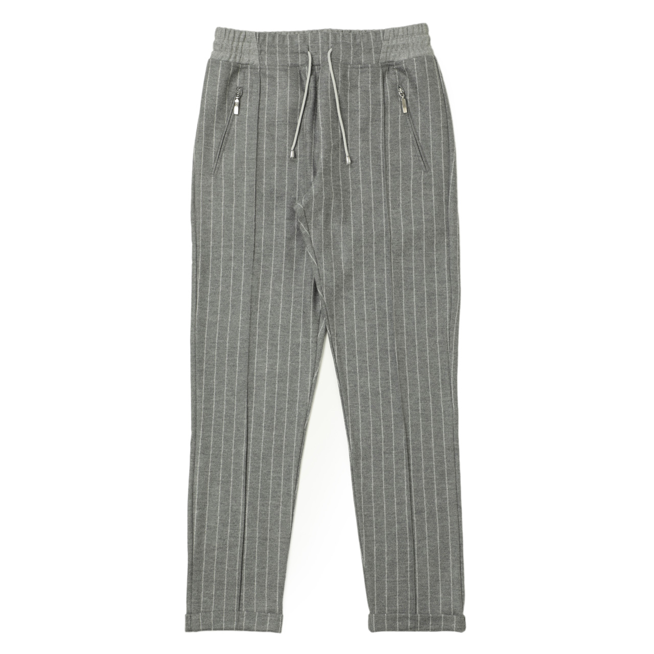 この手の生地では珍しいチョークストライプ柄を採用することでジャージ素材でありながら、裾のダブルの仕上げも相まってクラシカルな雰囲気も纏っています。