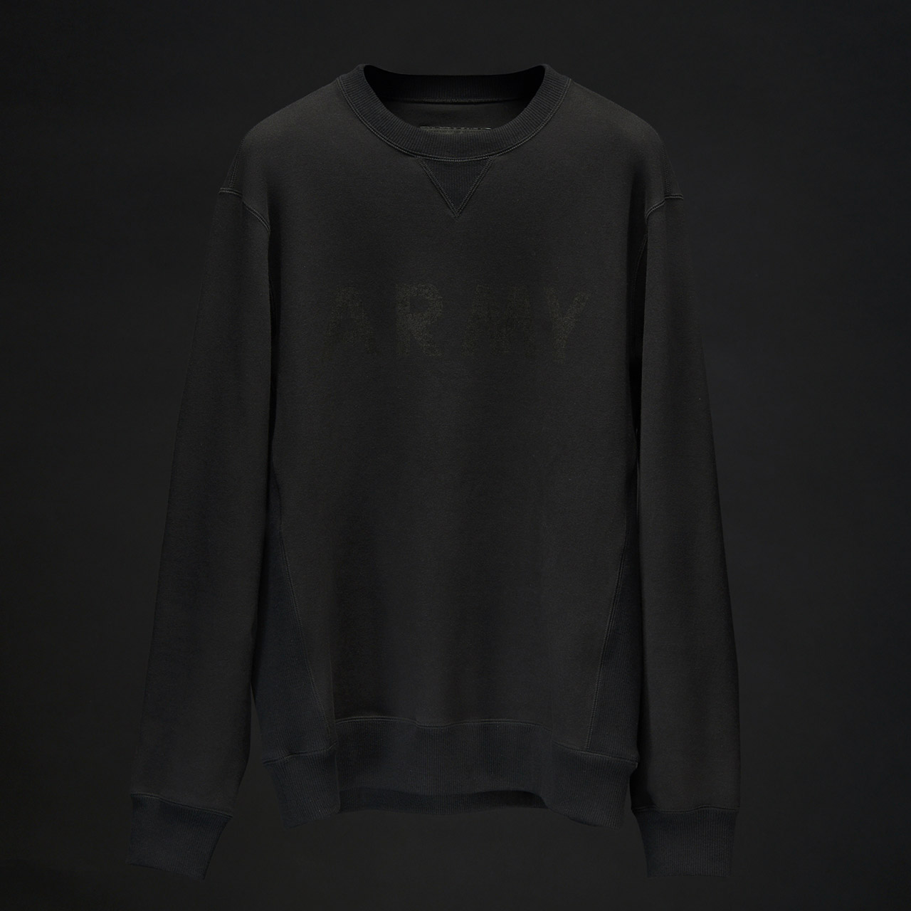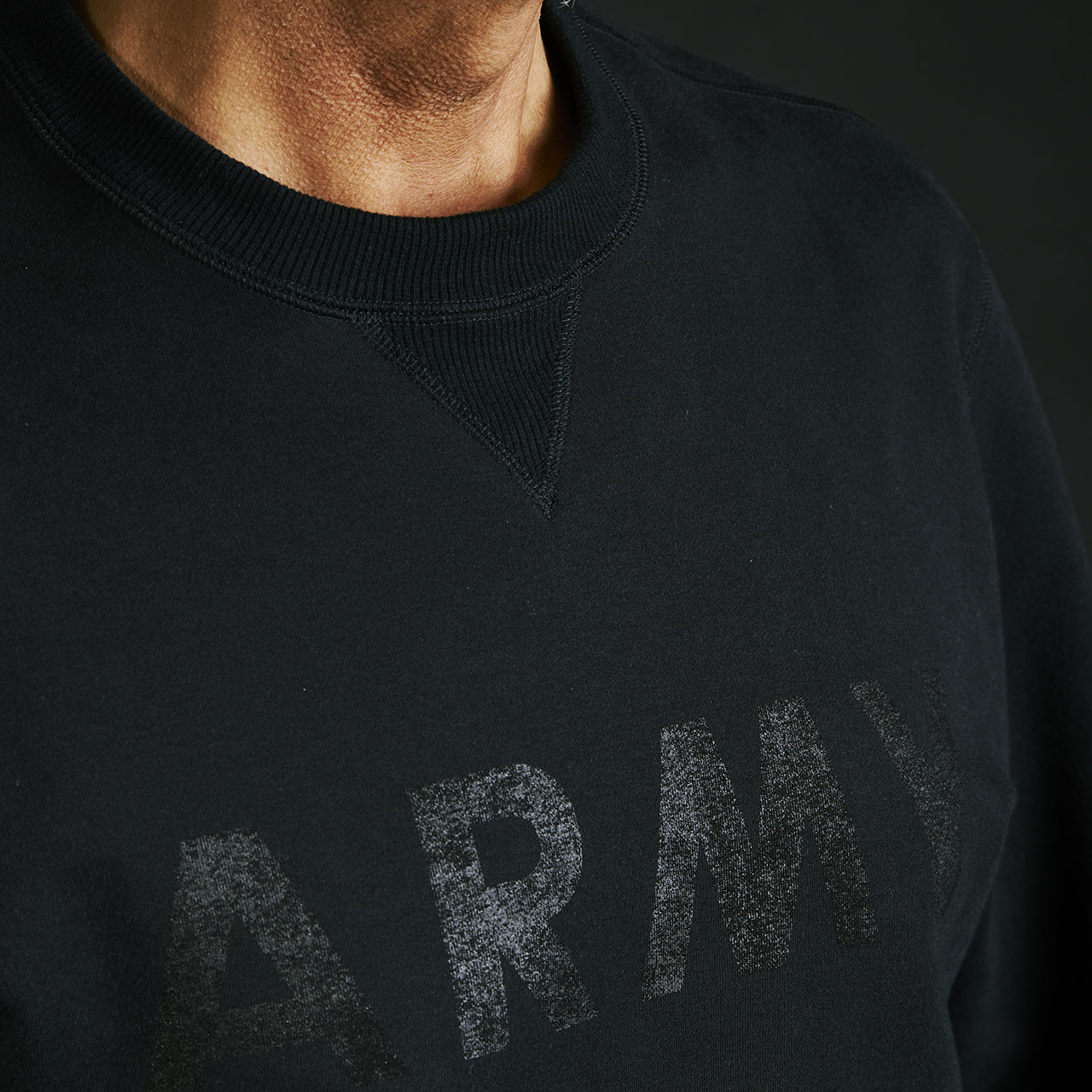 U.S. ARMYのスウェットは杢グレーに黒字で“ARMY”とプリントされたデザインが象徴的。1990年代以降はポリエステル混の裏起毛ボディが主流となり、SoffeやRussell Athleticが製造を担当しました。
