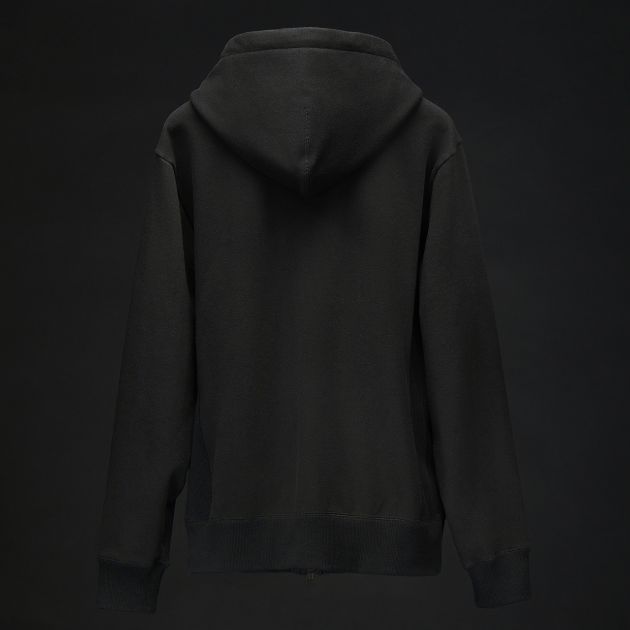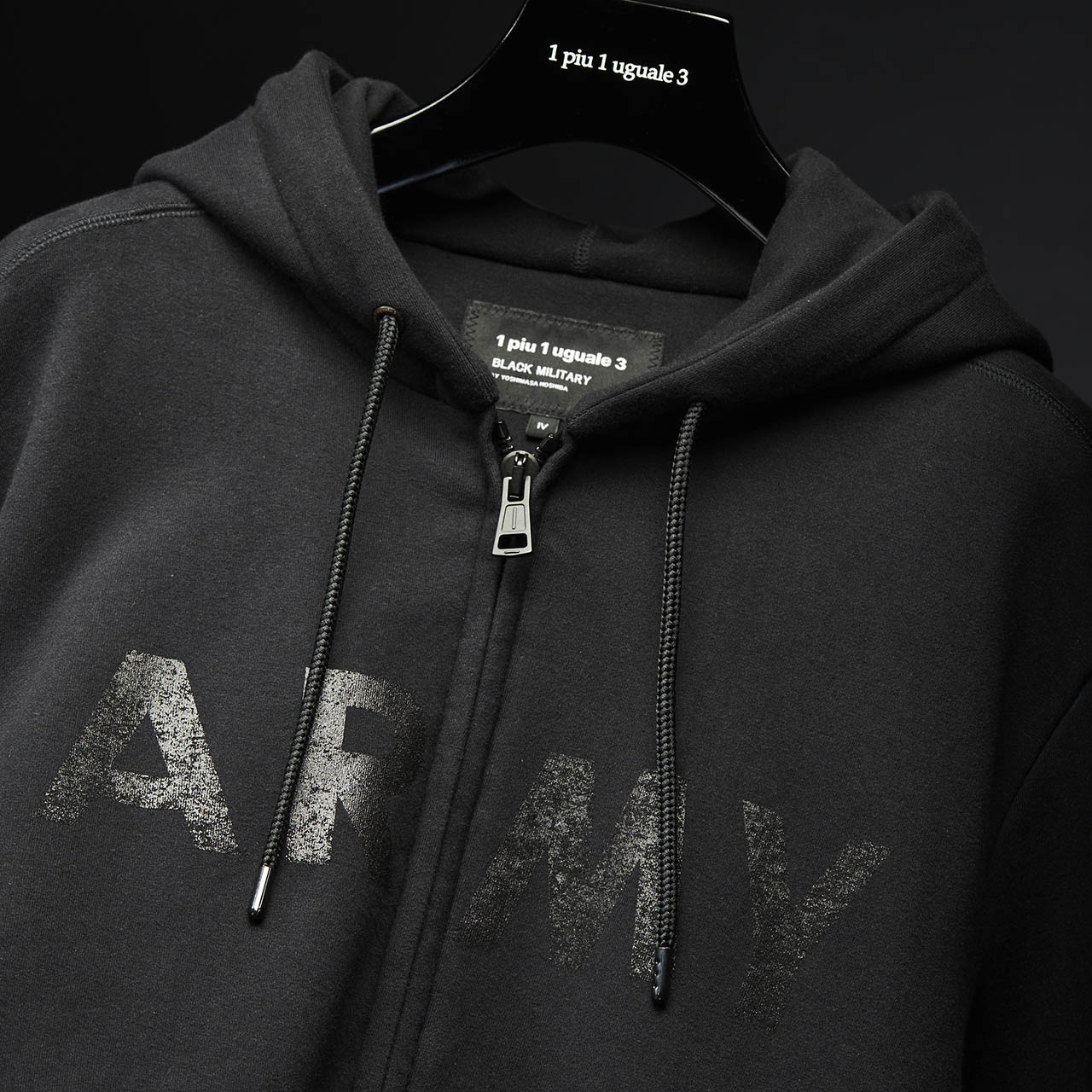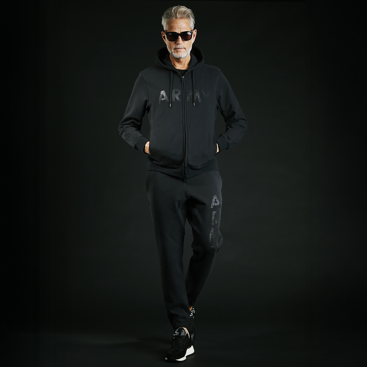 軍物とは思えない上質な風合いに仕上げています。今回は黒地に黒プリントで統一し、ZIPパーカー・R-NECKスウェット・ジャージパンツの3型を展開。