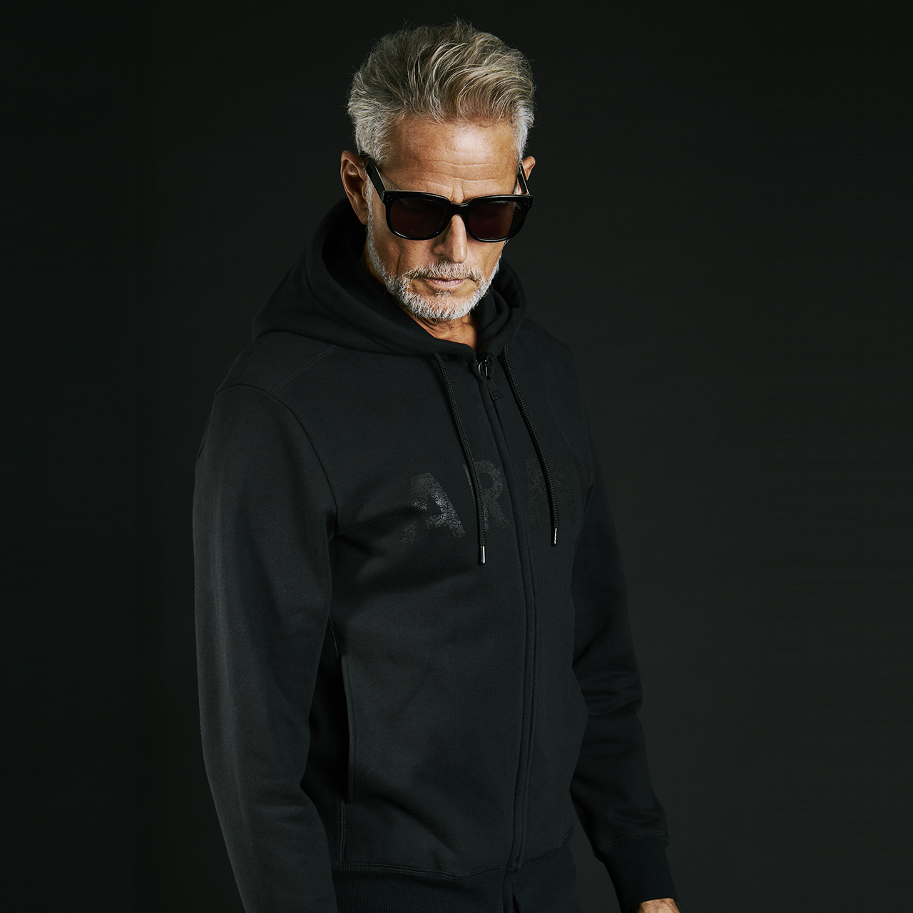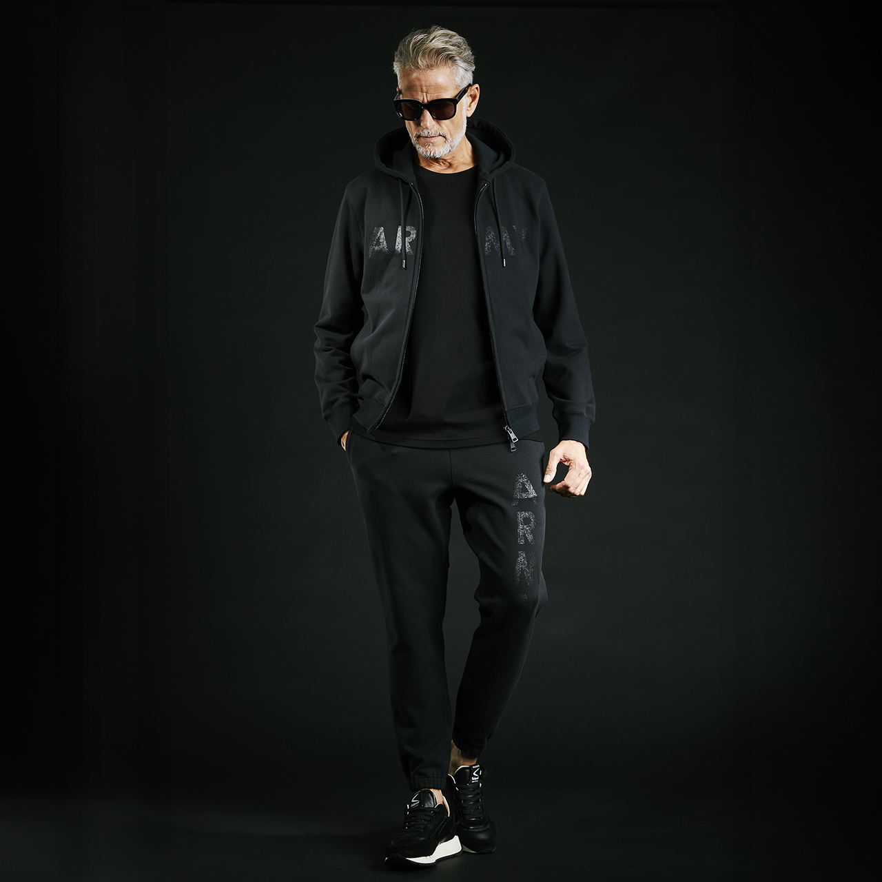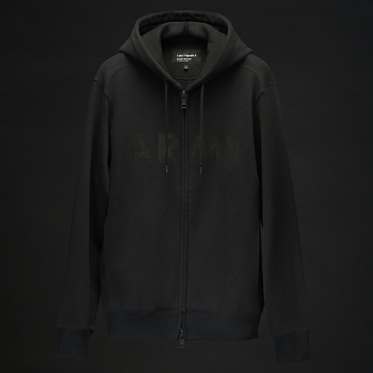 軍物とは思えない上質な風合いに仕上げています。今回は黒地に黒プリントで統一し、ZIPパーカー・R-NECKスウェット・ジャージパンツの3型を展開。