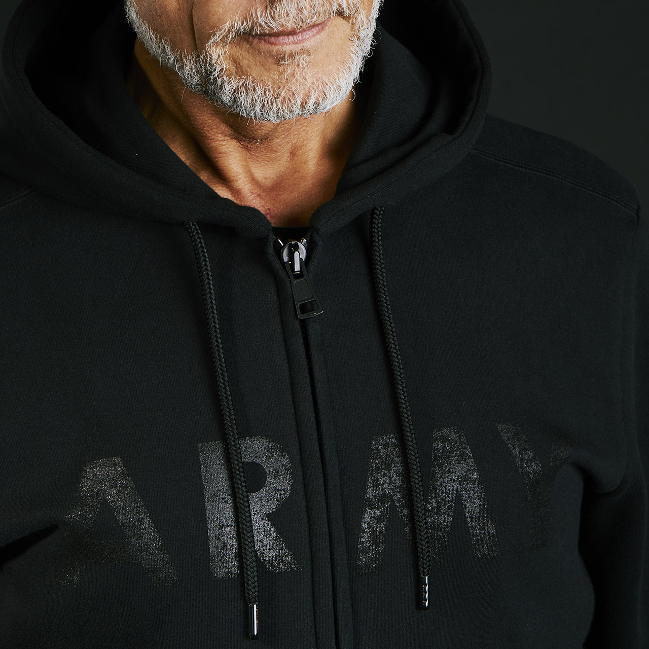U.S. ARMYのスウェットは杢グレーに黒字で“ARMY”とプリントされたデザインが象徴的。1990年代以降はポリエステル混の裏起毛ボディが主流となり、SoffeやRussell Athleticが製造を担当しました。