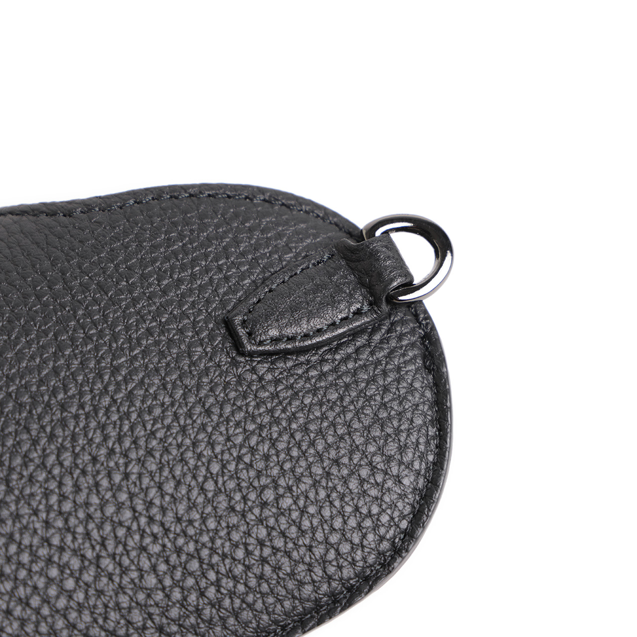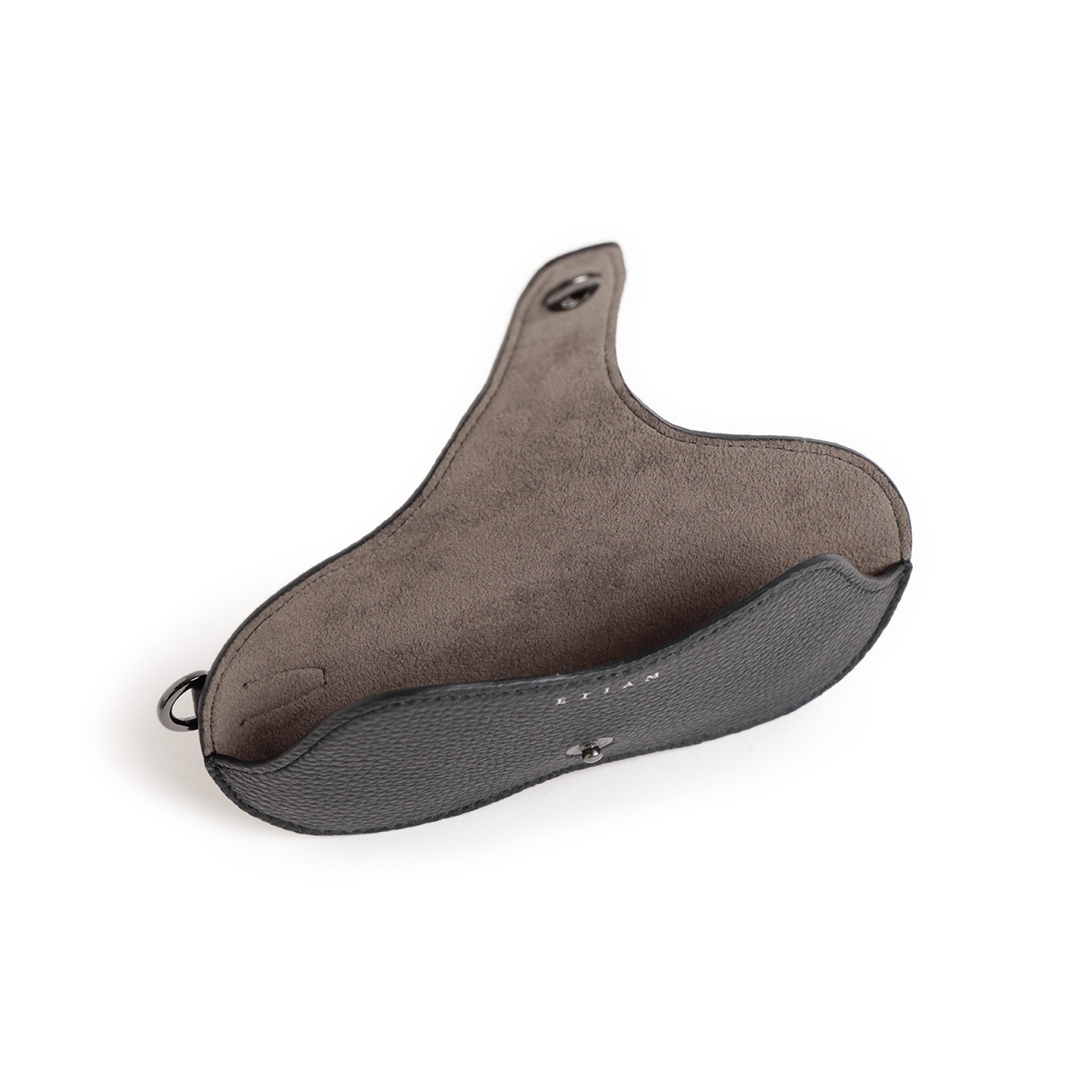 前面は、流線形で立体的なパターンにすることで、厚みのあるサングラスも収納でき、背面からベルト先端までのキレイな一枚仕立てや、高級感あふれる真鍮製のオリジナルホックをあしらっているのも個性的です。
