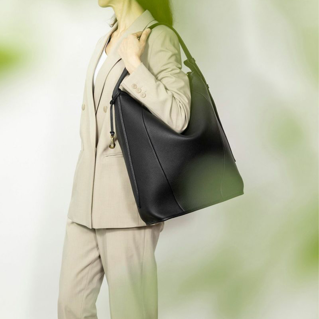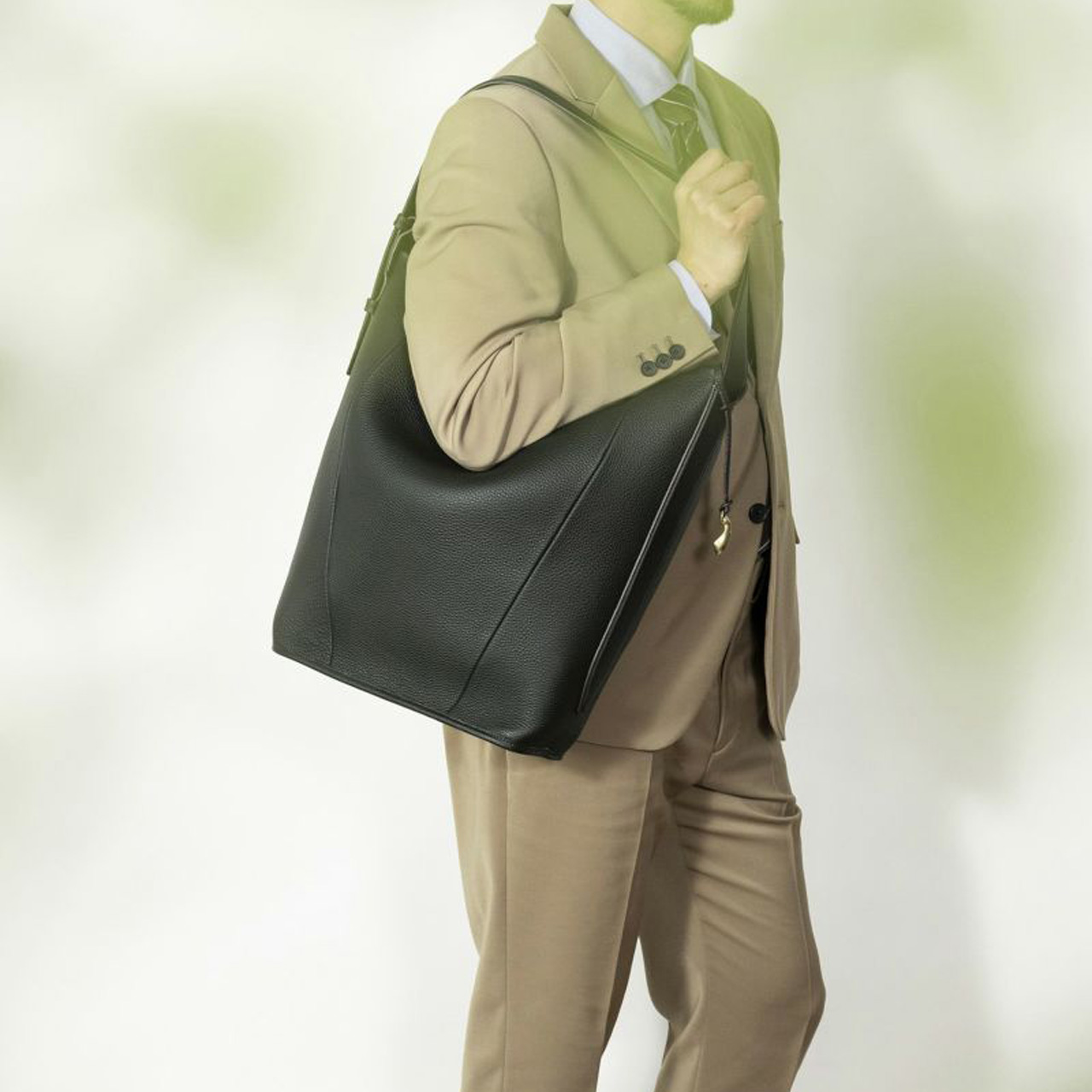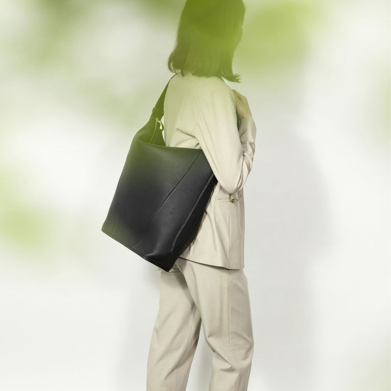 シンプルなデザインを追求することに焦点を合わせ、ハンドルを1本にした軽快さと、体に寄り添う快適さを併せ持たせた、美しいシルエットの縦型ホーボーバッグ。