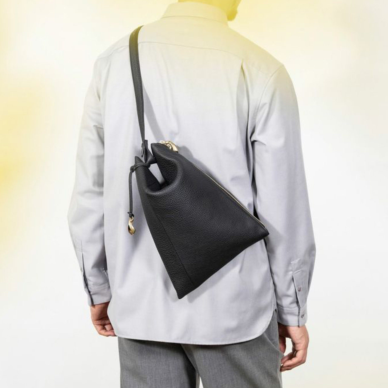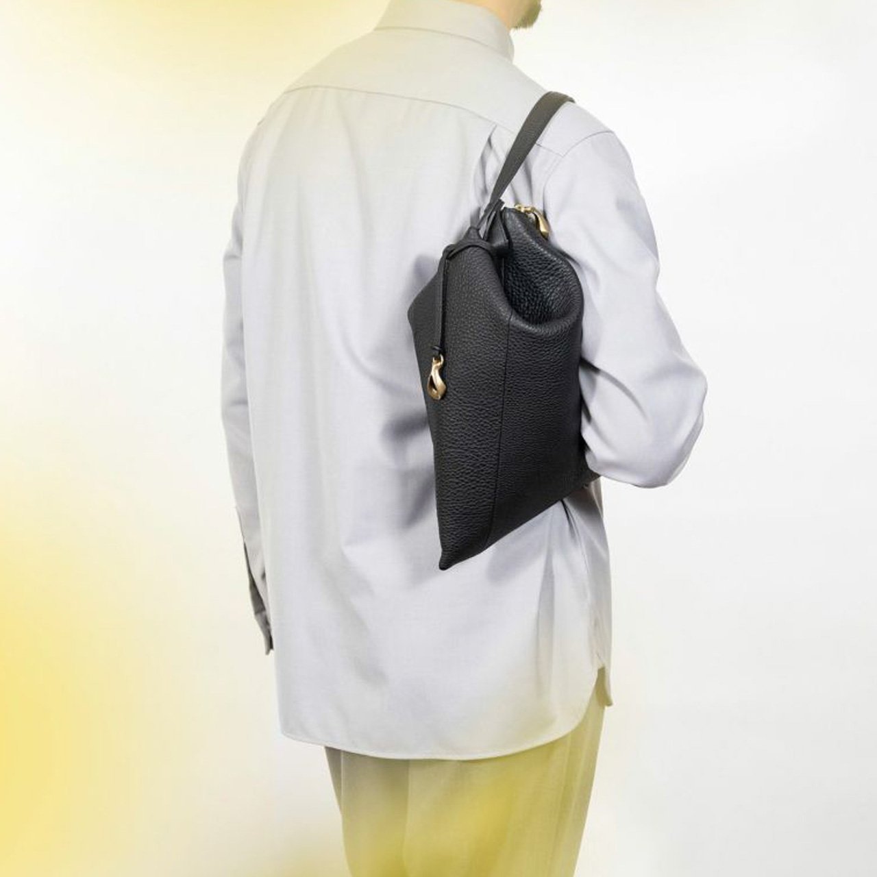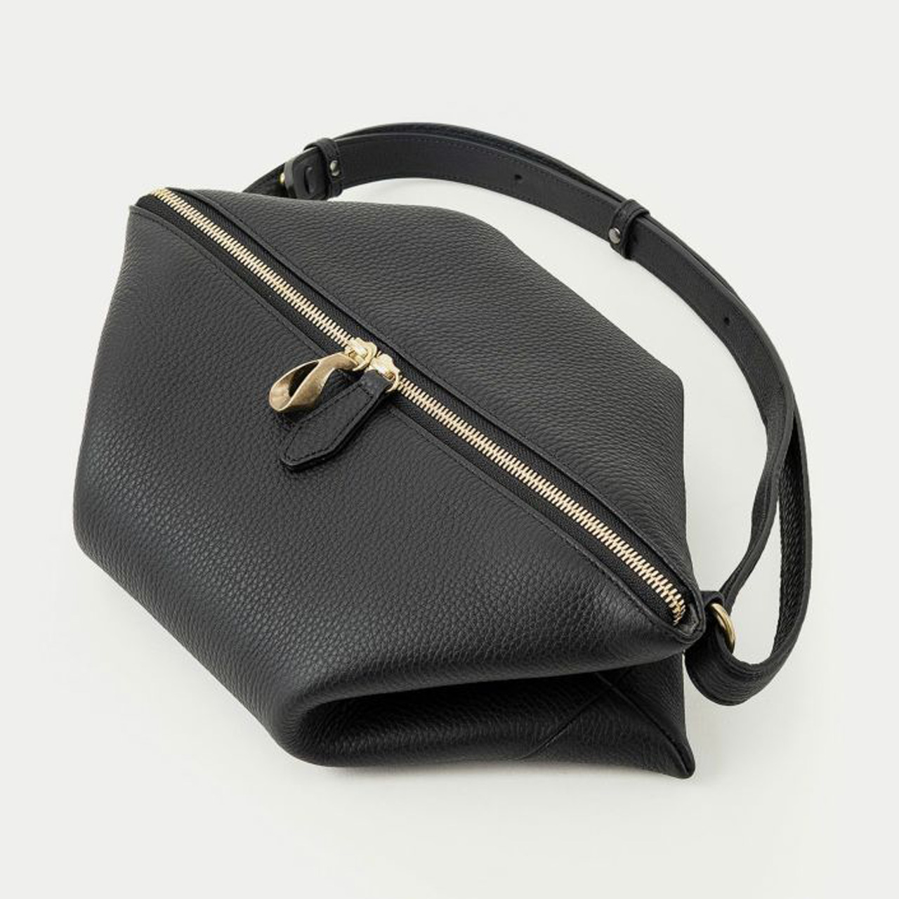 ボディとショルダーベルトの接続用に開発したオリジナル金具が、たわみが美しい巾着のような独特のシルエットを生み、トライアングルを想わせる端正なラインを描き出しています。