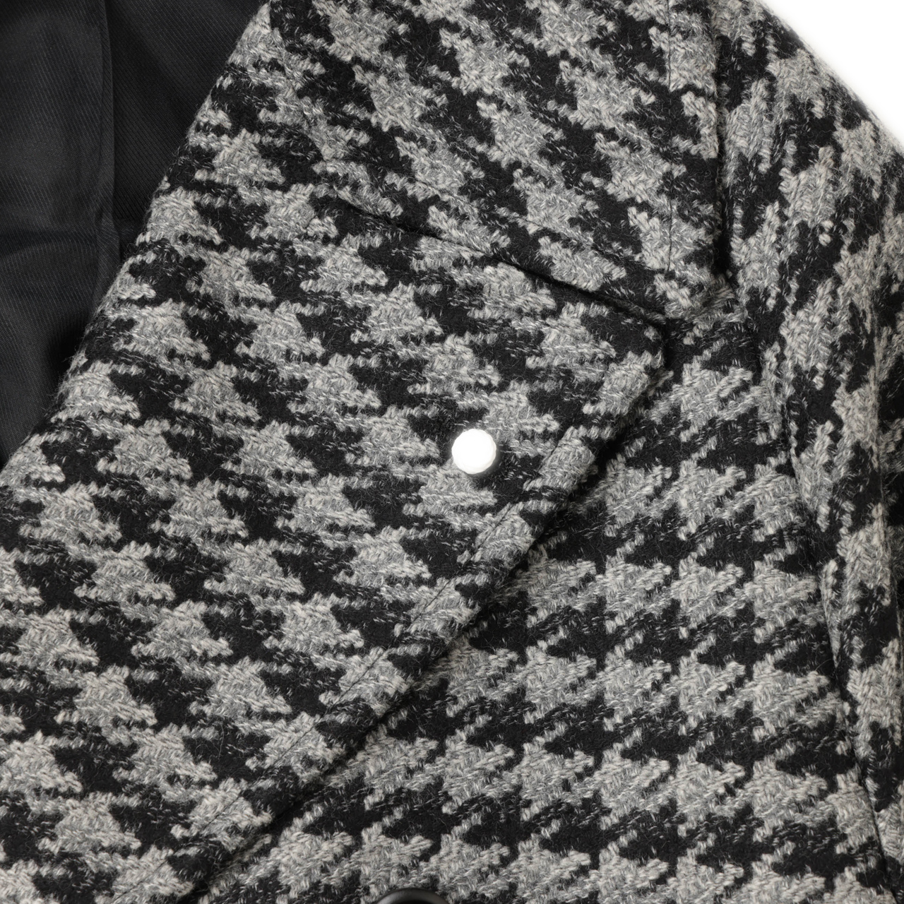 こちらの一着はウール×カシミヤの生地を使用。しっとりとして柔らかな質感の糸を大ぶりな千鳥柄で織り上げ、抜群の存在感を見せてつけています。ディテールに目をやると、ラペルもかなりの幅で仕上げてあり柄に負けない存在感をプラス。